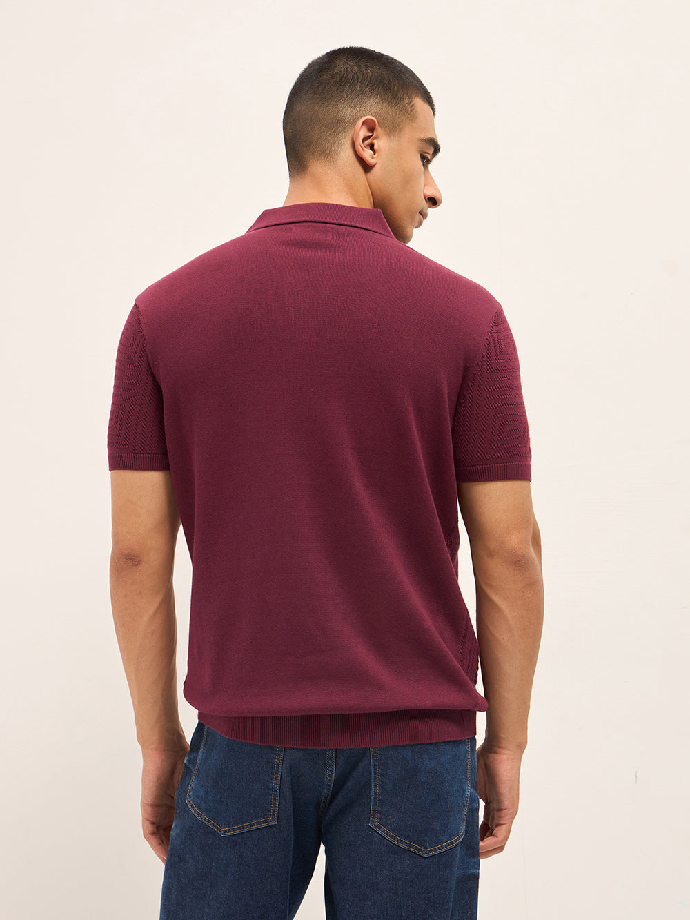 Maroon Slim Fit Polo with Geometric Perforated Texture Design