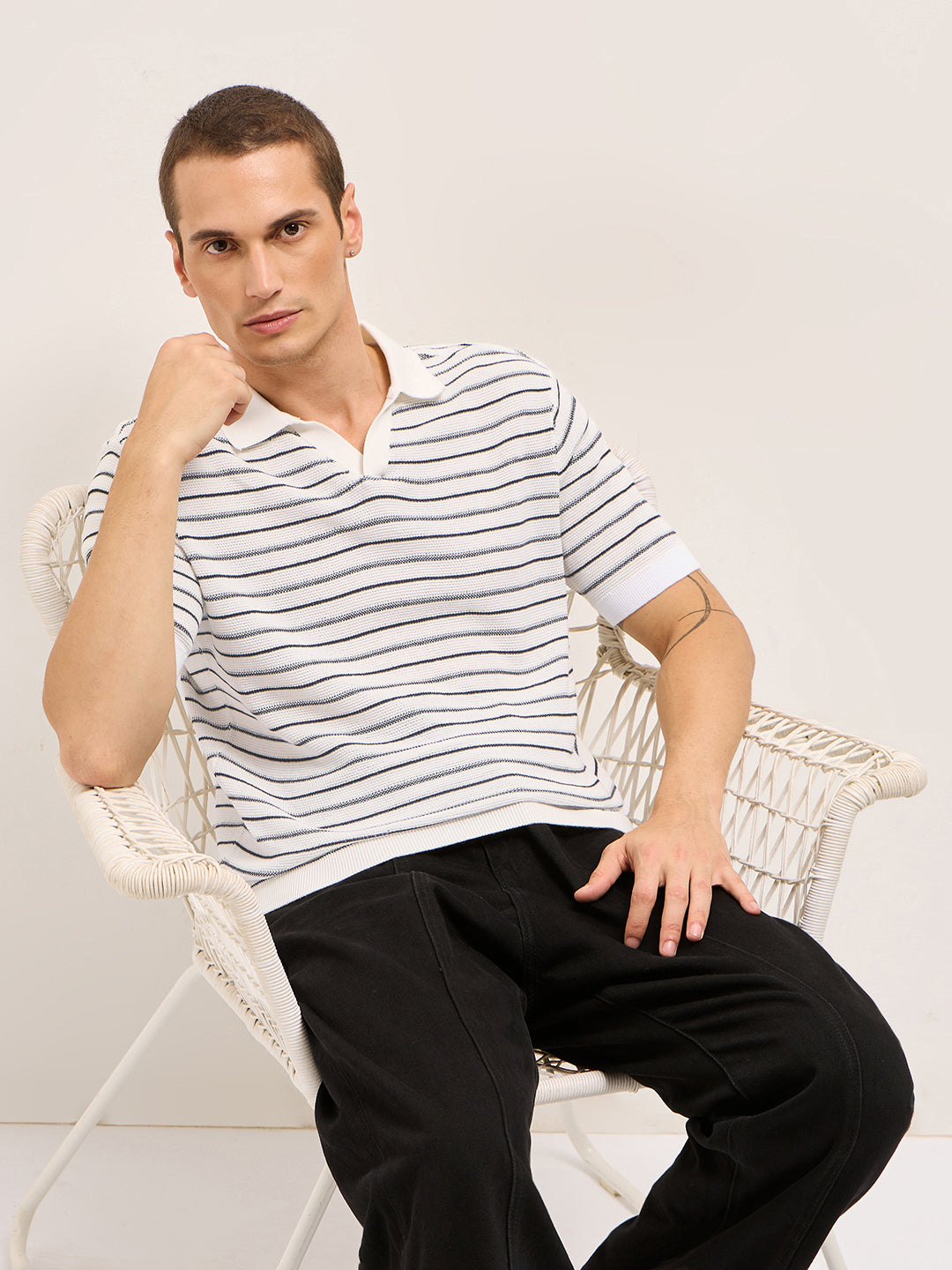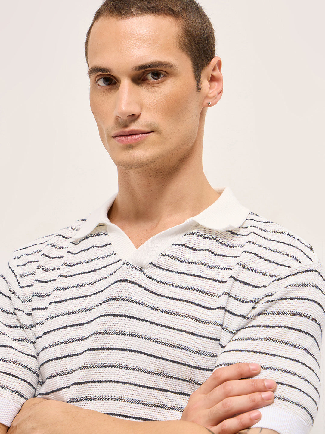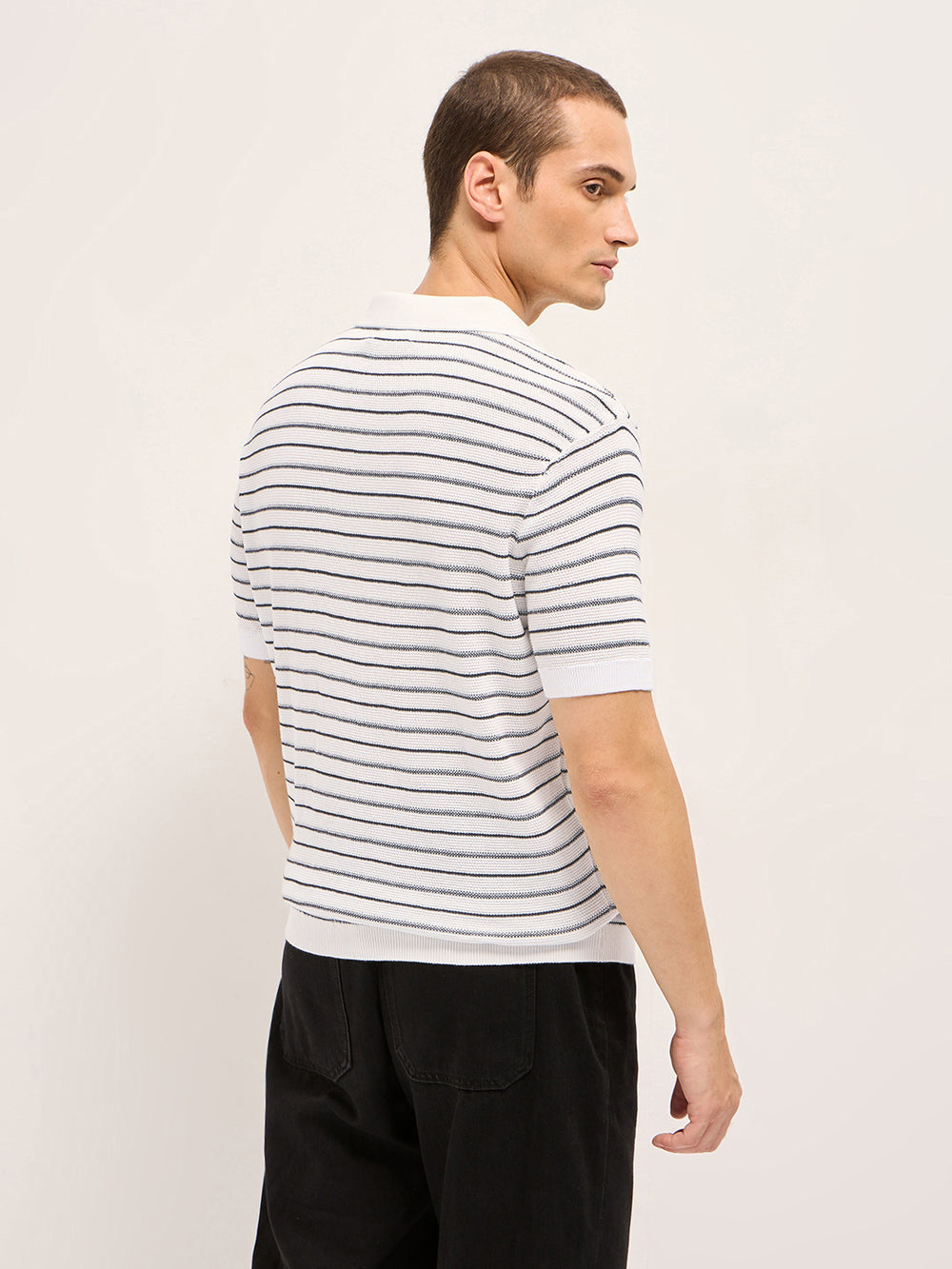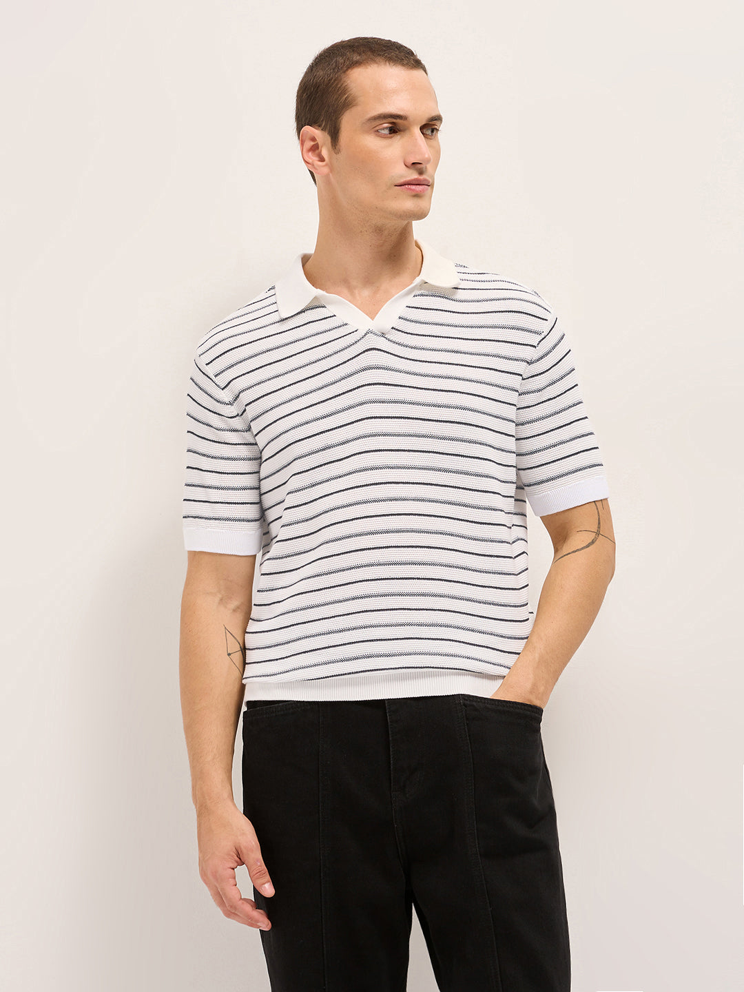 - Neck: Solid Polo neck with open V-neck placket