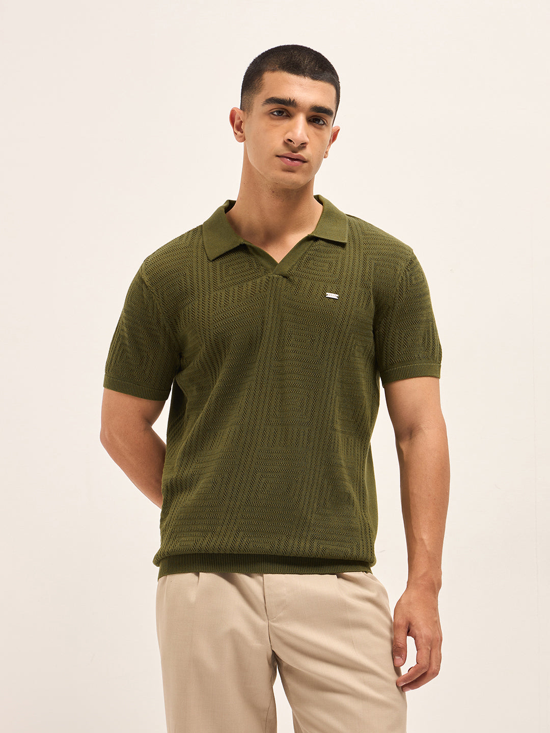 Olive Slim Fit Polo with Geometric Perforated Texture Design