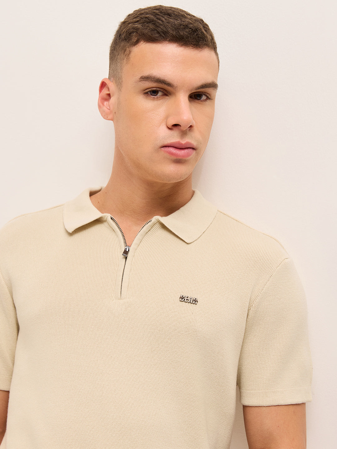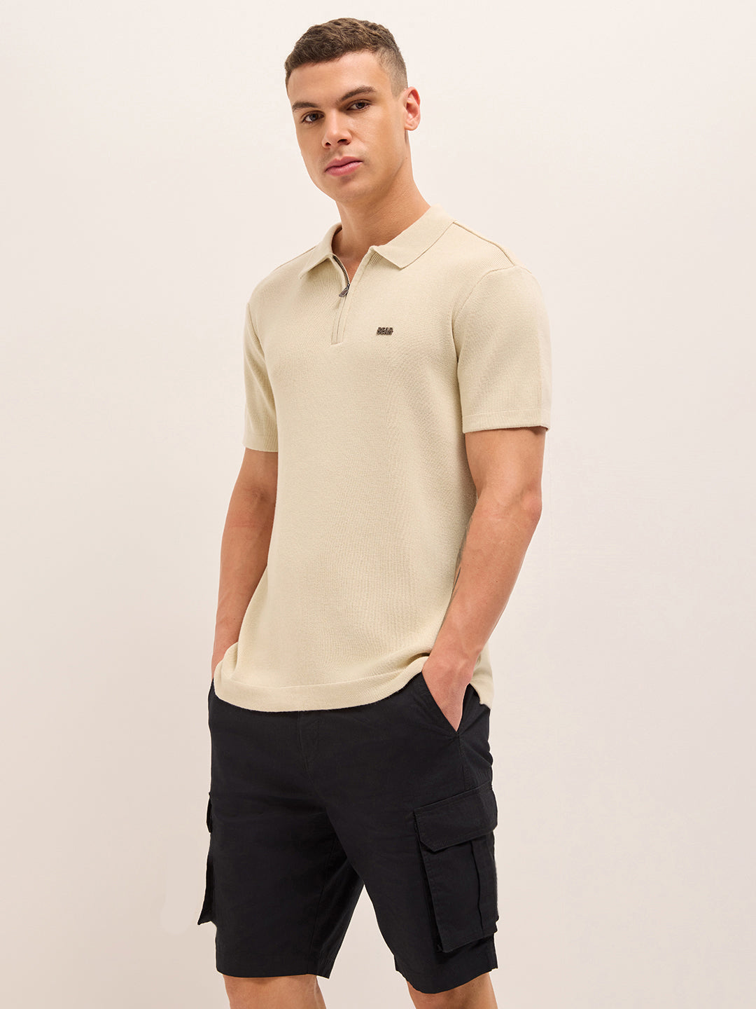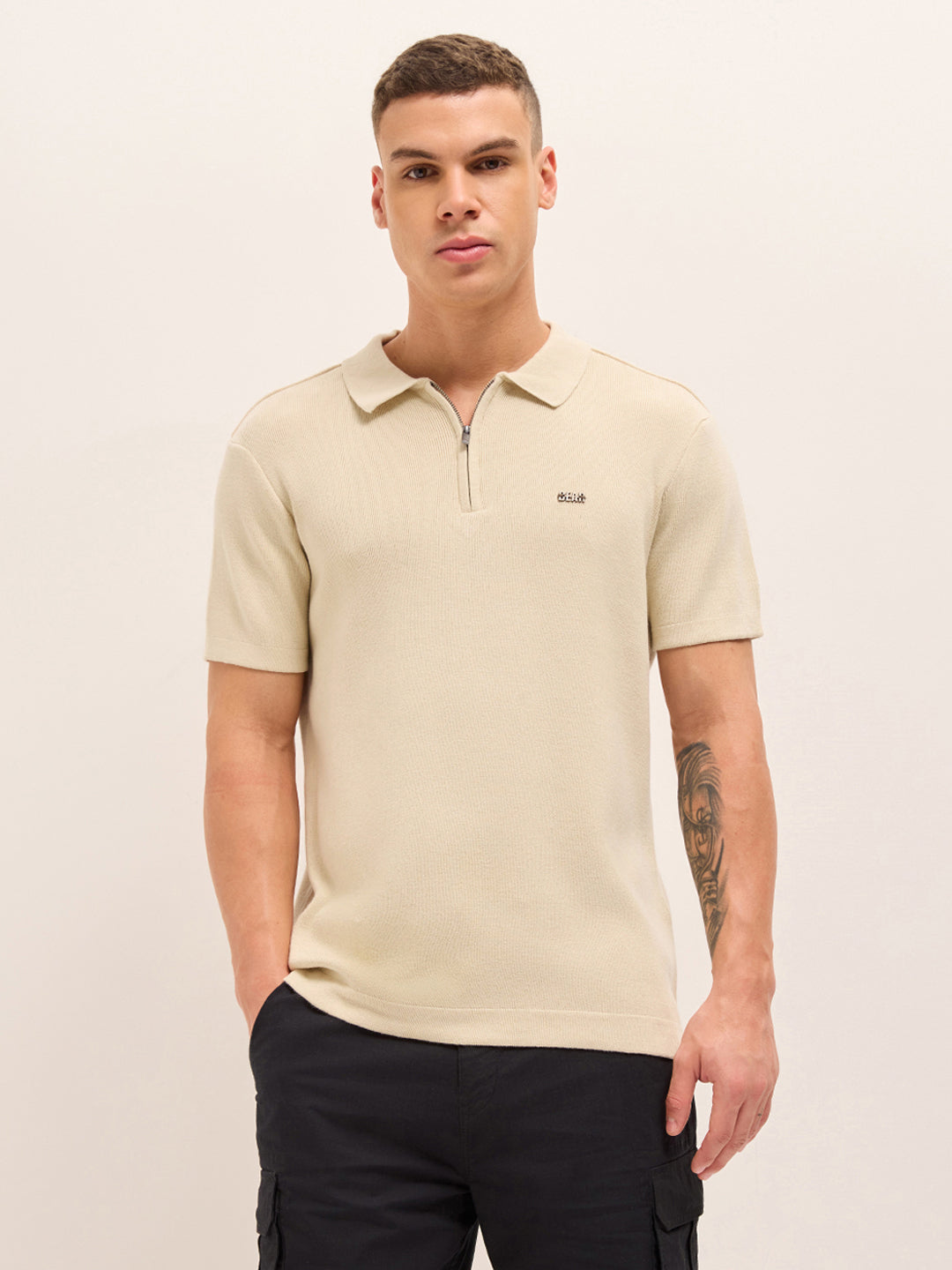 Shop Beige Regular Fit Flat Knit Polo with Half-Zip Placket Online.