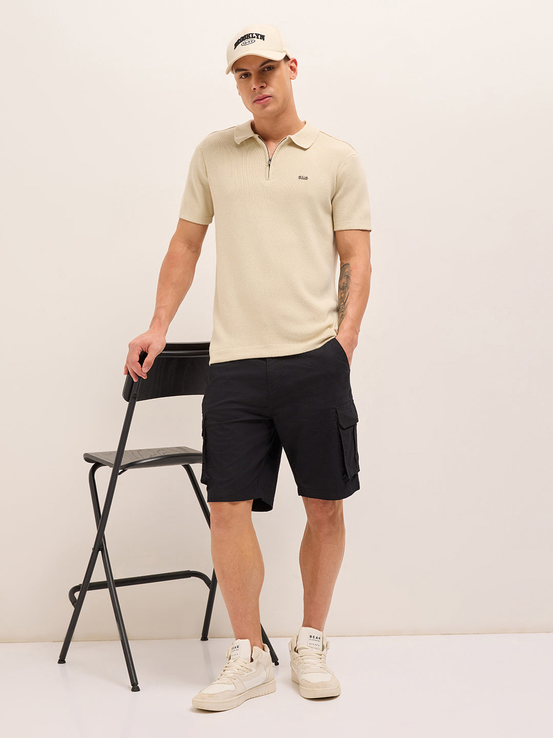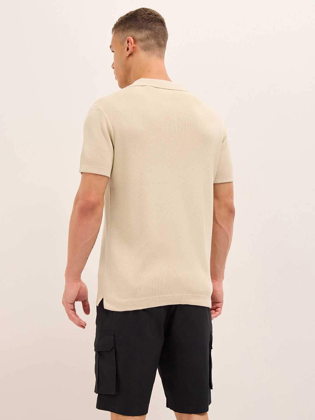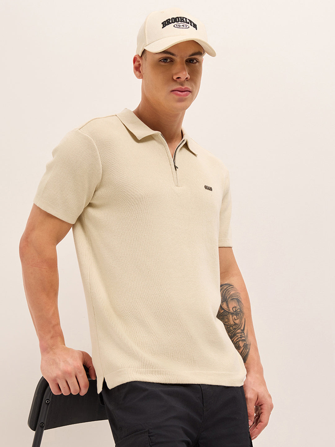 Shop Beige Regular Fit Flat Knit Polo with Half-Zip Placket Online.
