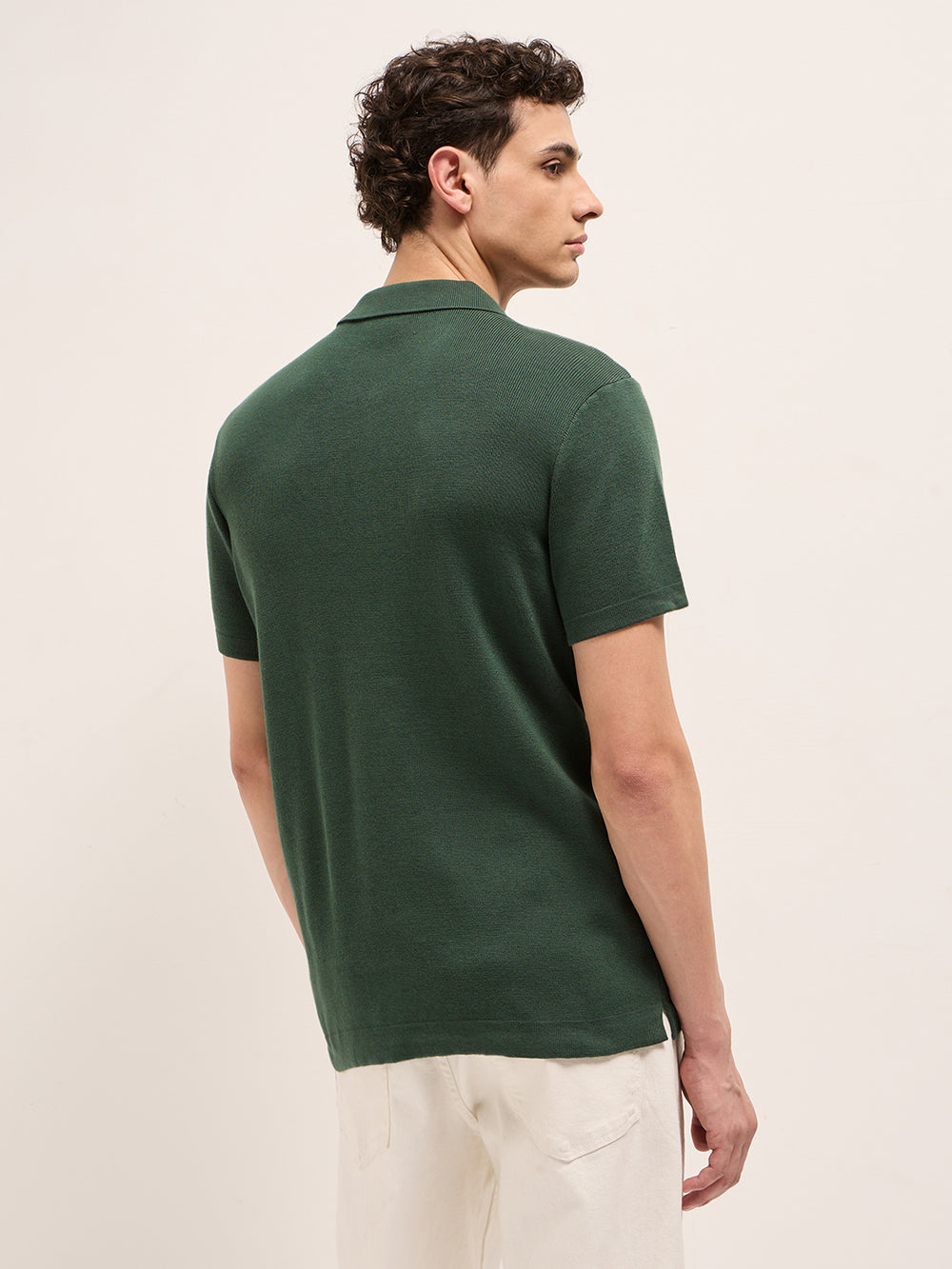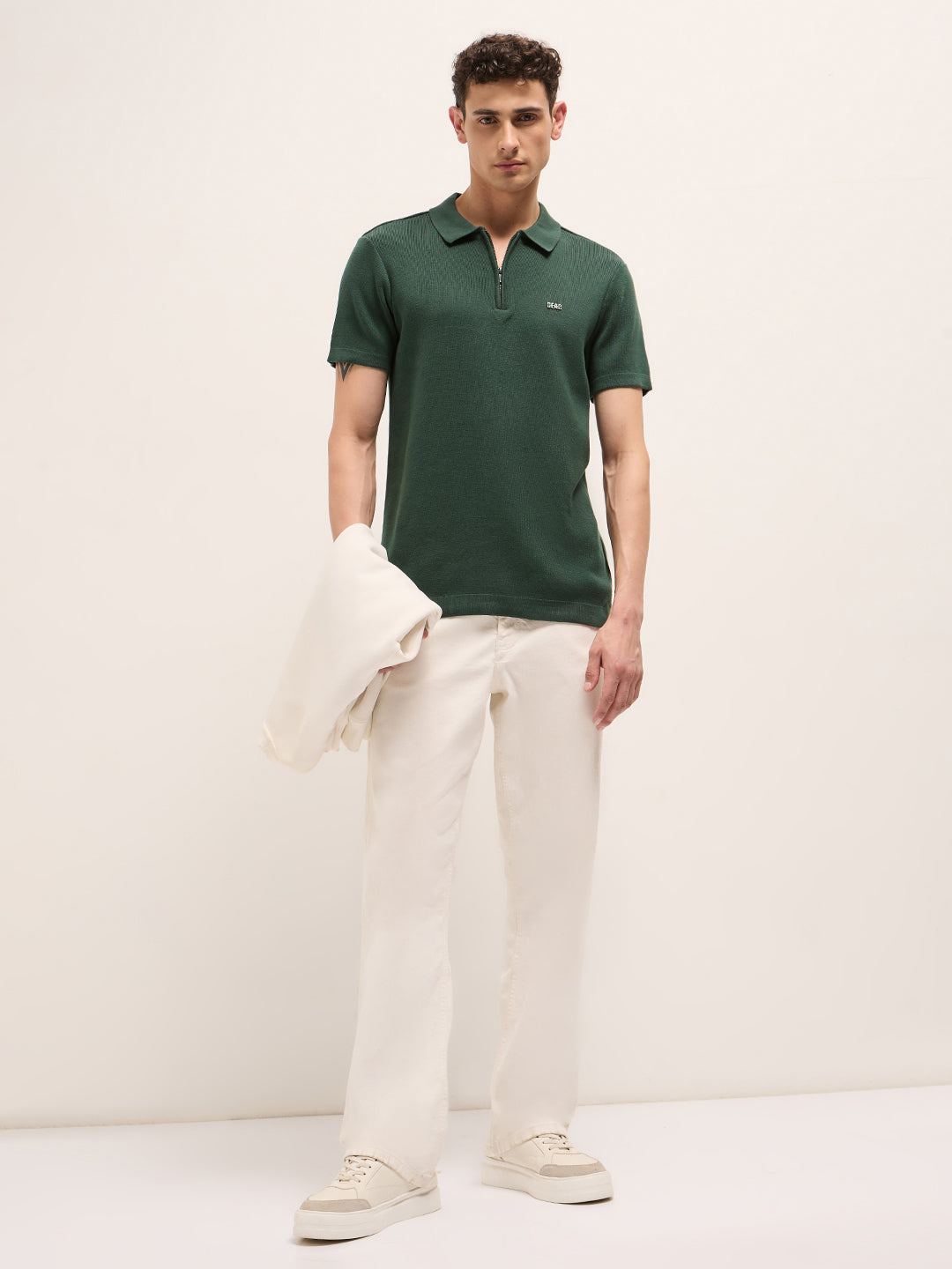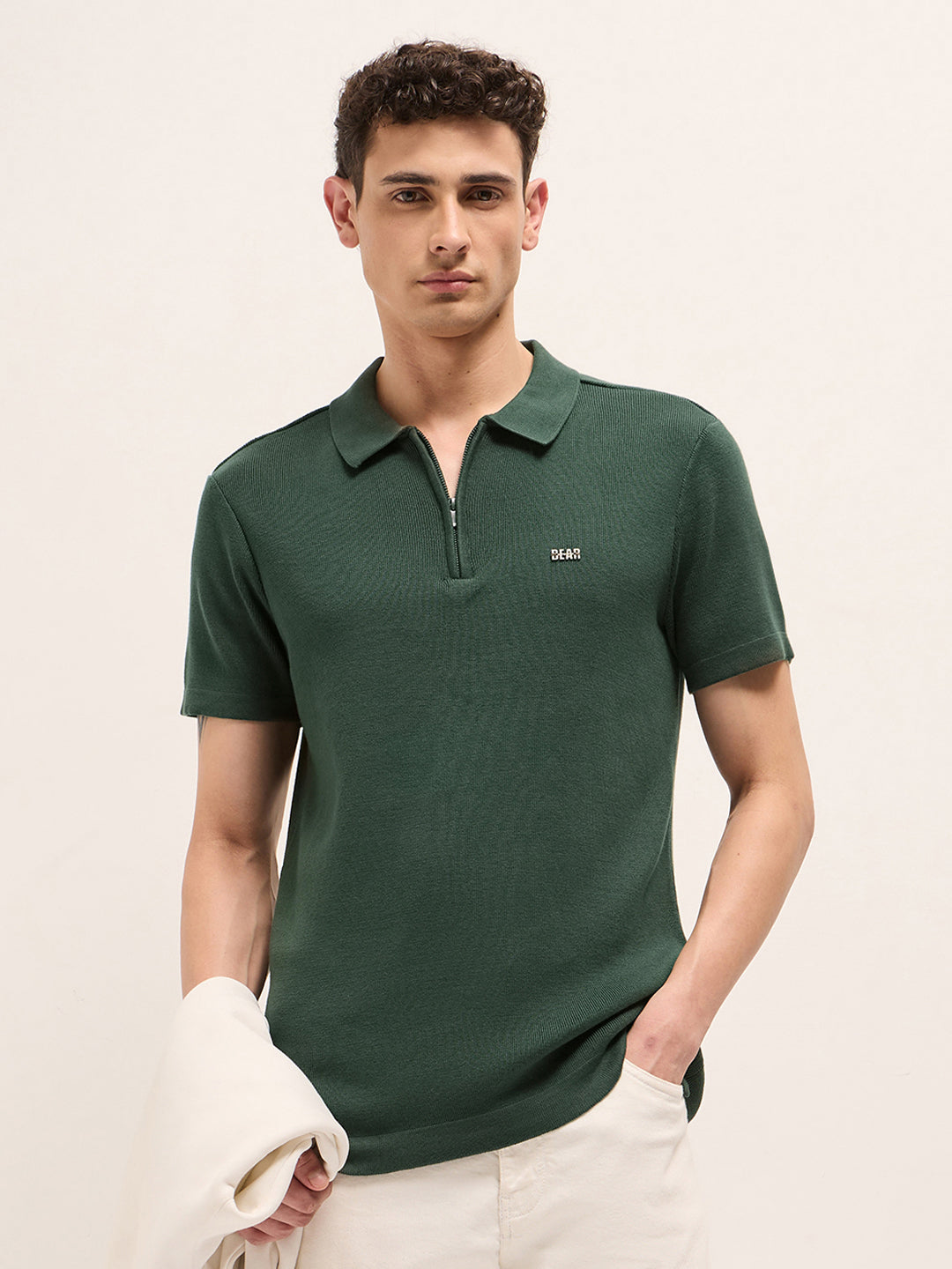 Shop Green Regular Fit Flat Knit Polo with Half-Zip Placket Online.