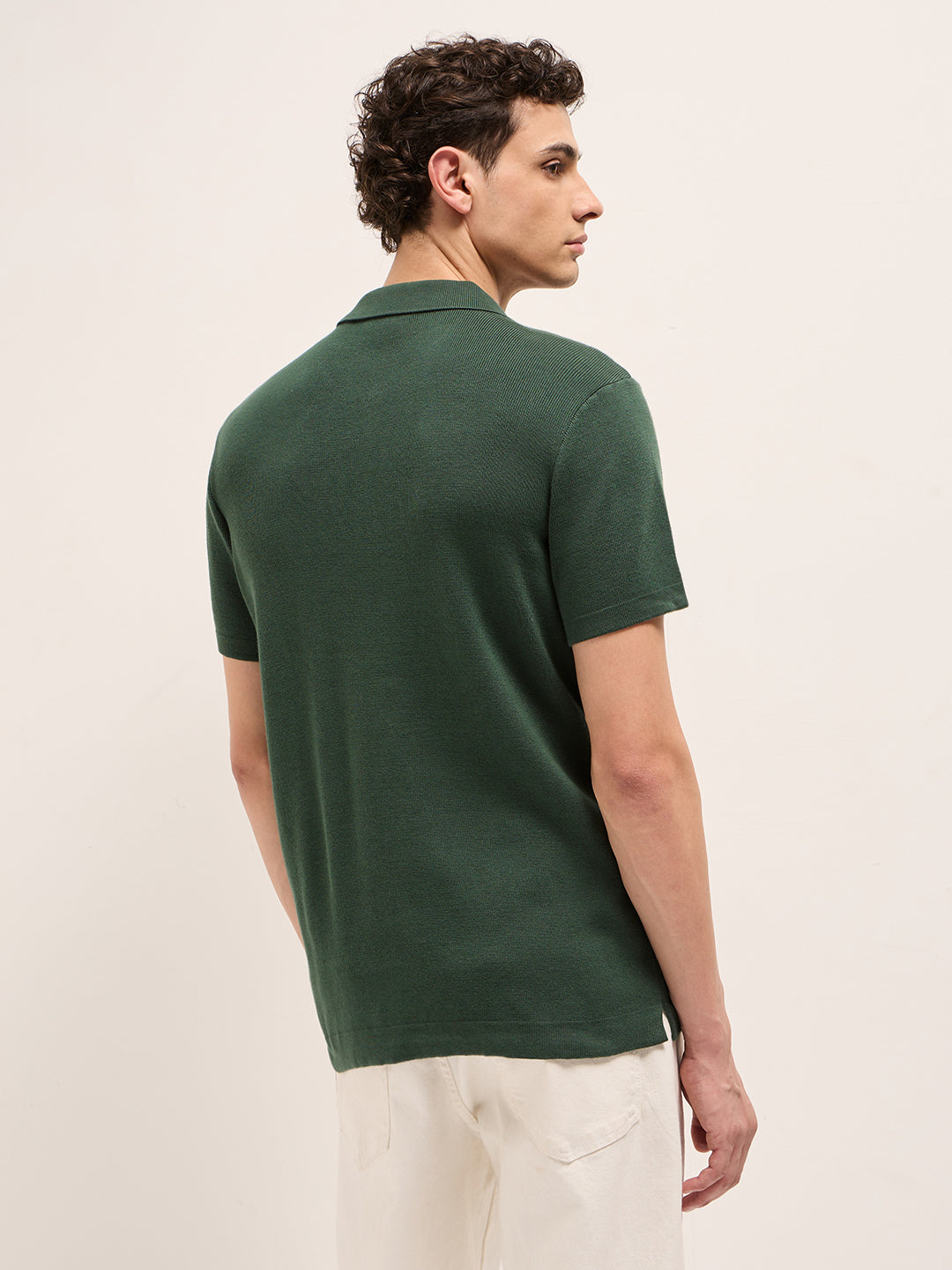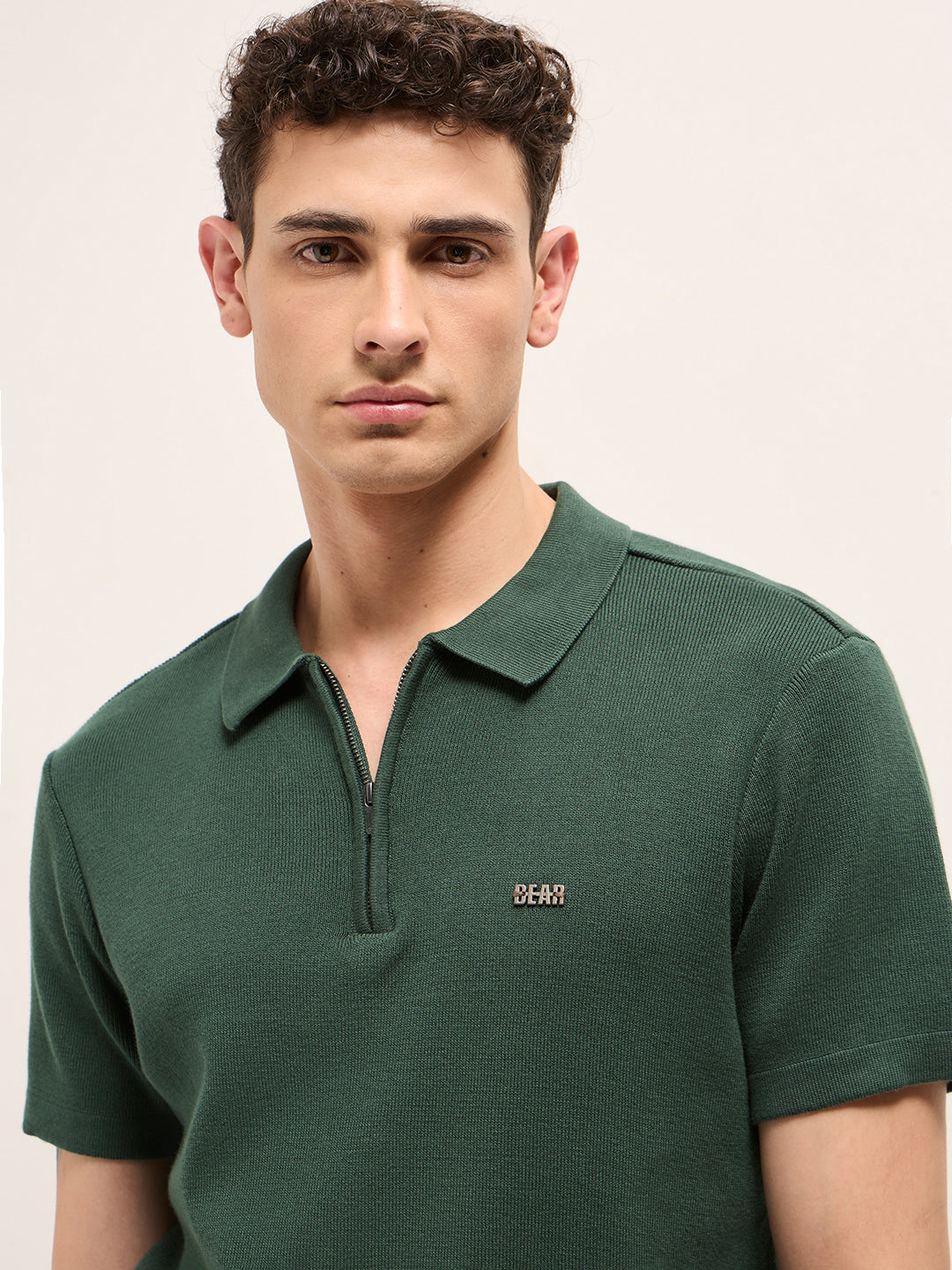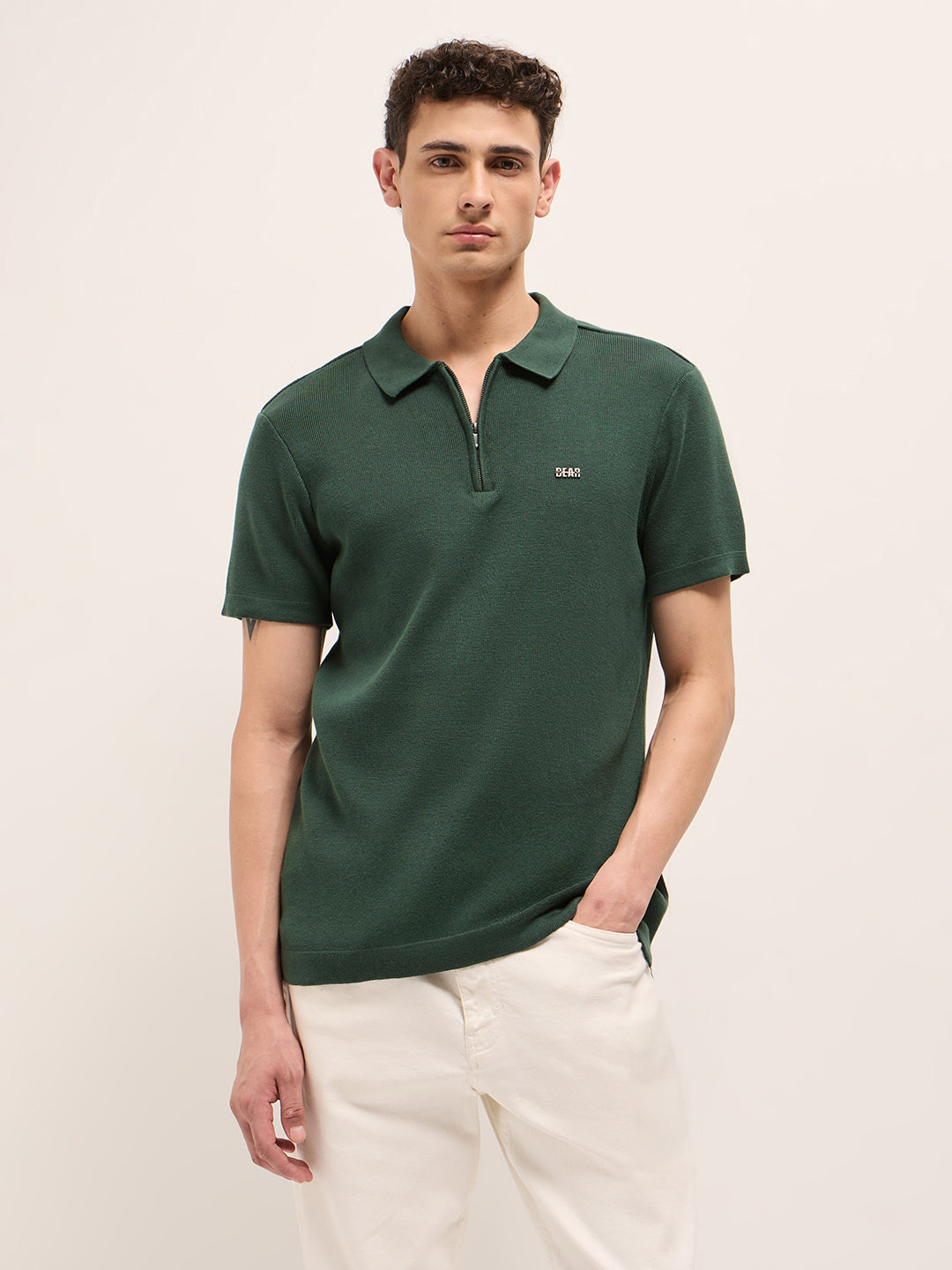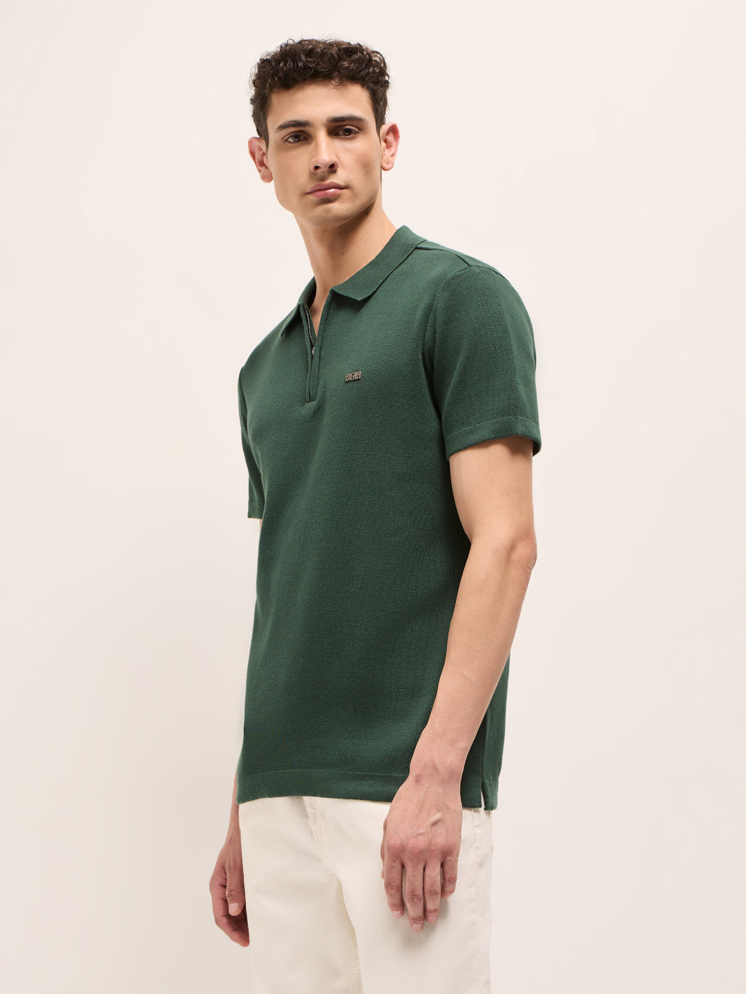 Green Regular Fit Flat Knit Polo with Half-Zip Placket