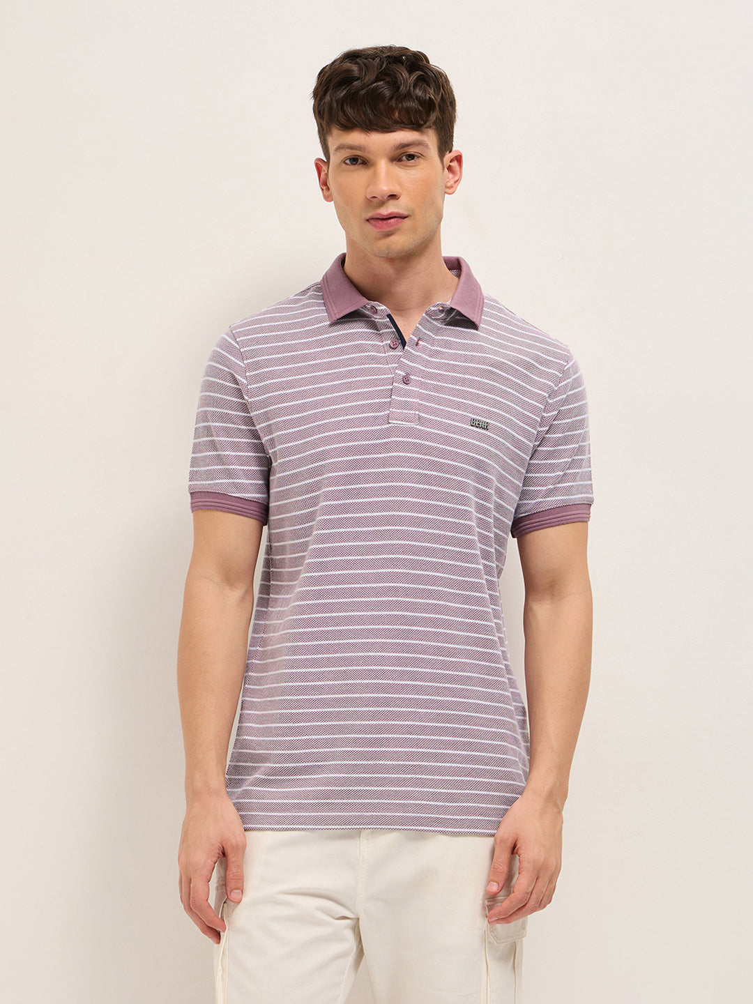 Purple Regular Fit Polo T-Shirt with Solid Collar and Horizontal Knitted Stripes