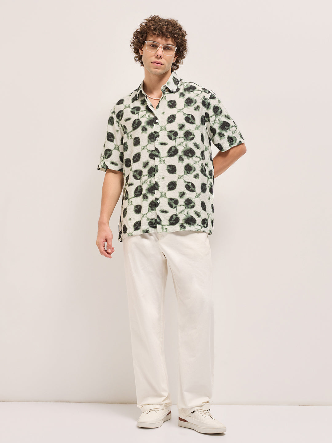 Shop Cream with Dark Green Foliage Print Relax Fit Casual Shirt Online.