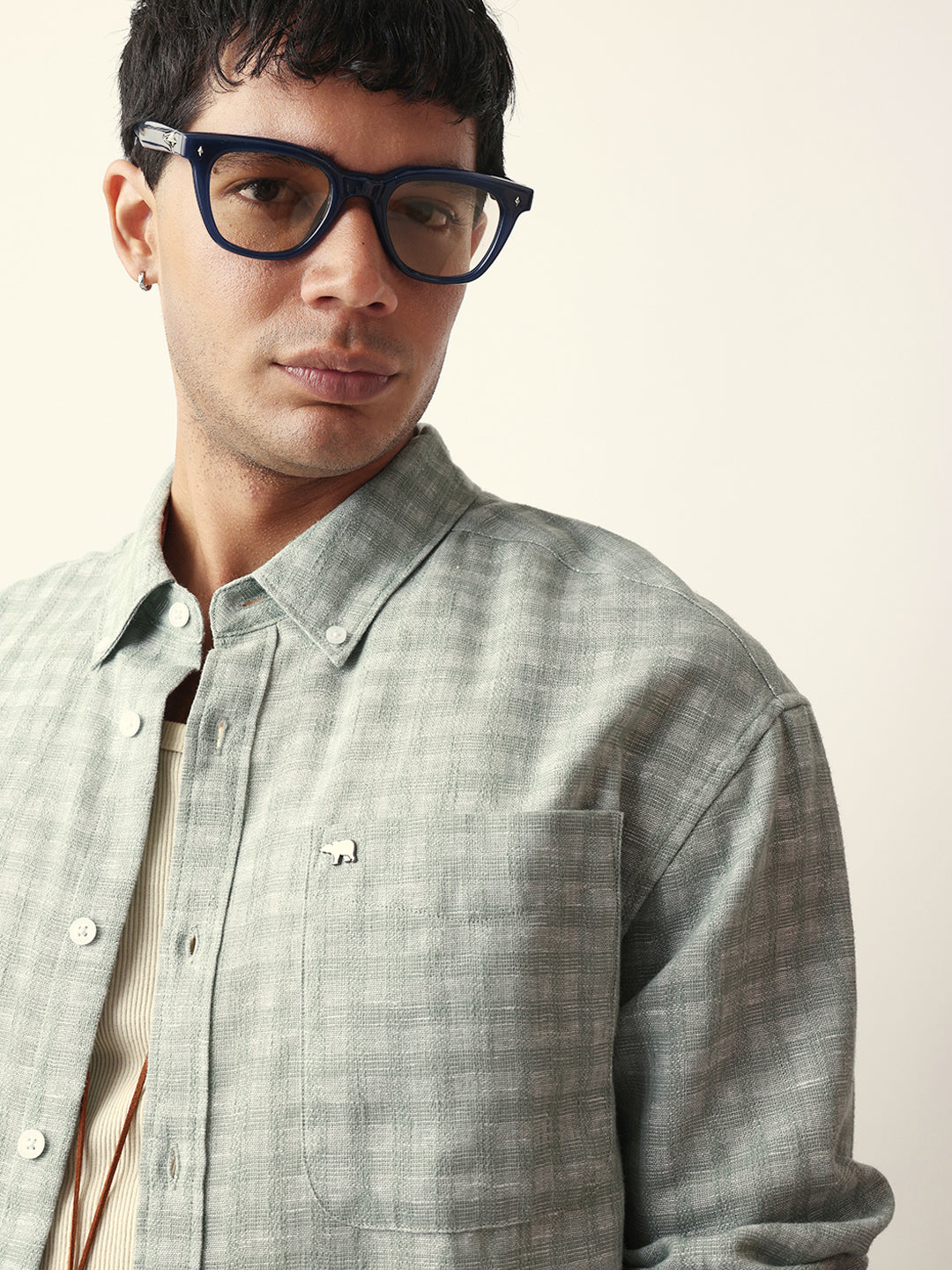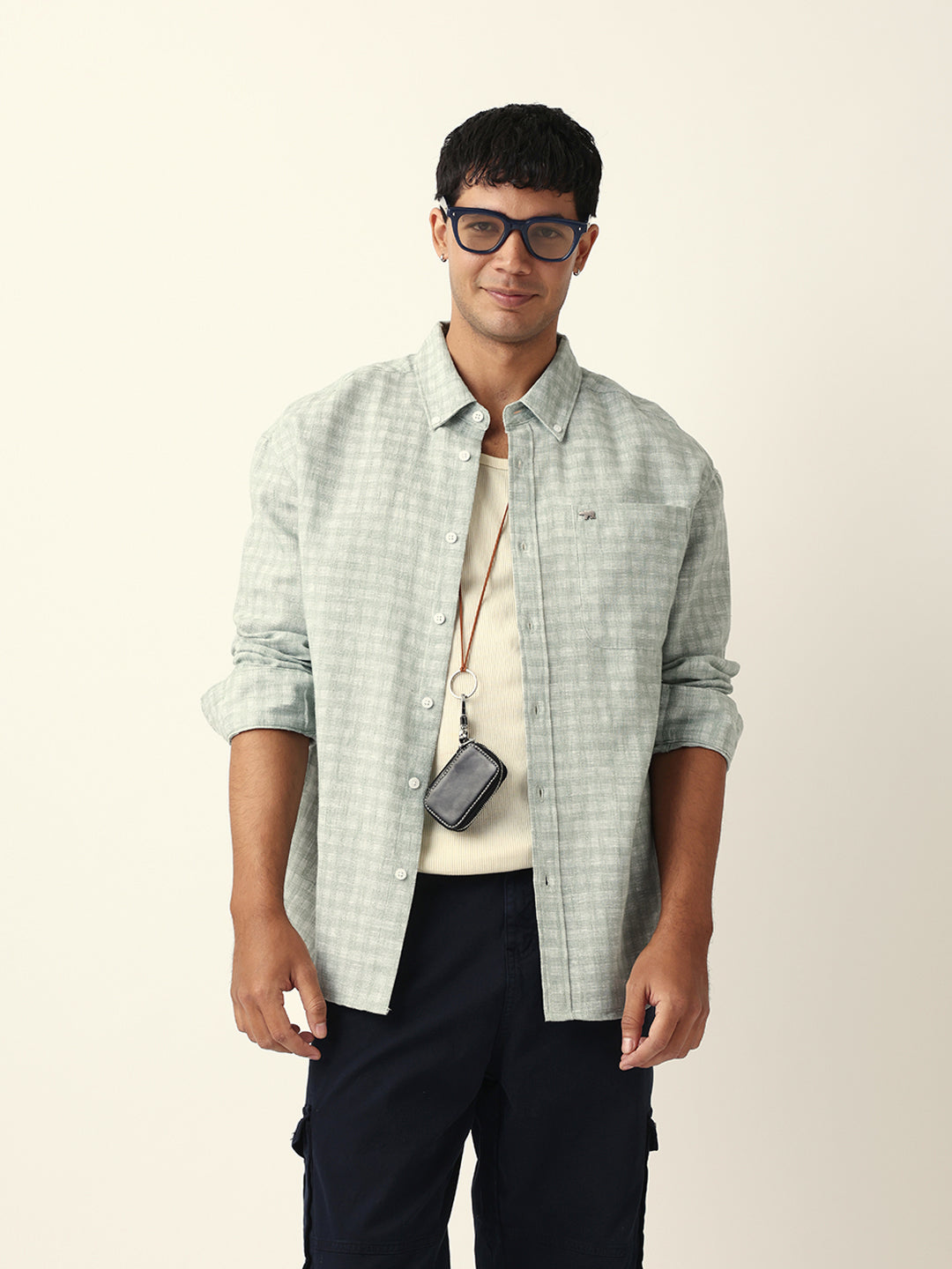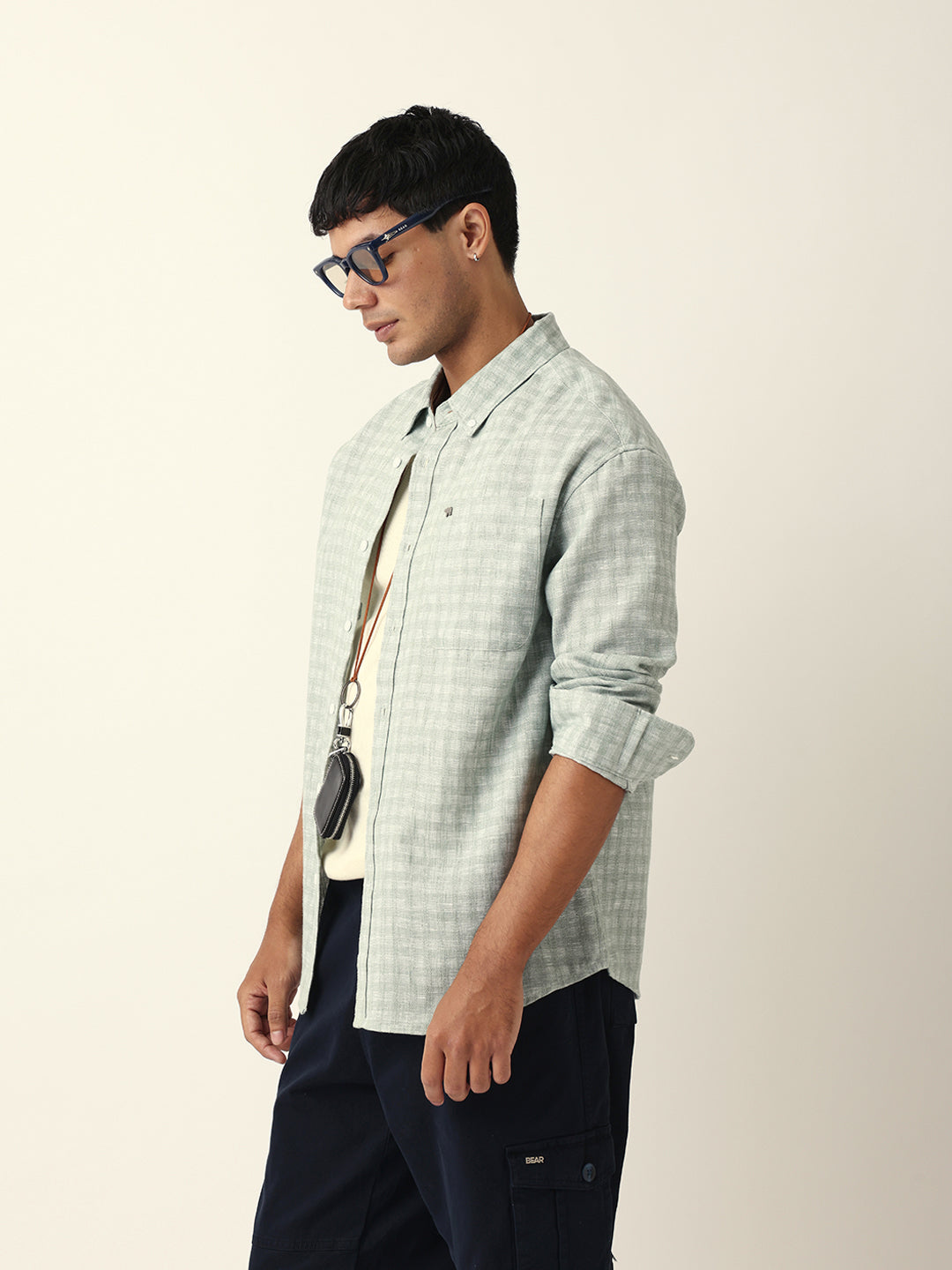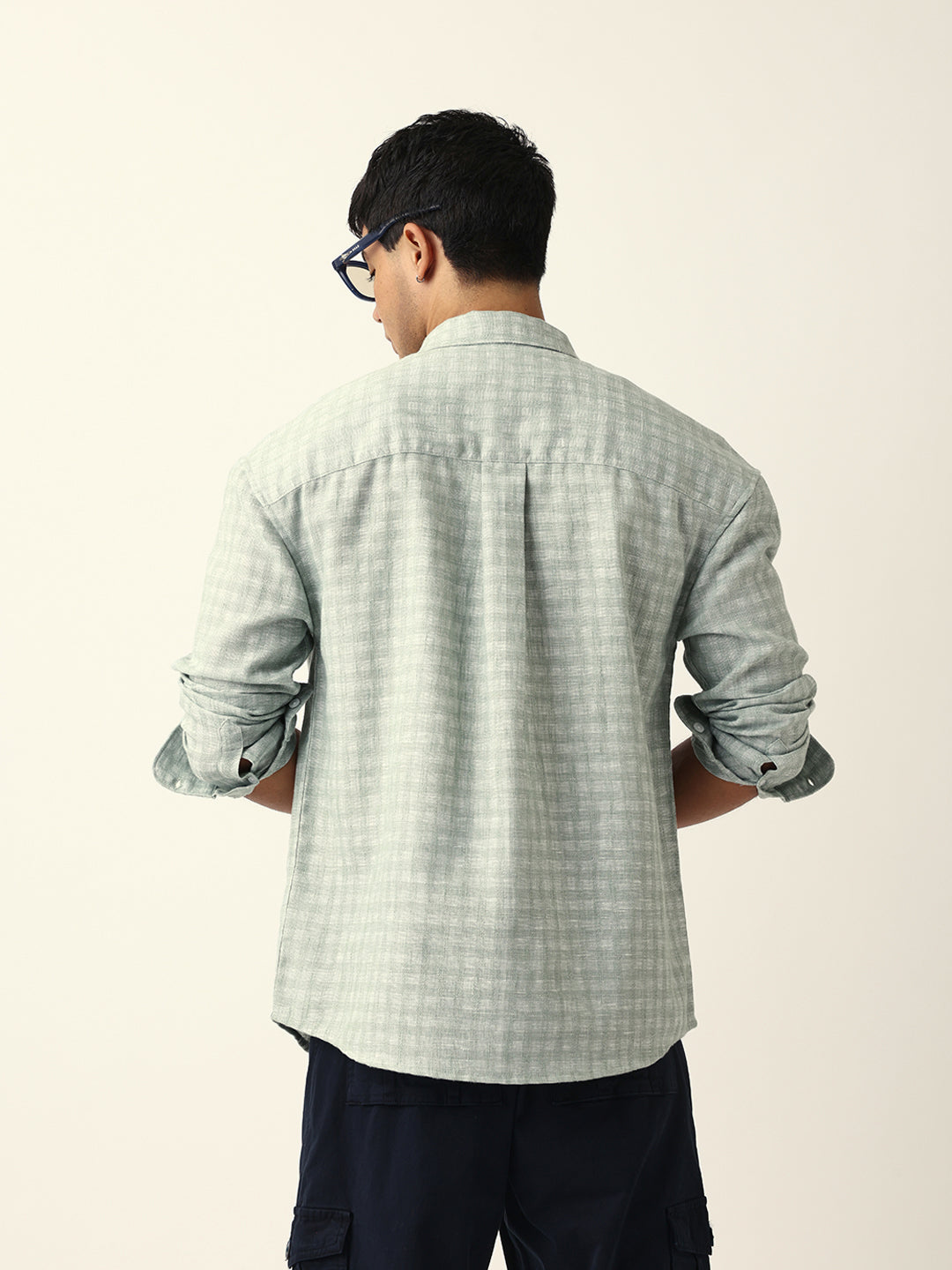 Green Woven Micro Check Textured Relax Fit Overshirt