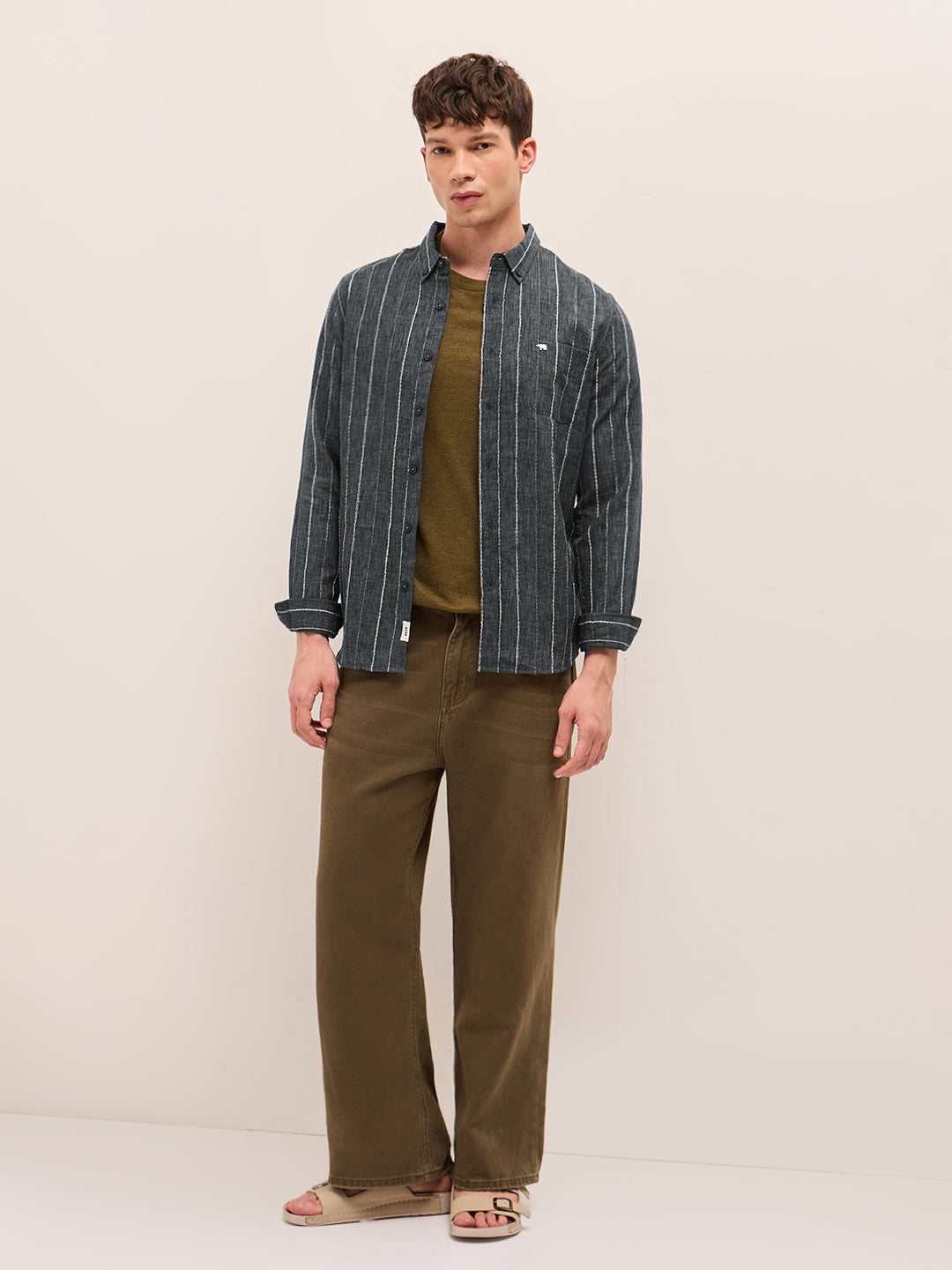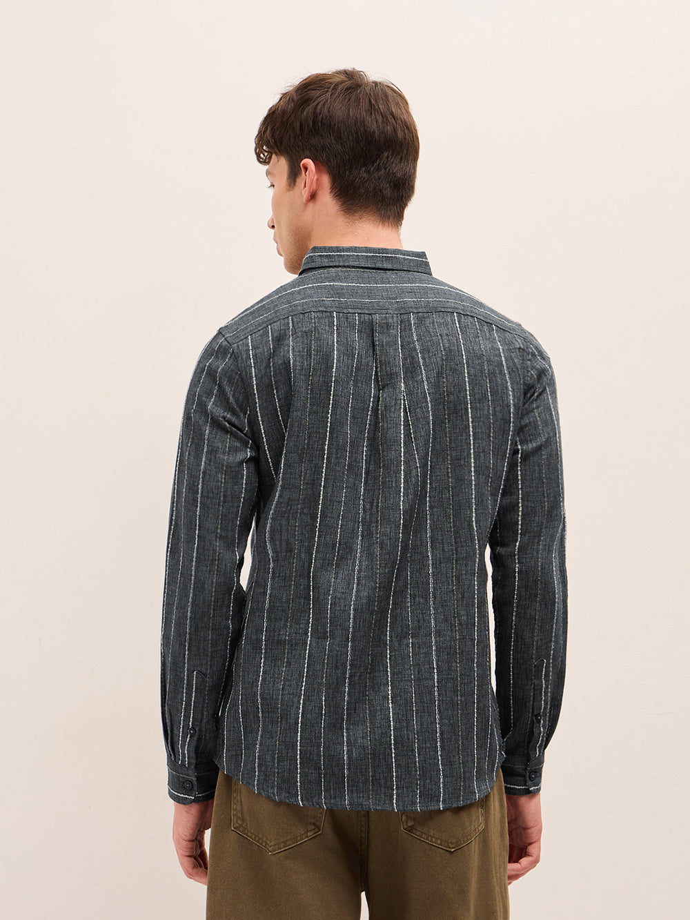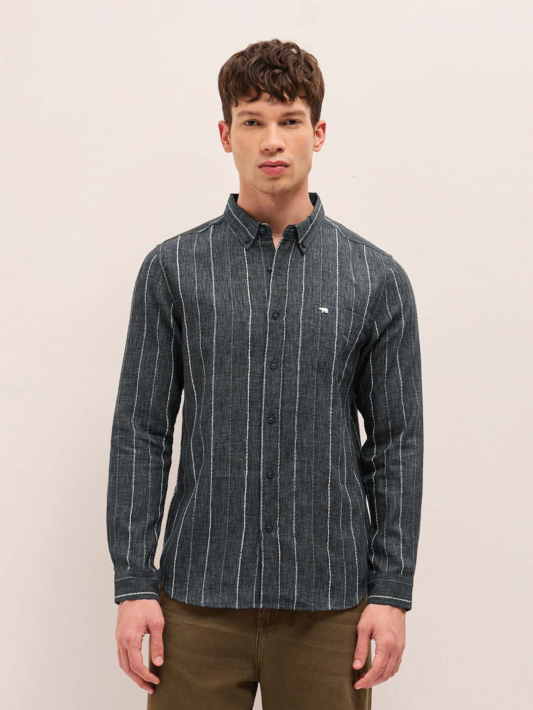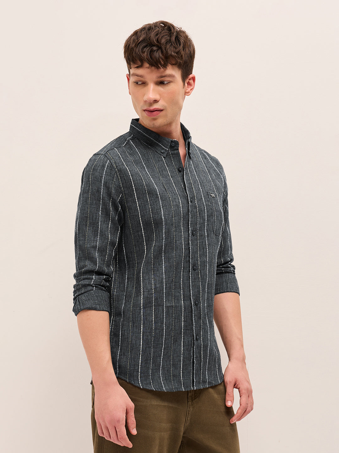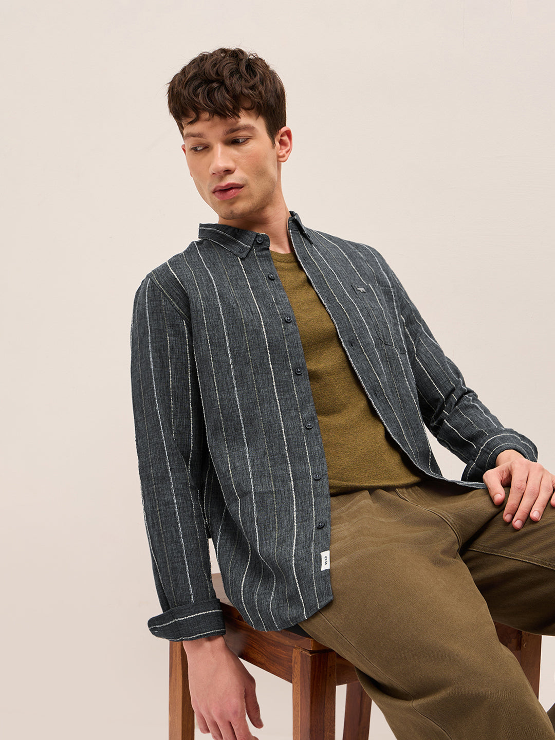 Shop Grey Woven Vertical Stripes Slim Fit Casual Shirt Online.
