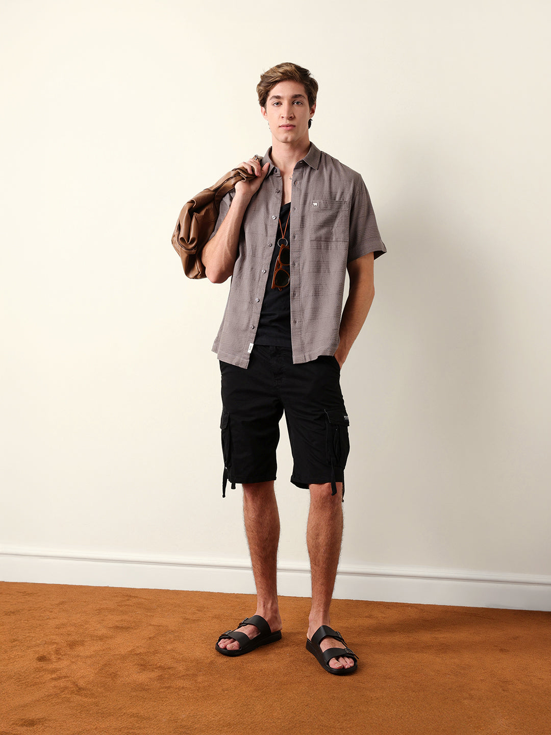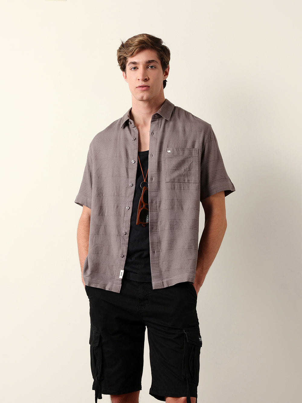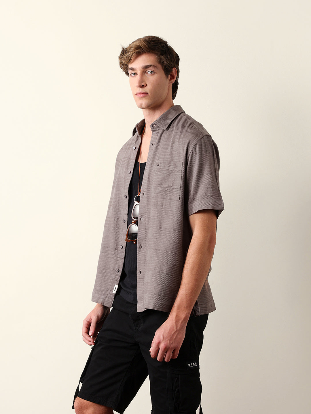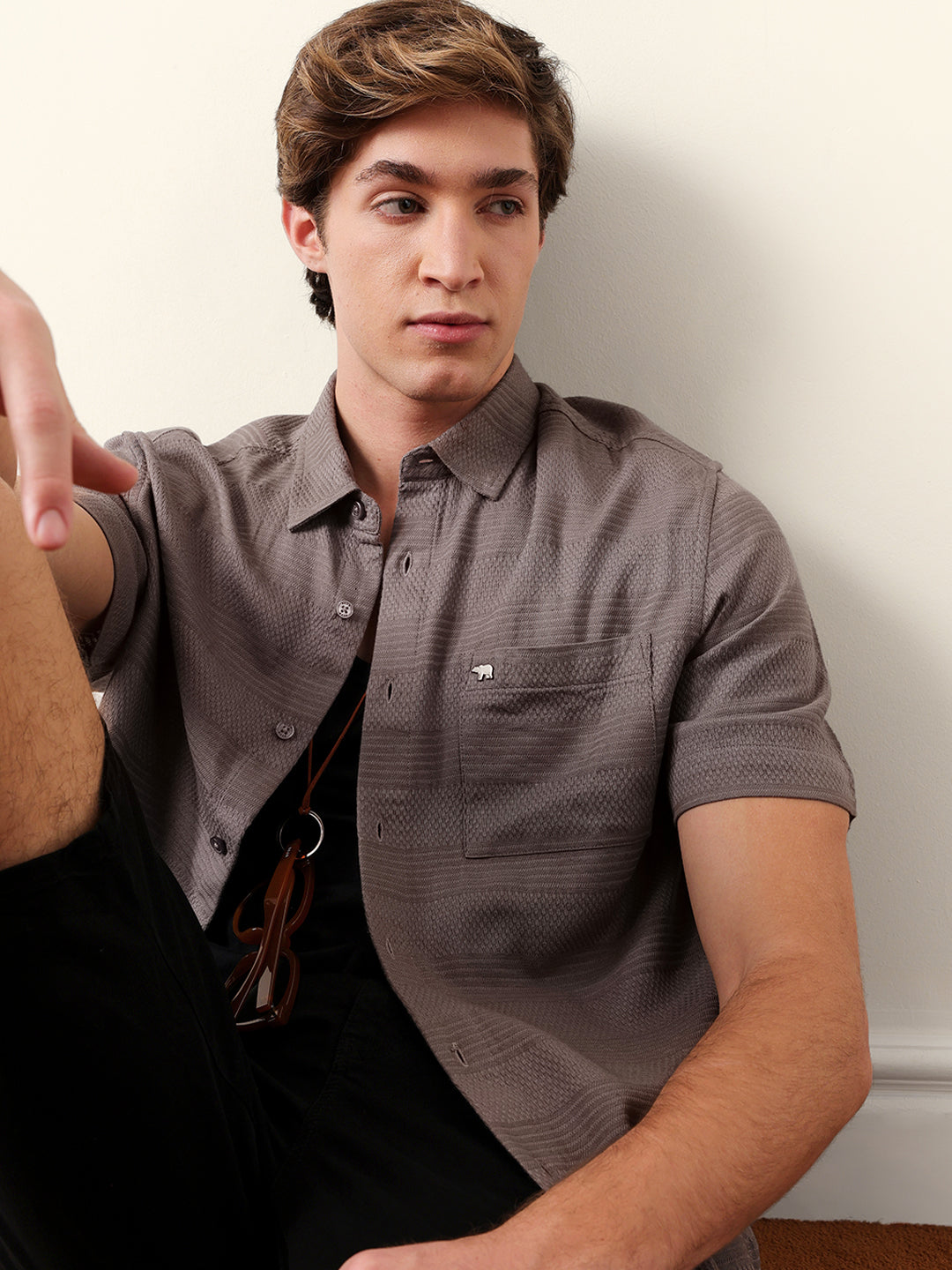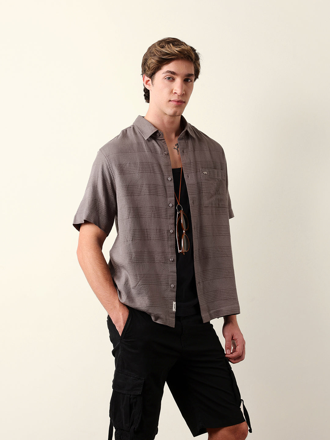 Shop Grey Relaxed Fit Casual Half Sleeve Shirt with Textured Horizontal Stripes Online.