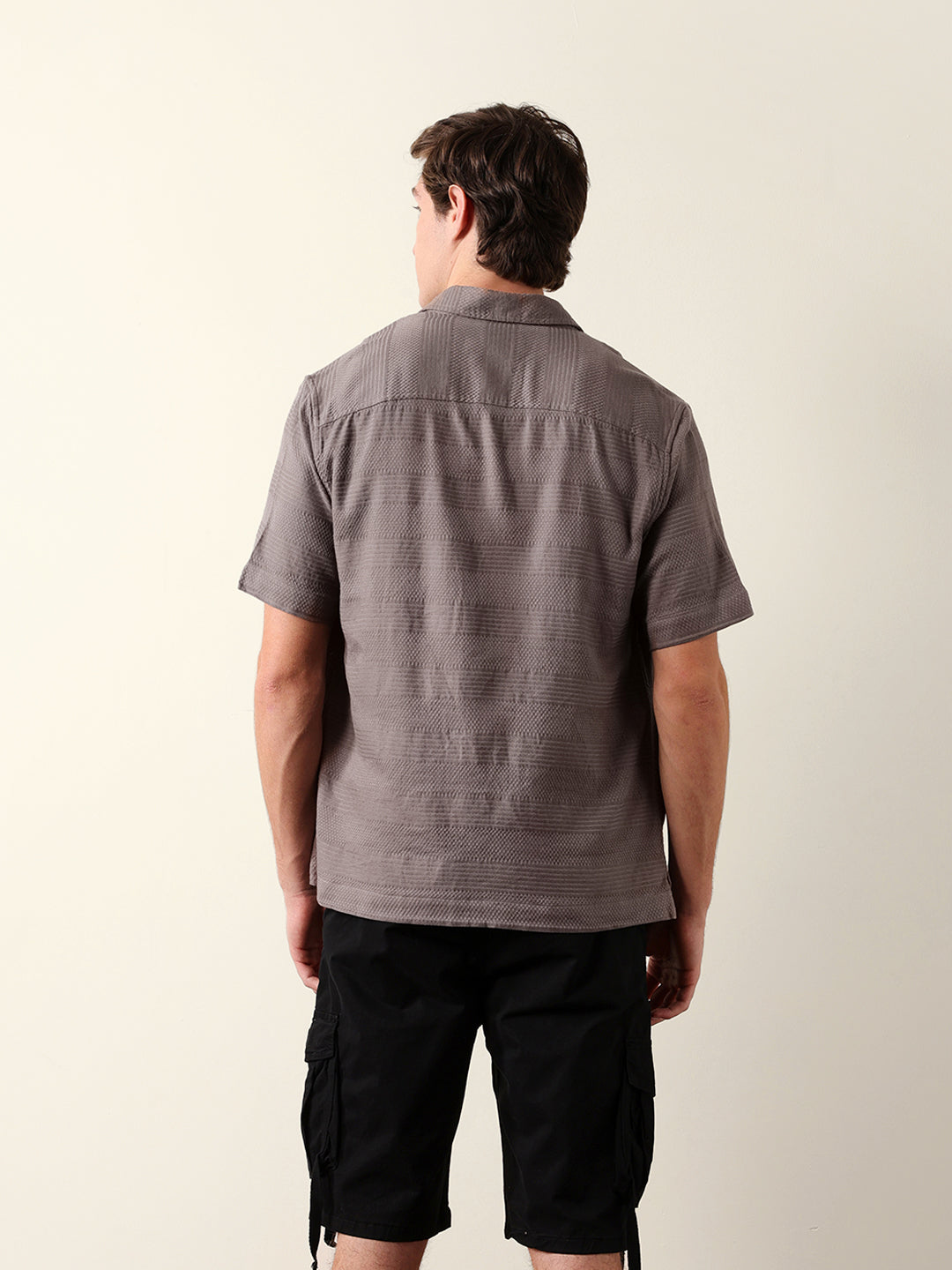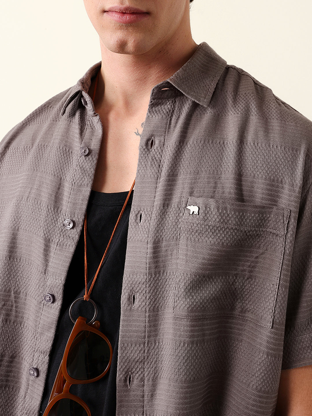 Grey Relaxed Fit Casual Half Sleeve Shirt with Textured Horizontal Stripes