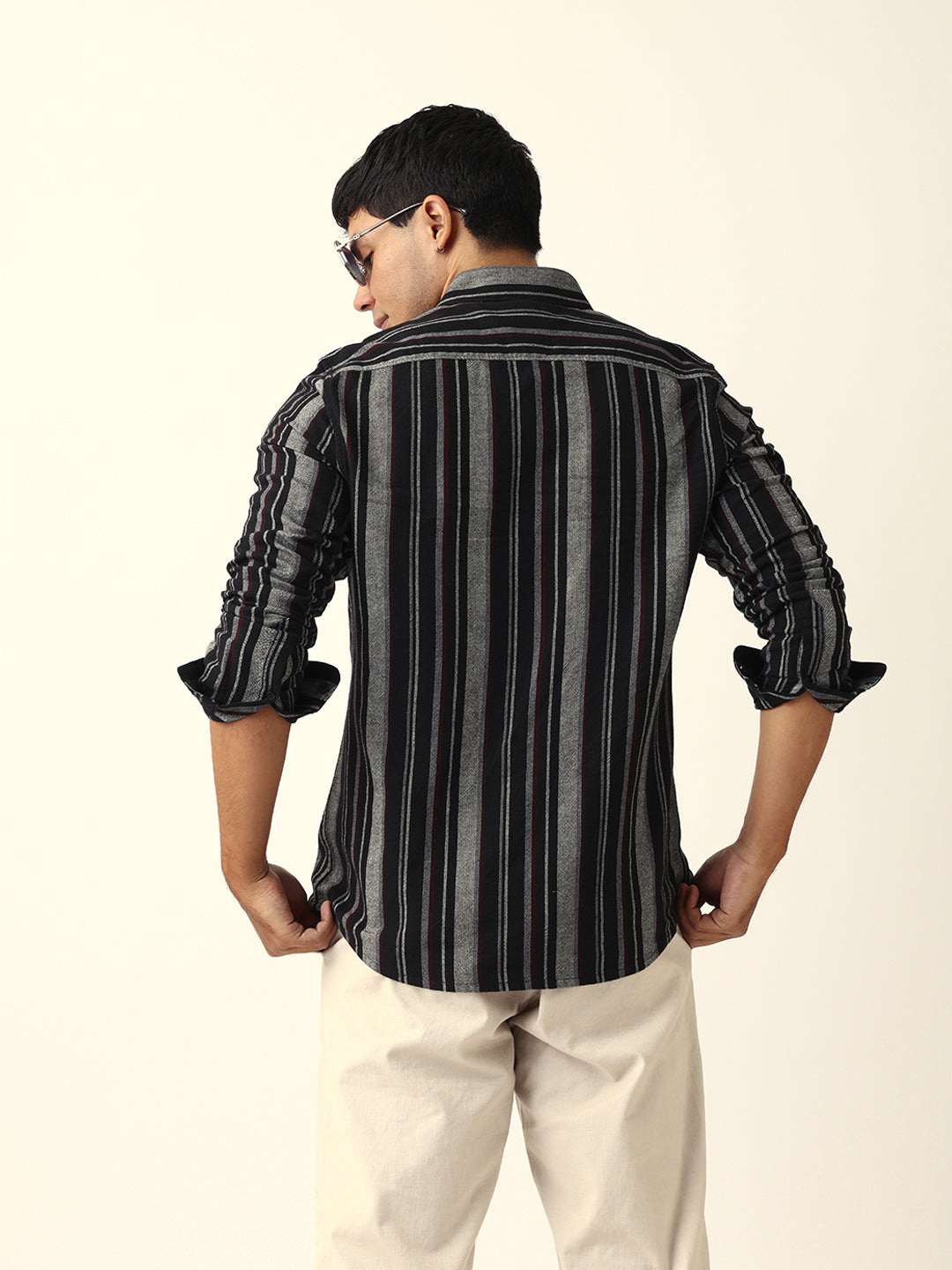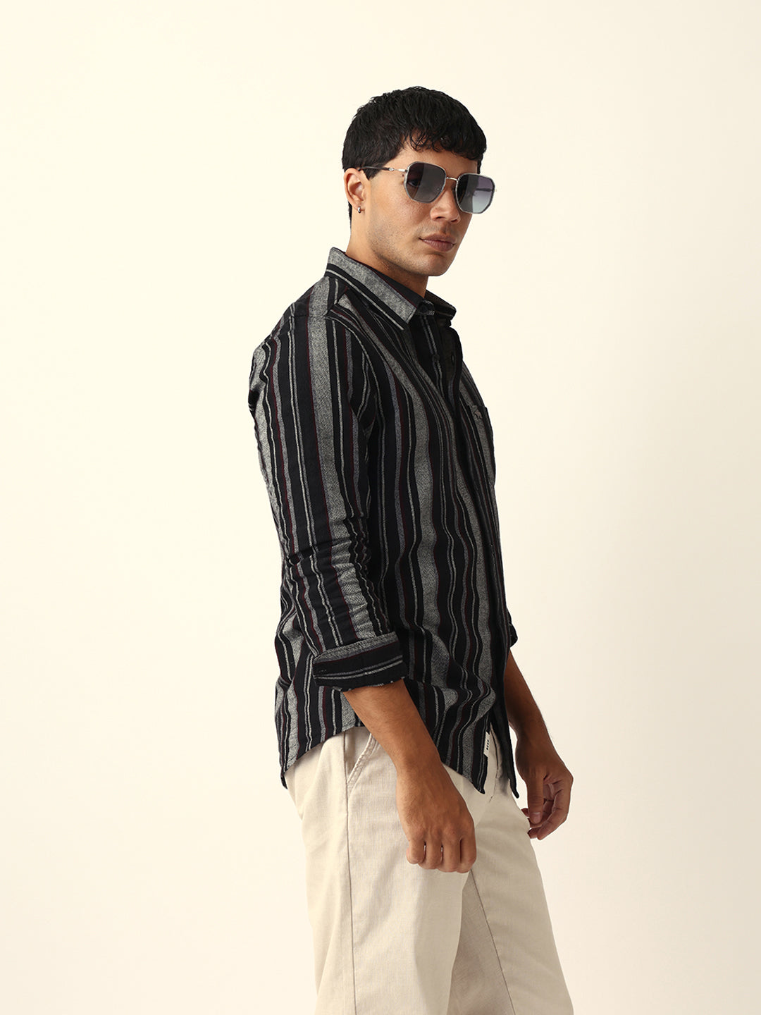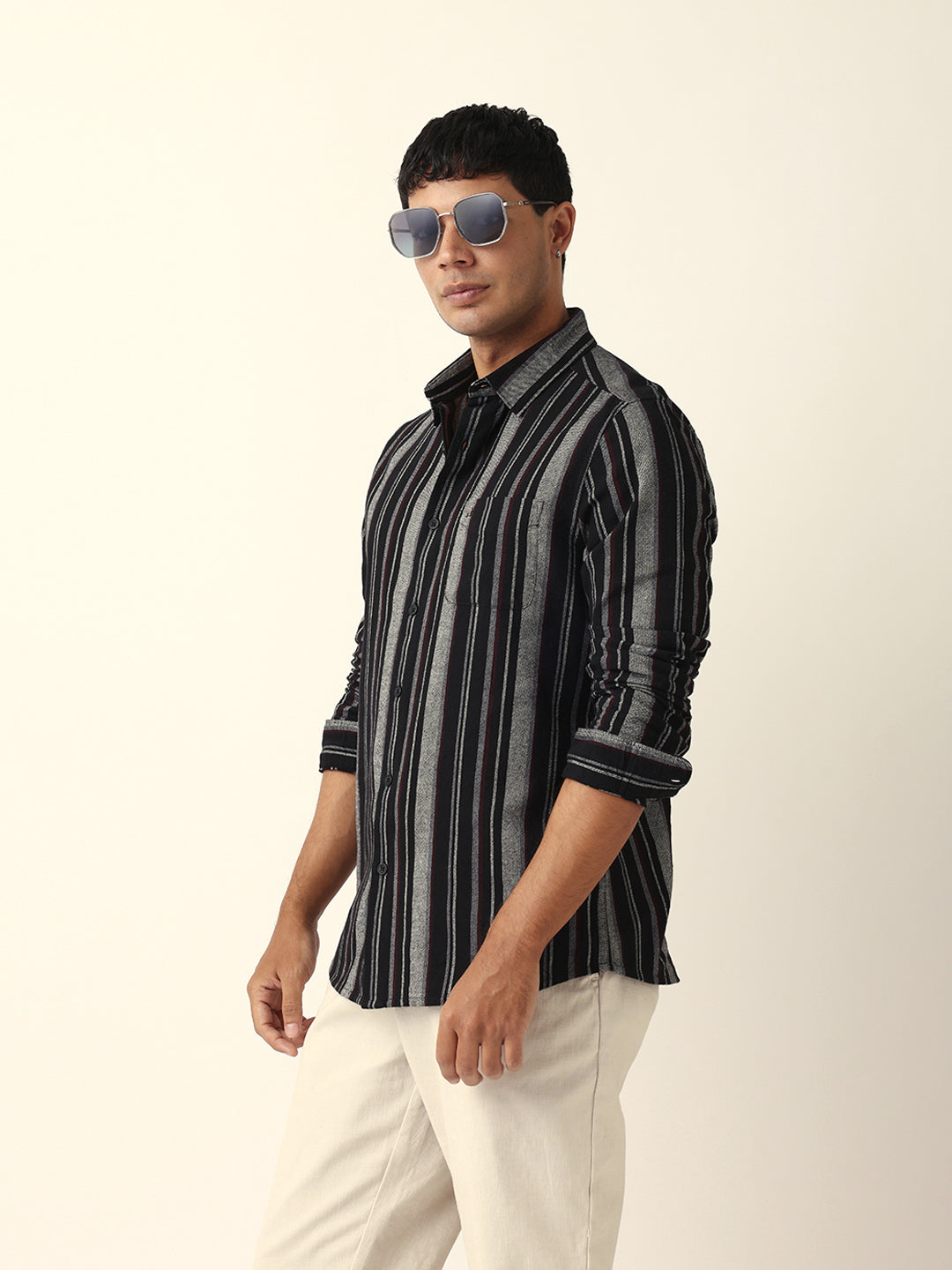 Shop Black Vertical Woven Stripe Slim Fit Casual Shirt Online.