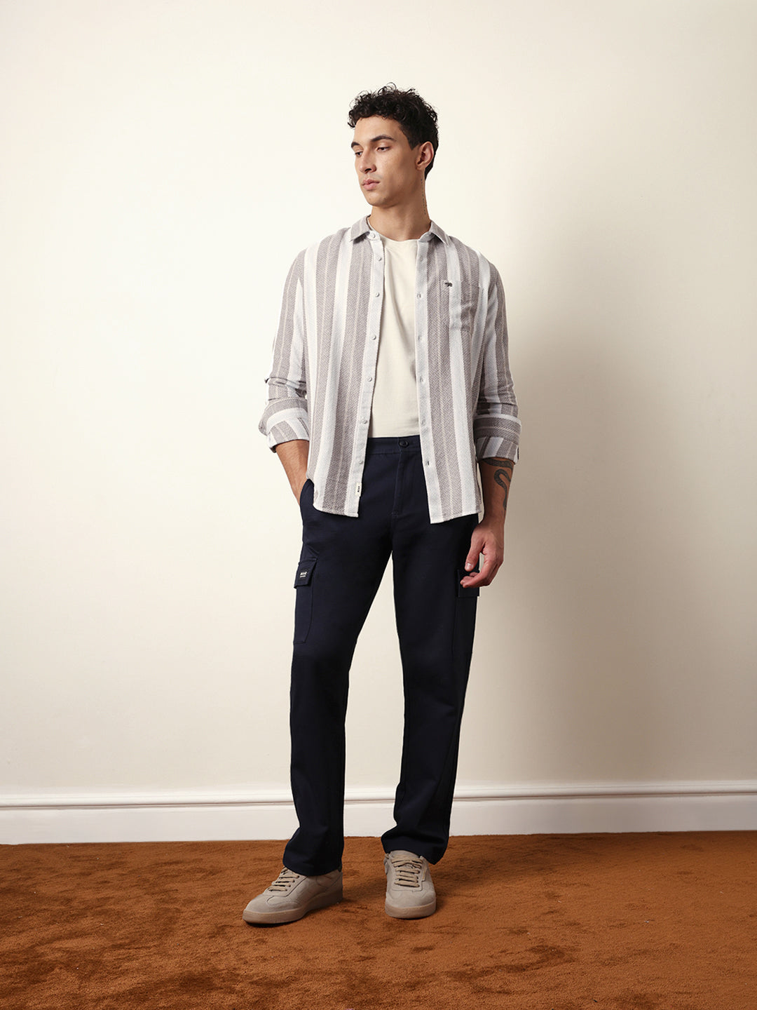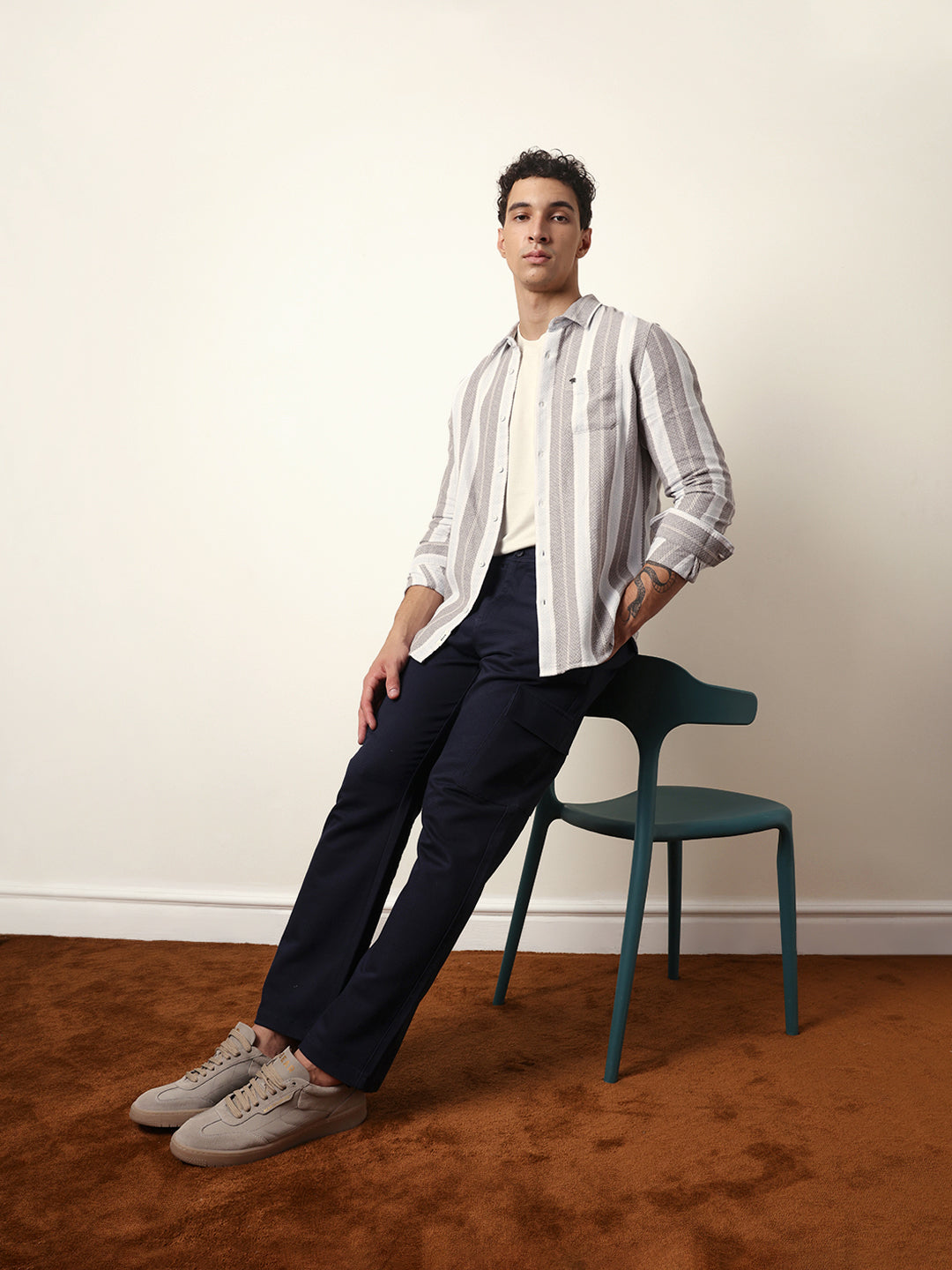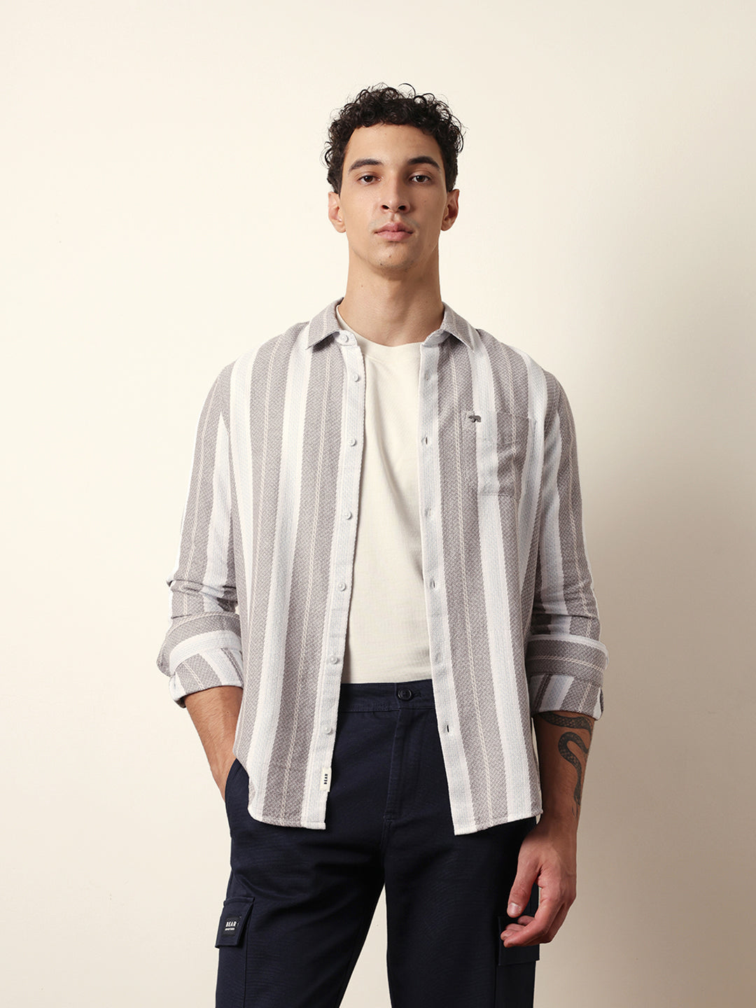 Multicolor Vertical Striped Slim Fit Casual Shirt with Woven-Effect Design
