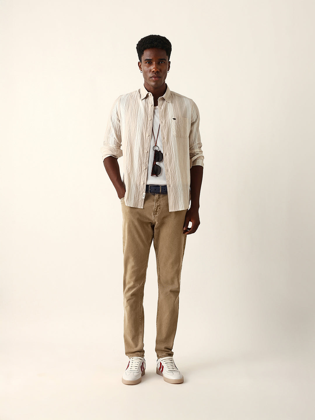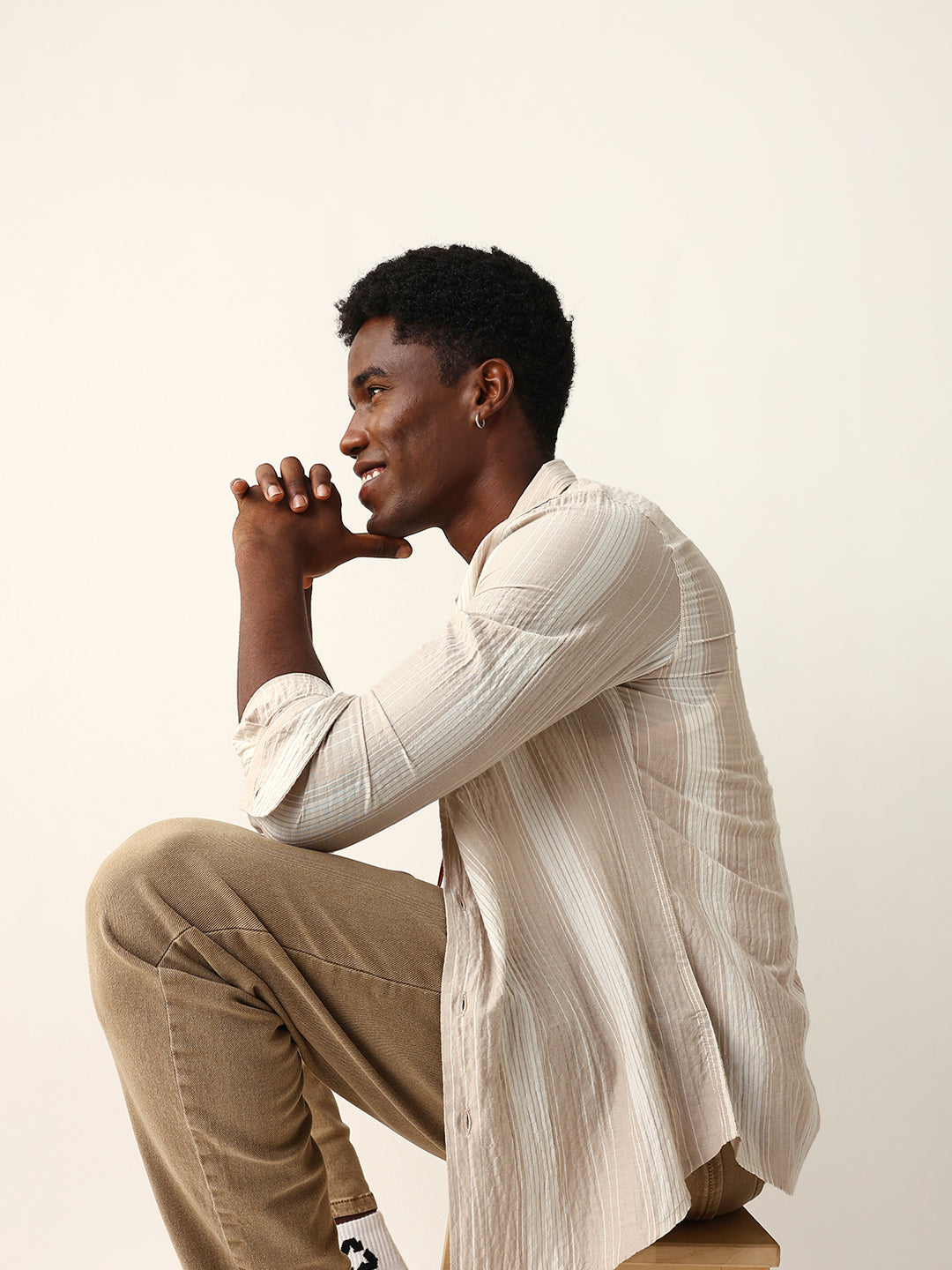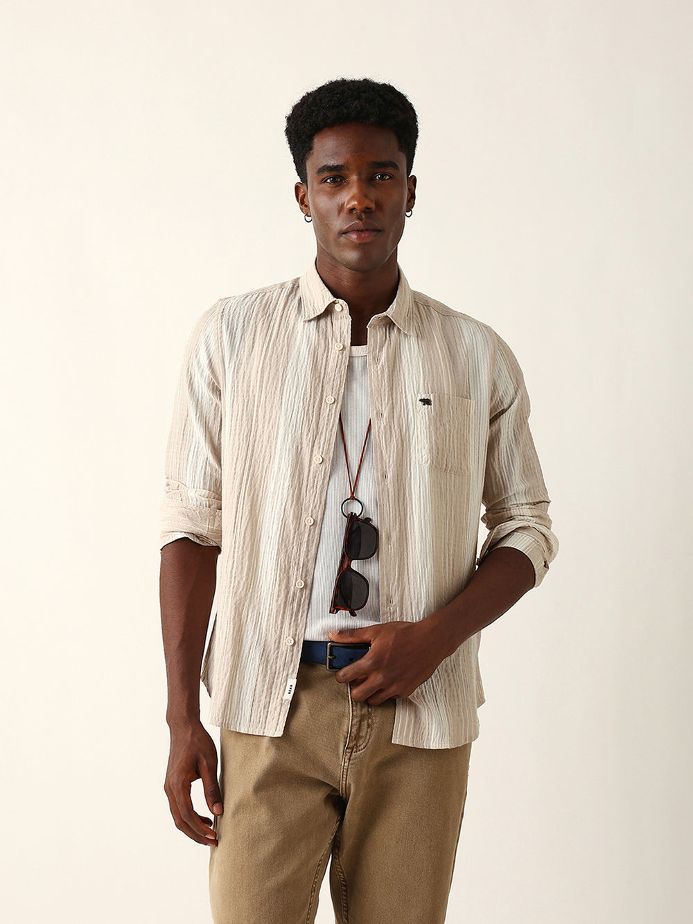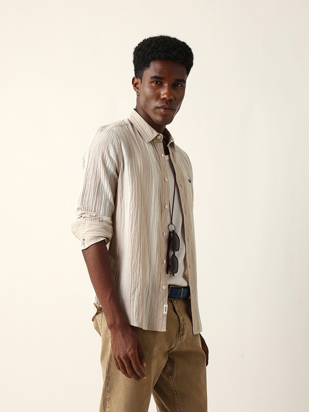 Shop Beige Crinkled Vertical Textured Slim Fit Casual Shirt Online.
