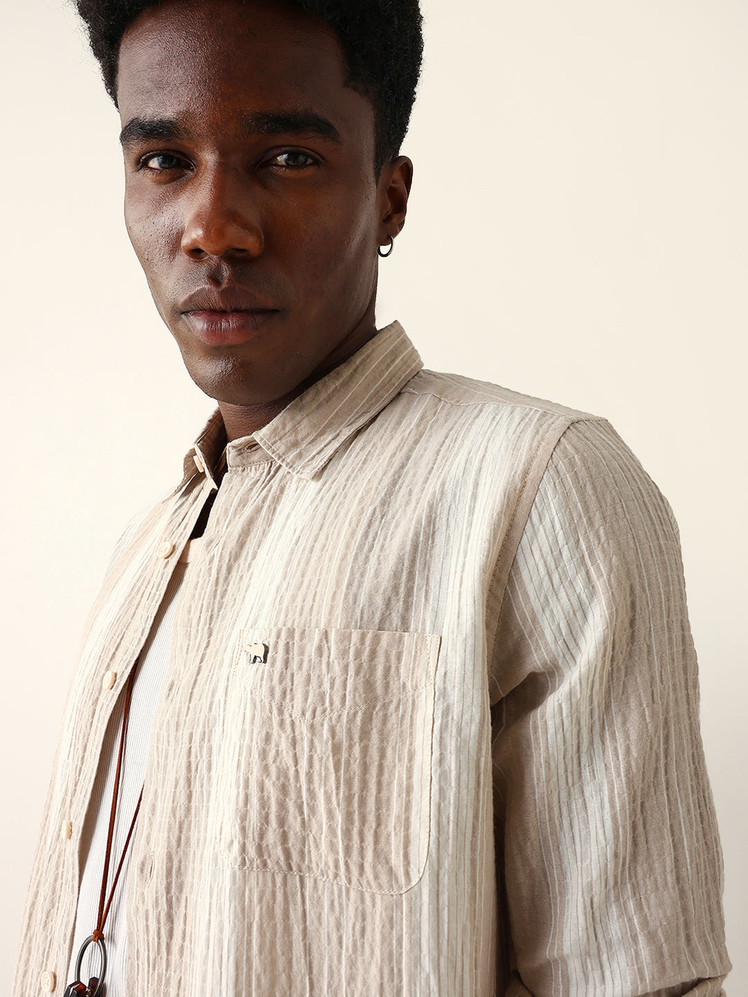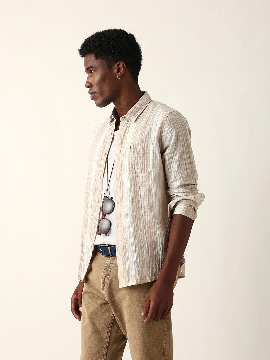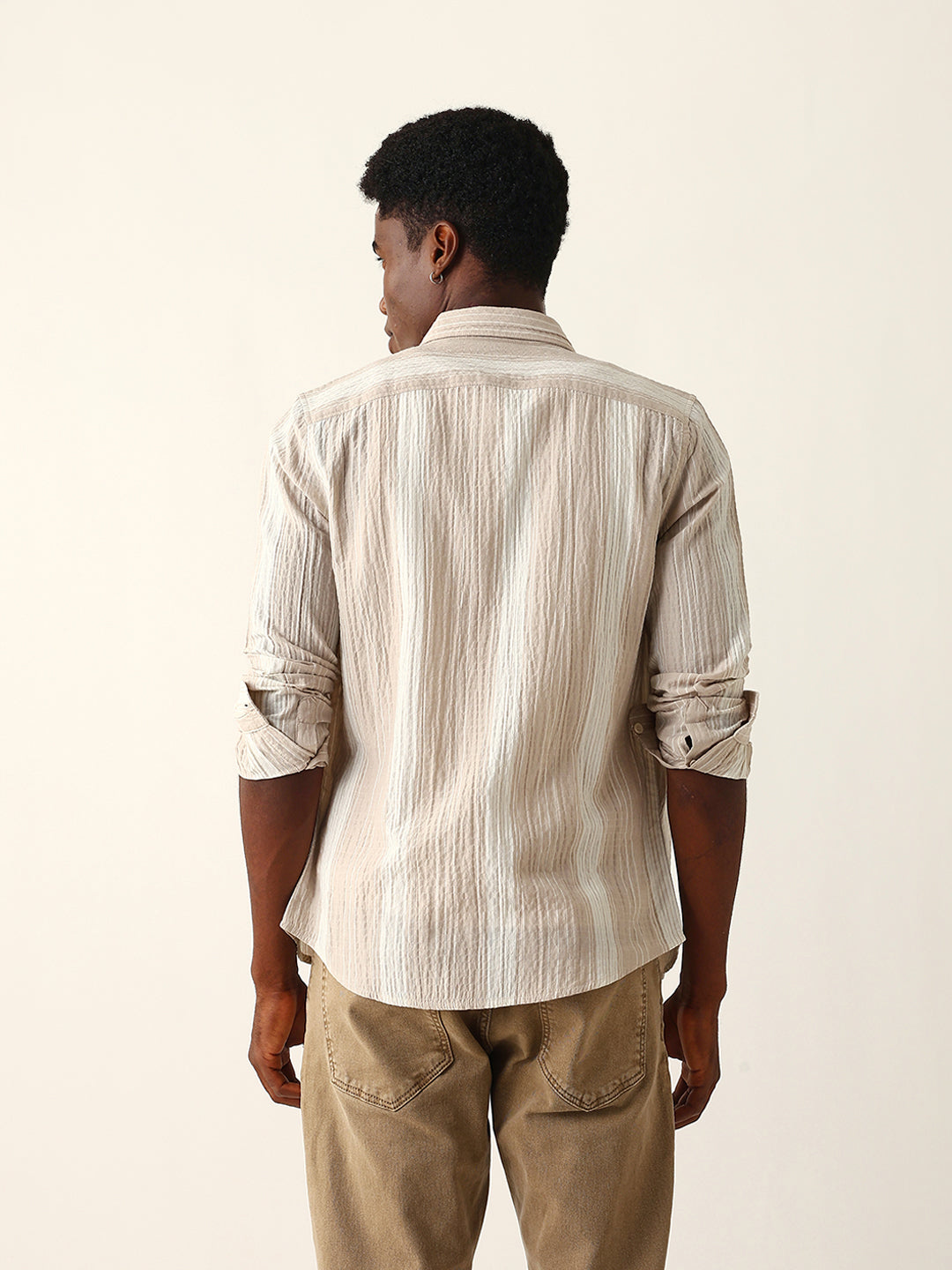 Beige Crinkled Vertical Textured Slim Fit Casual Shirt
