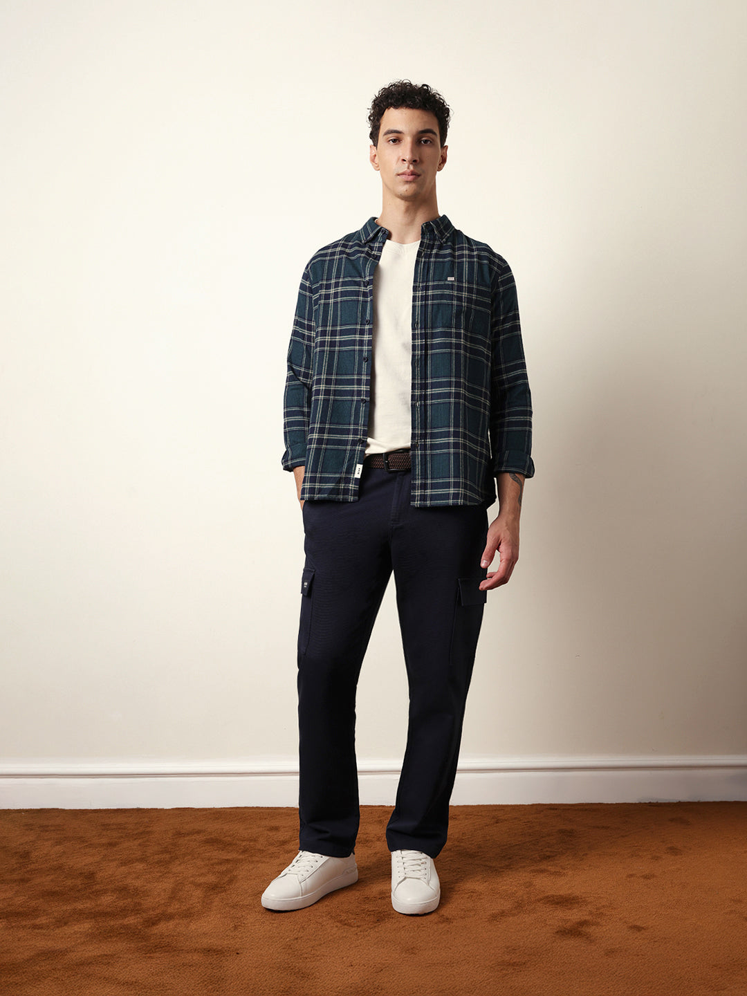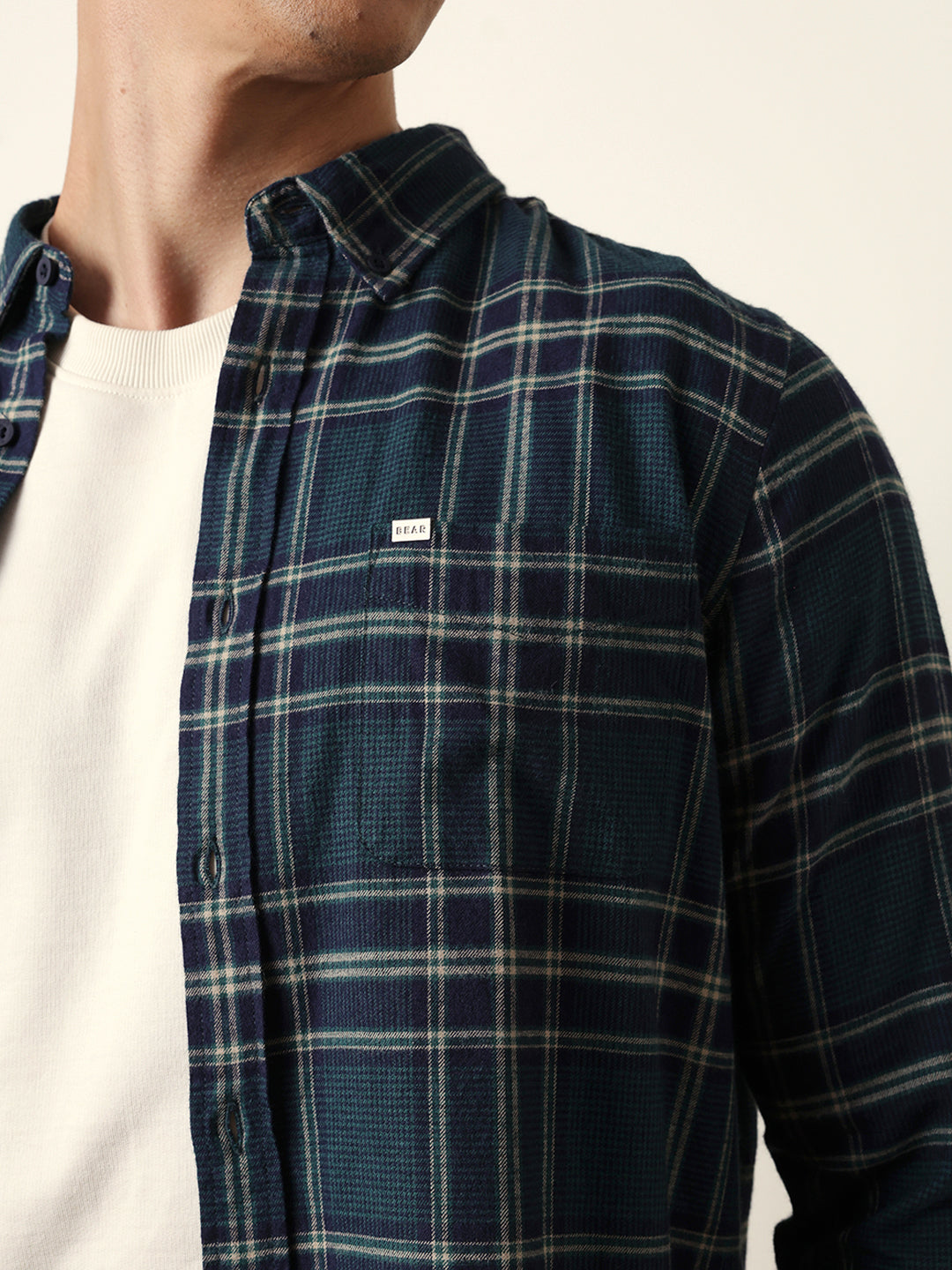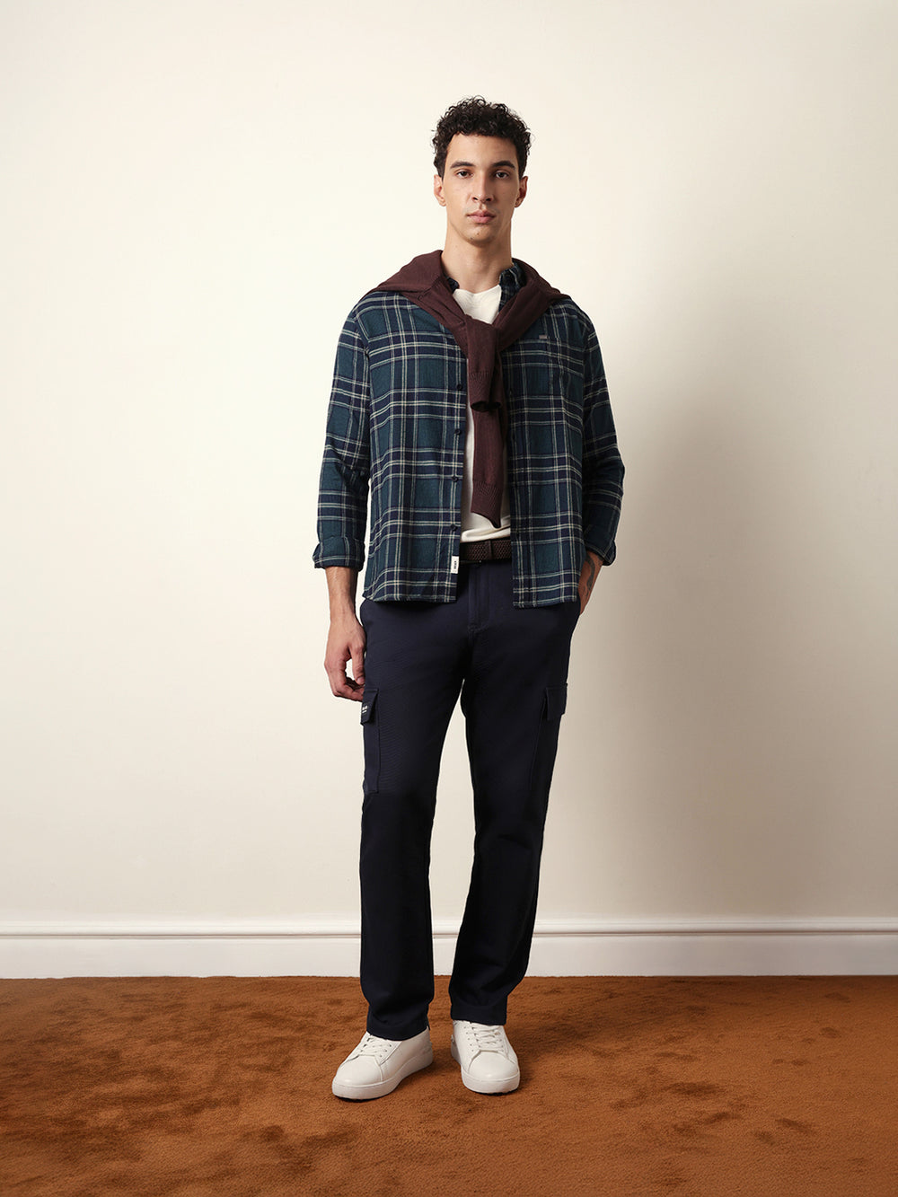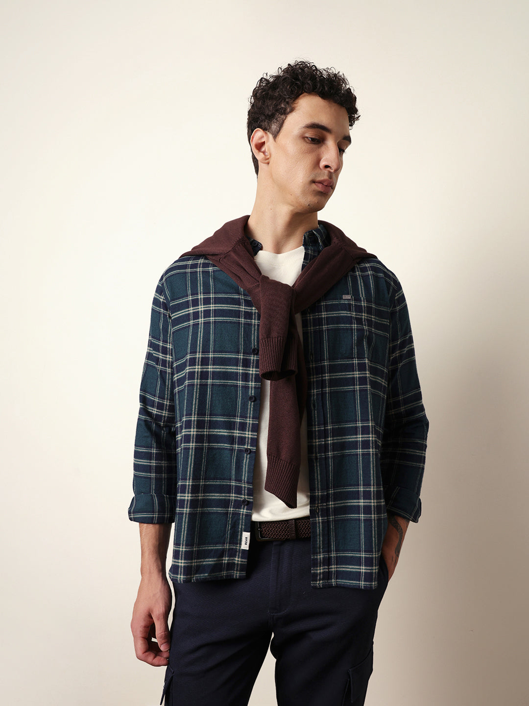 Shop Blue Woven Tartan Checked Slim Fit Casual Shirt Online.