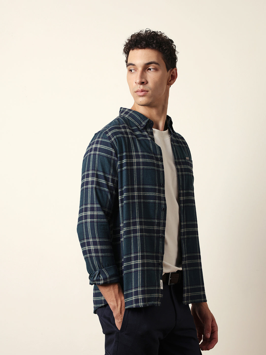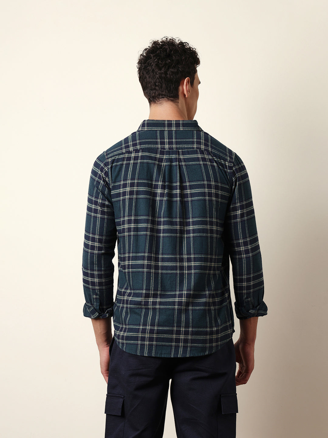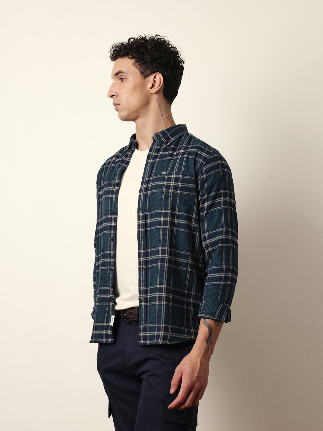 Blue Woven Tartan Checked Slim Fit Casual Shirt