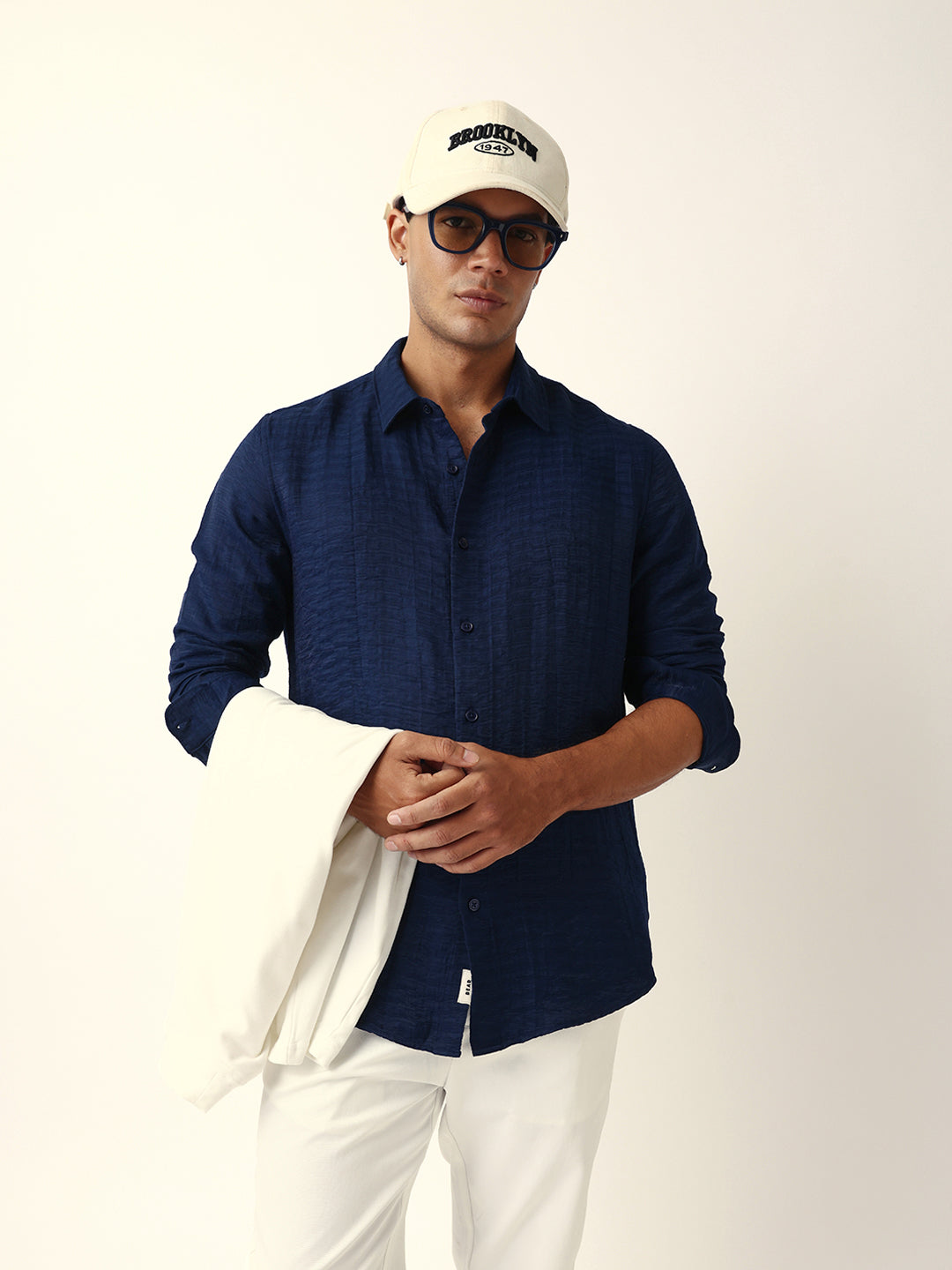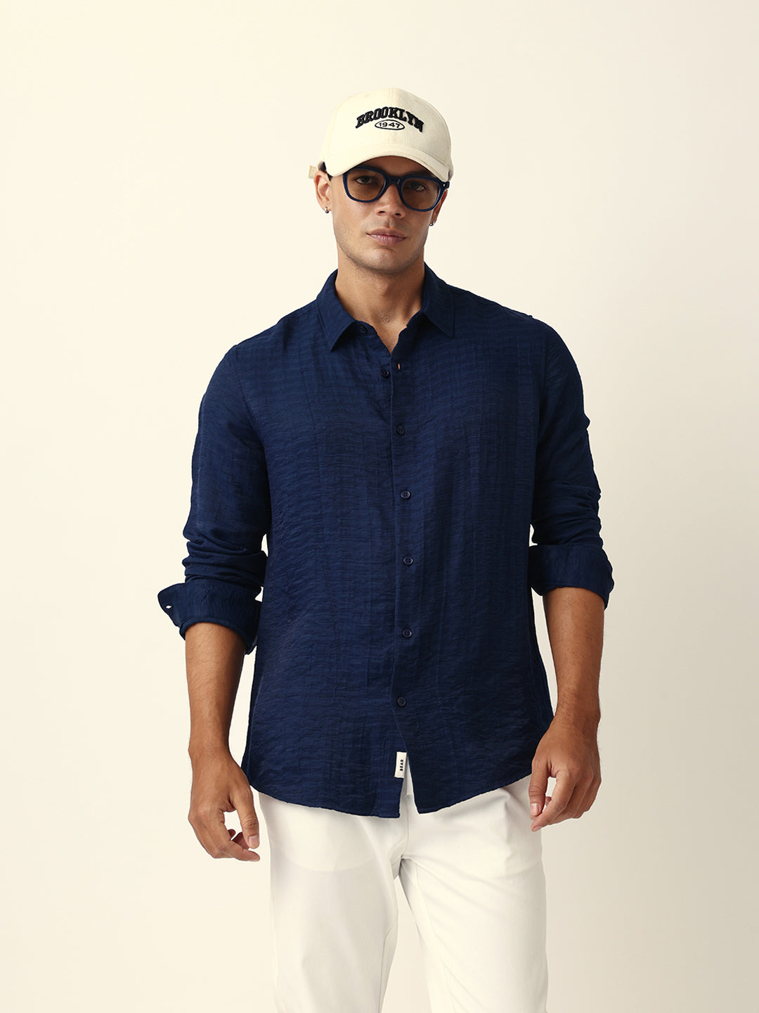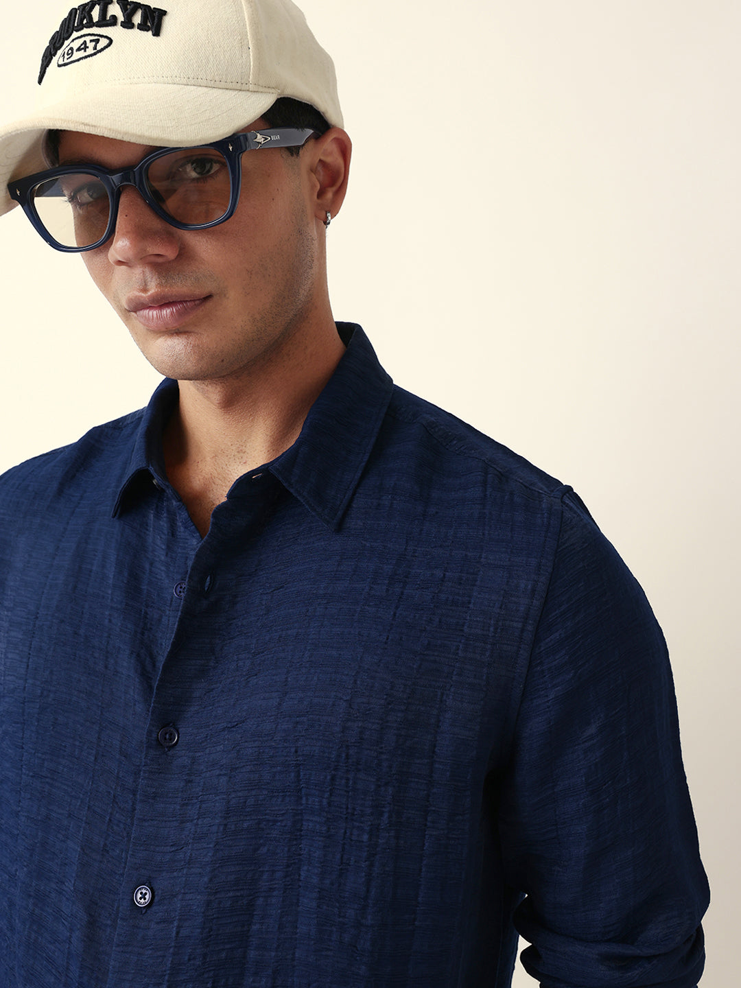 Shop Blue Crinkle Textured Slim Fit Casual Shirt Online.