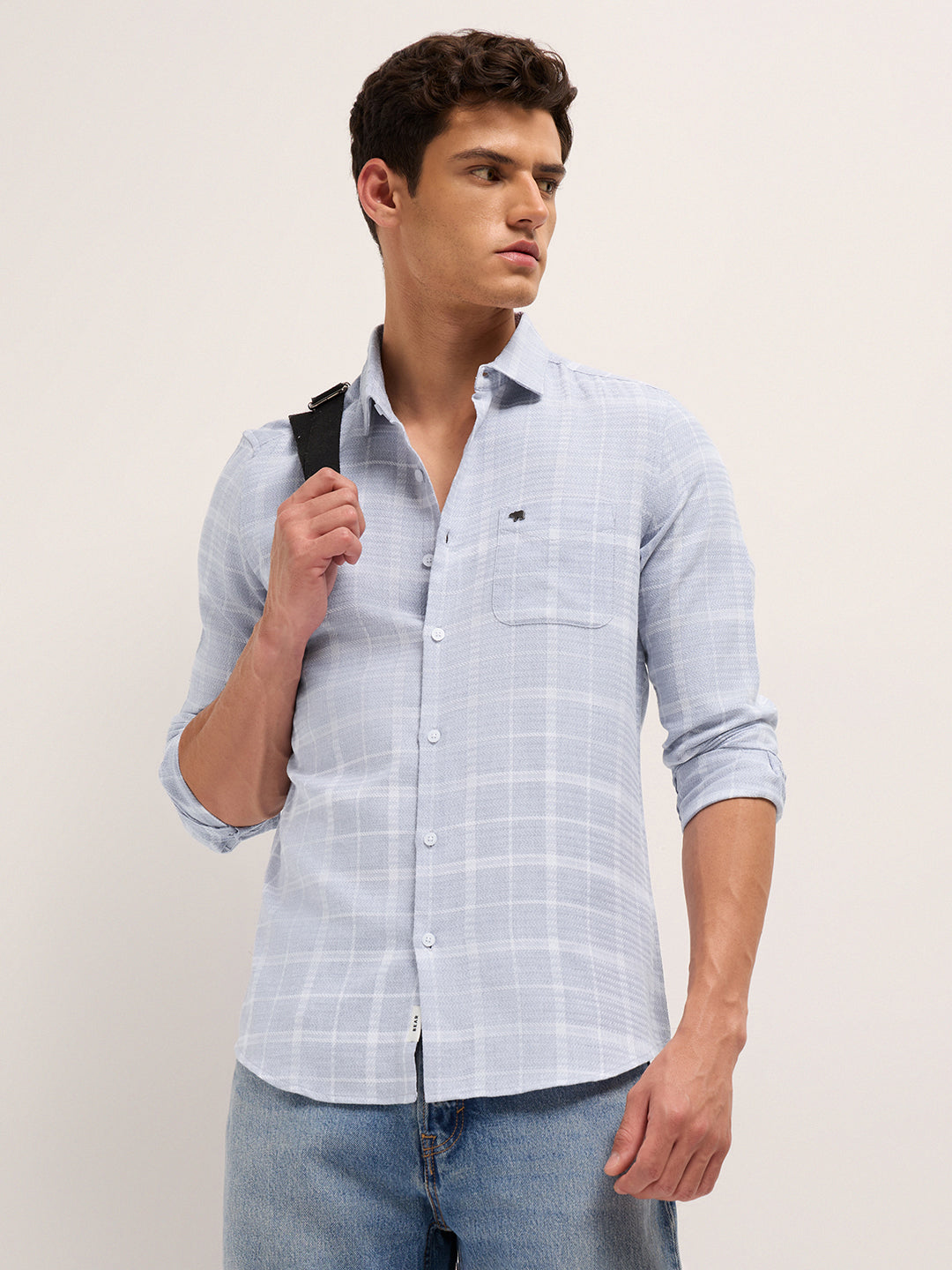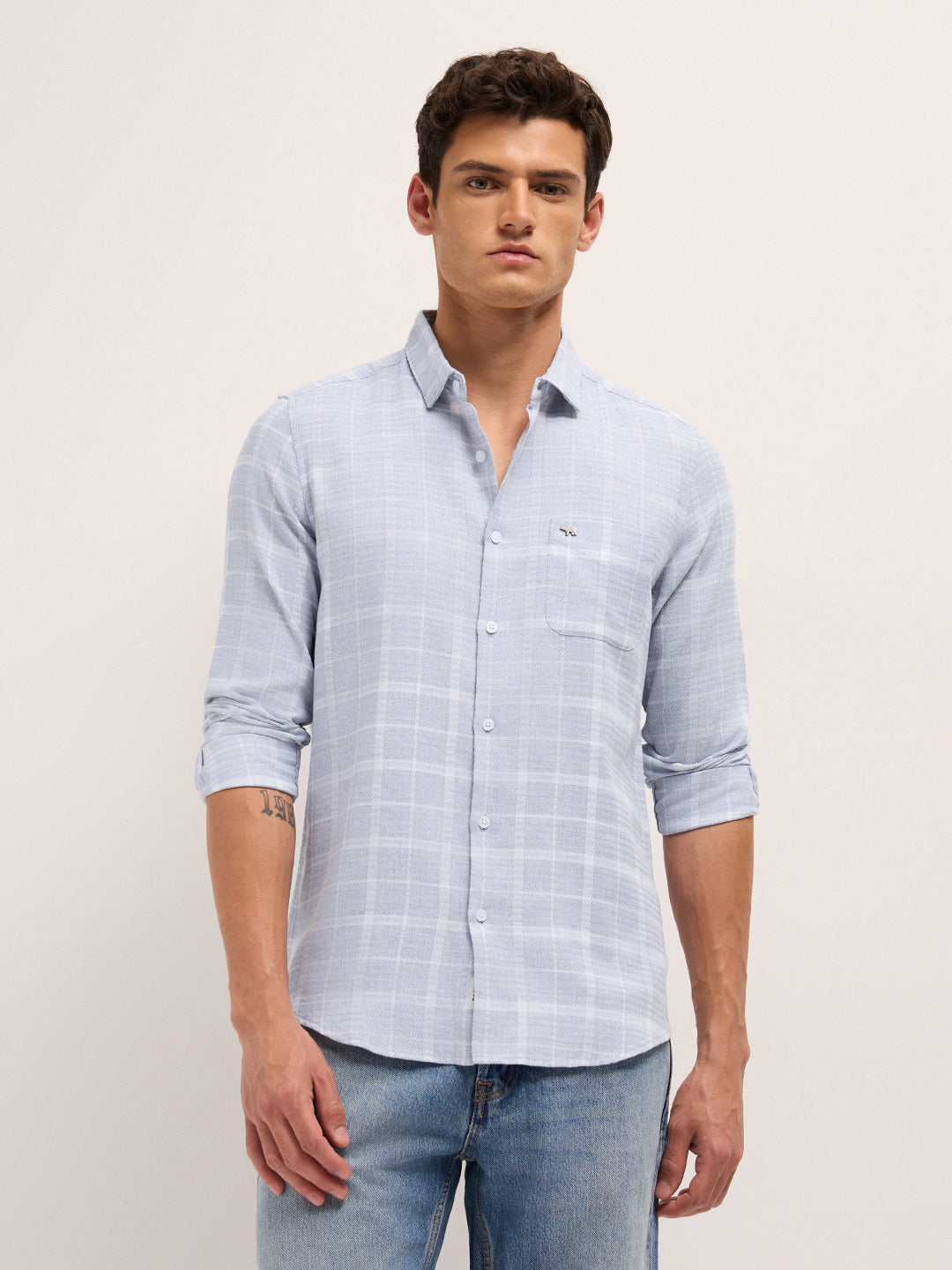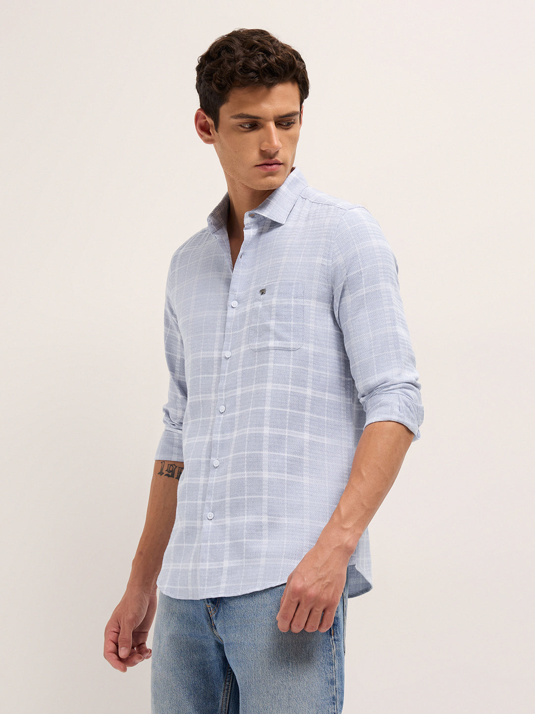 Shop Blue Herringbone Check Slim Fit Casual Shirt Online.