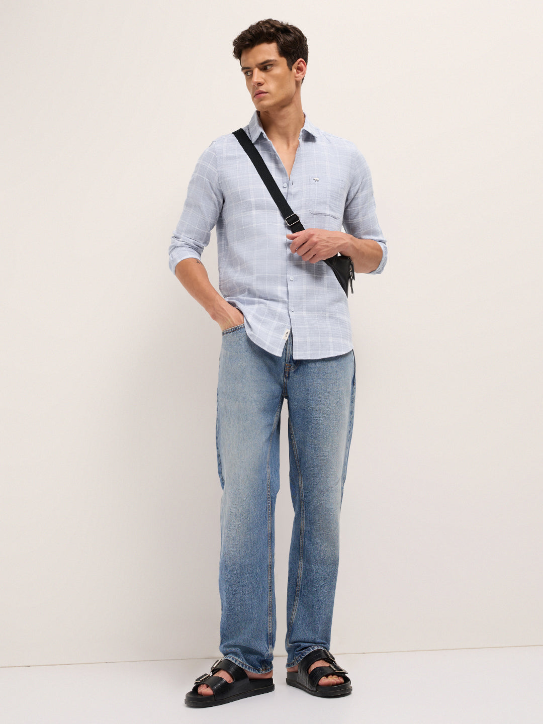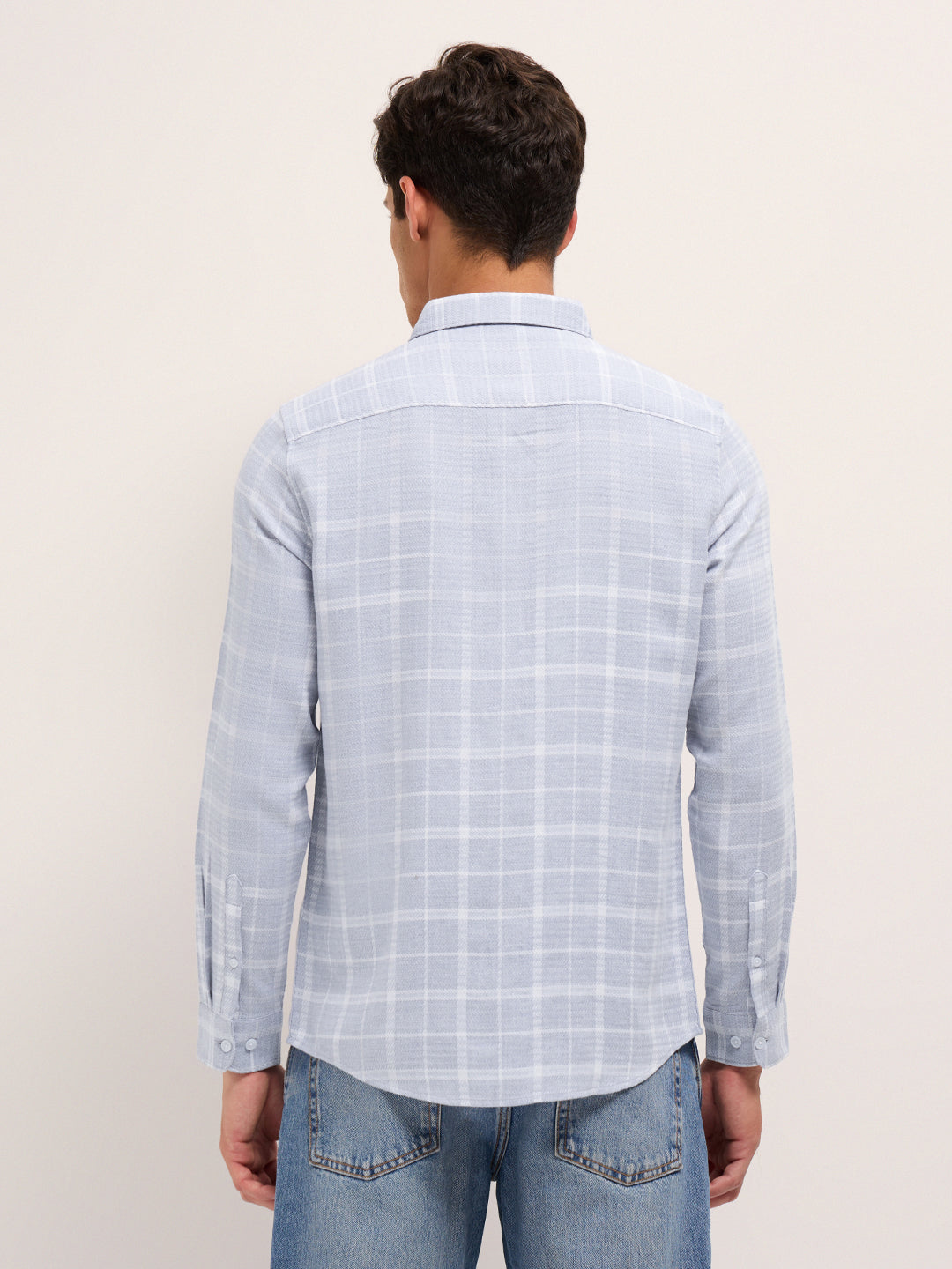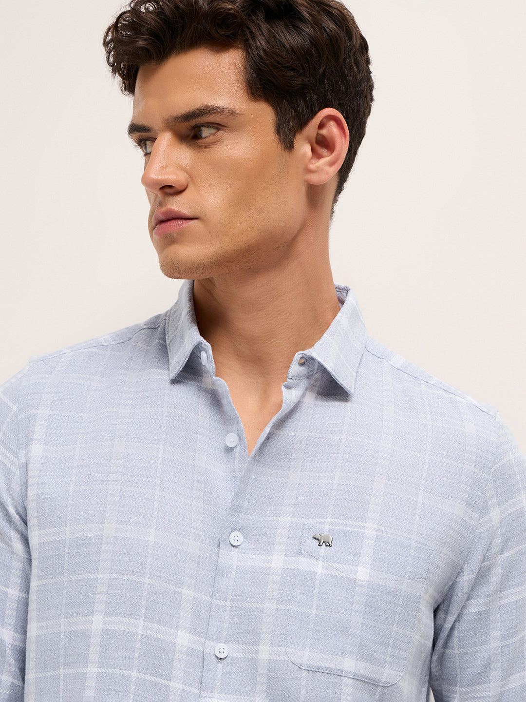 Shop Blue Herringbone Check Slim Fit Casual Shirt Online.