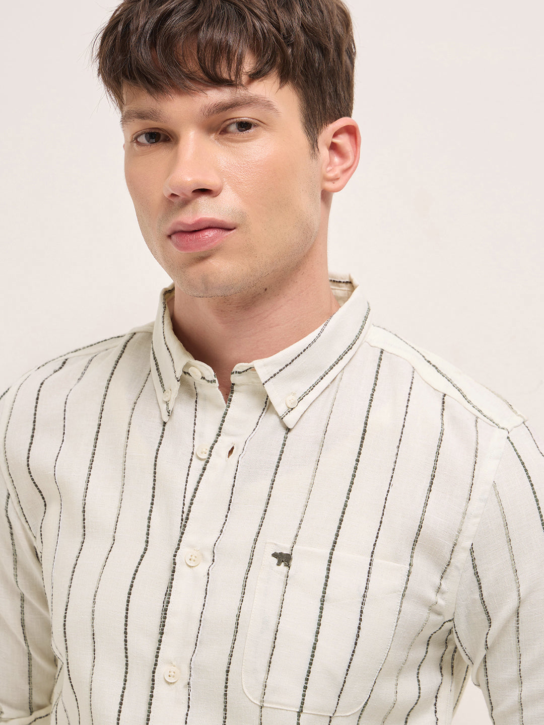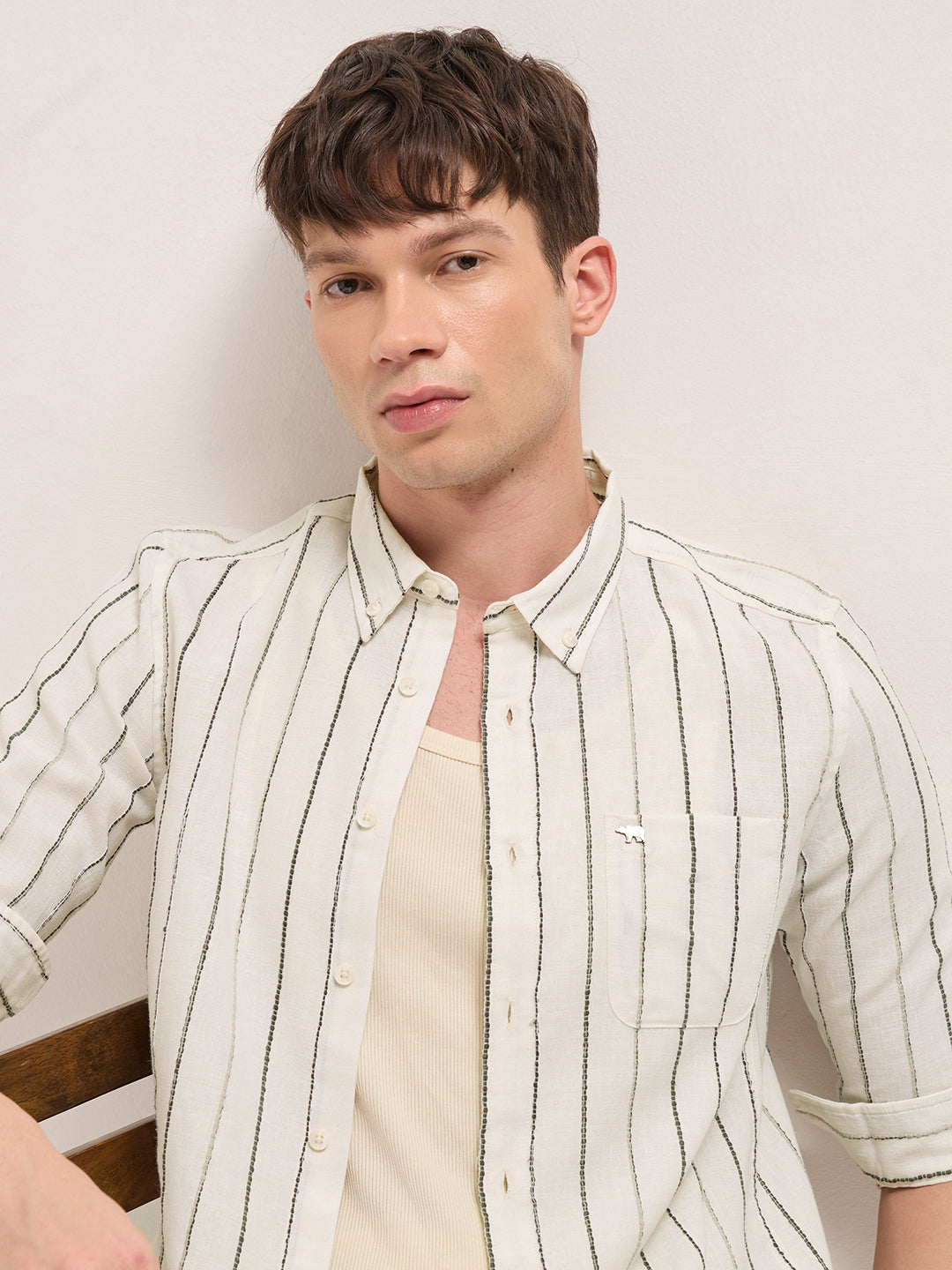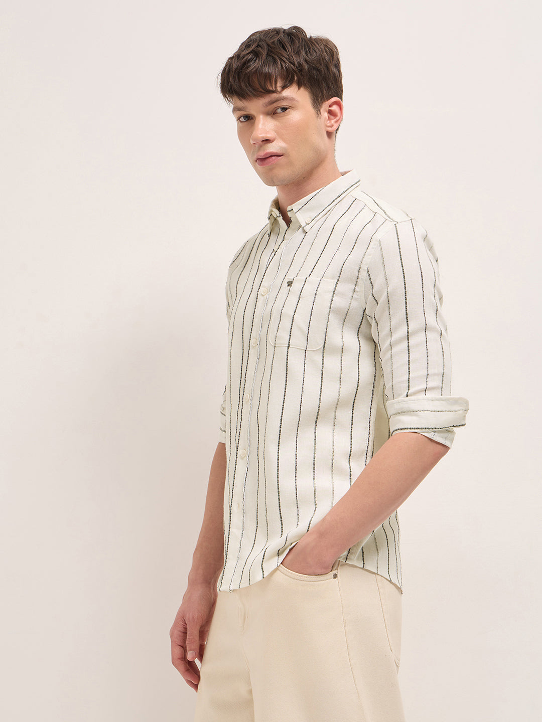 Cream Woven Vertical Stripes Slim Fit Casual Shirt