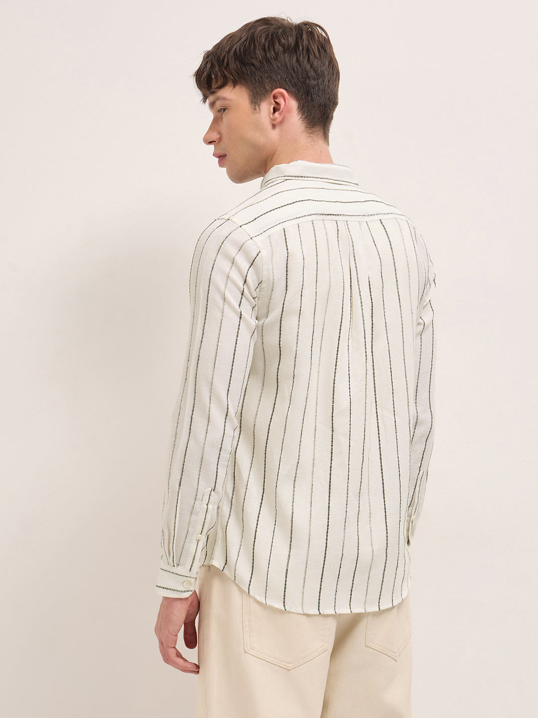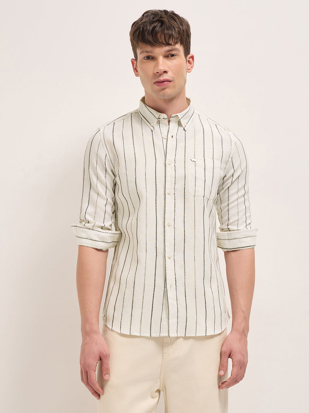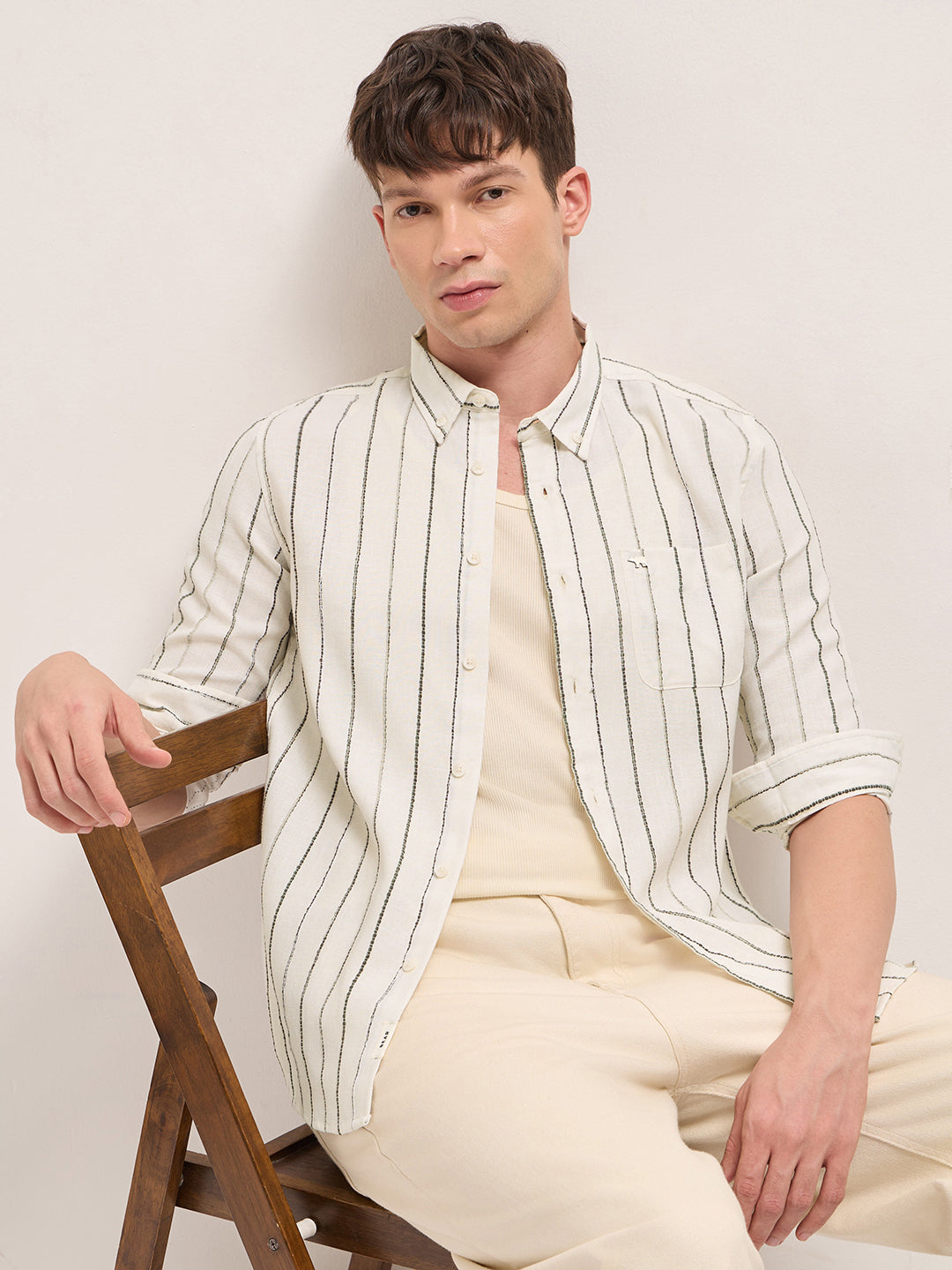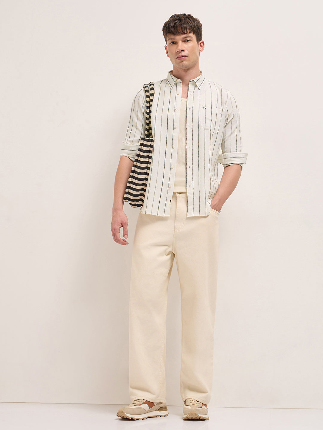 Cream Woven Vertical Stripes Slim Fit Casual Shirt
