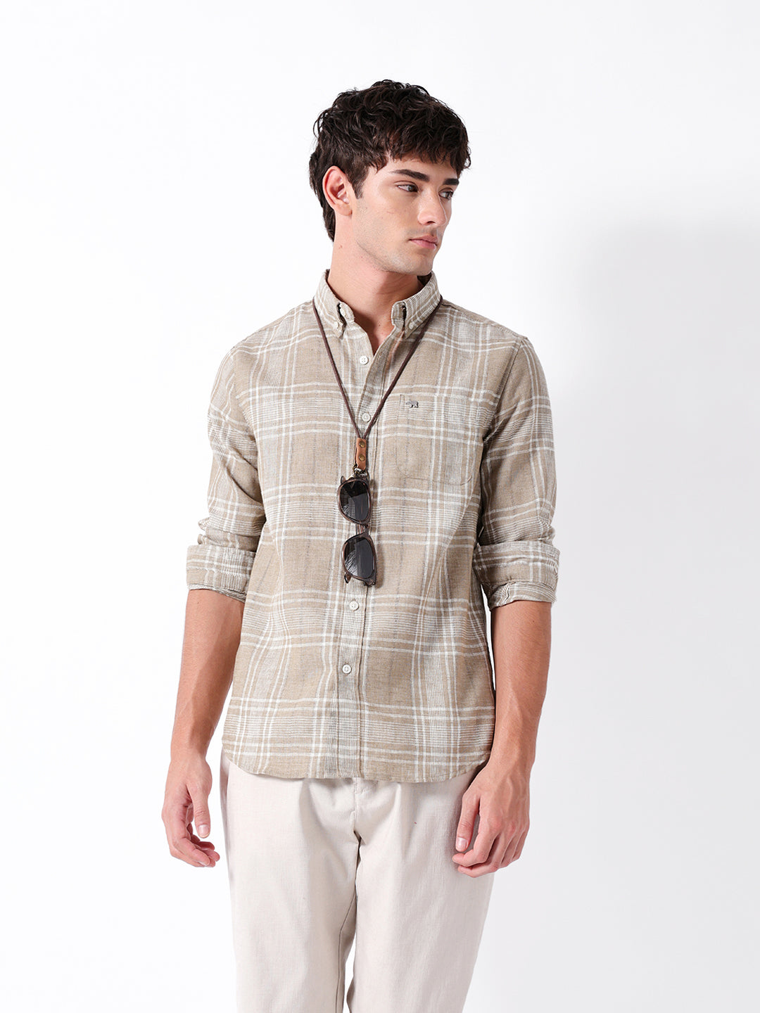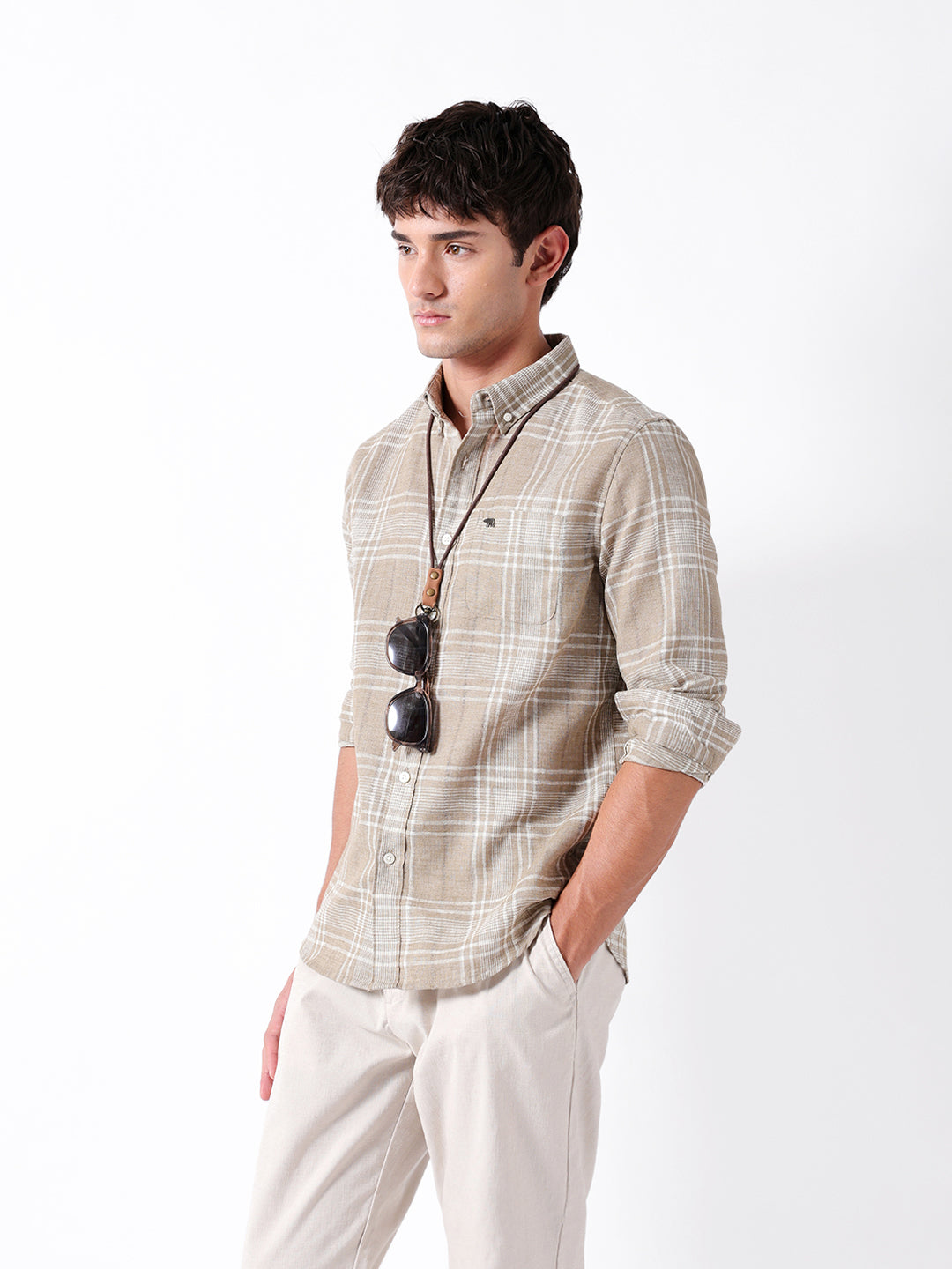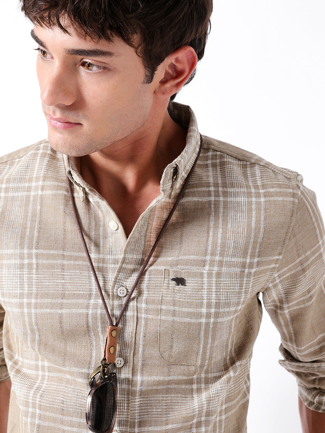 Light Brown Slim Fit Plaid Check Woven Casual Shirt