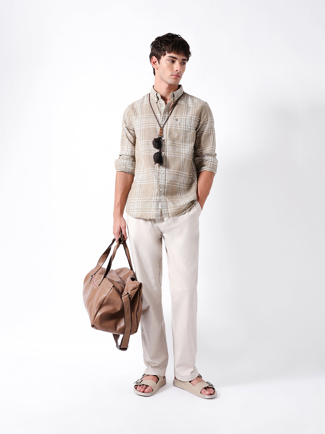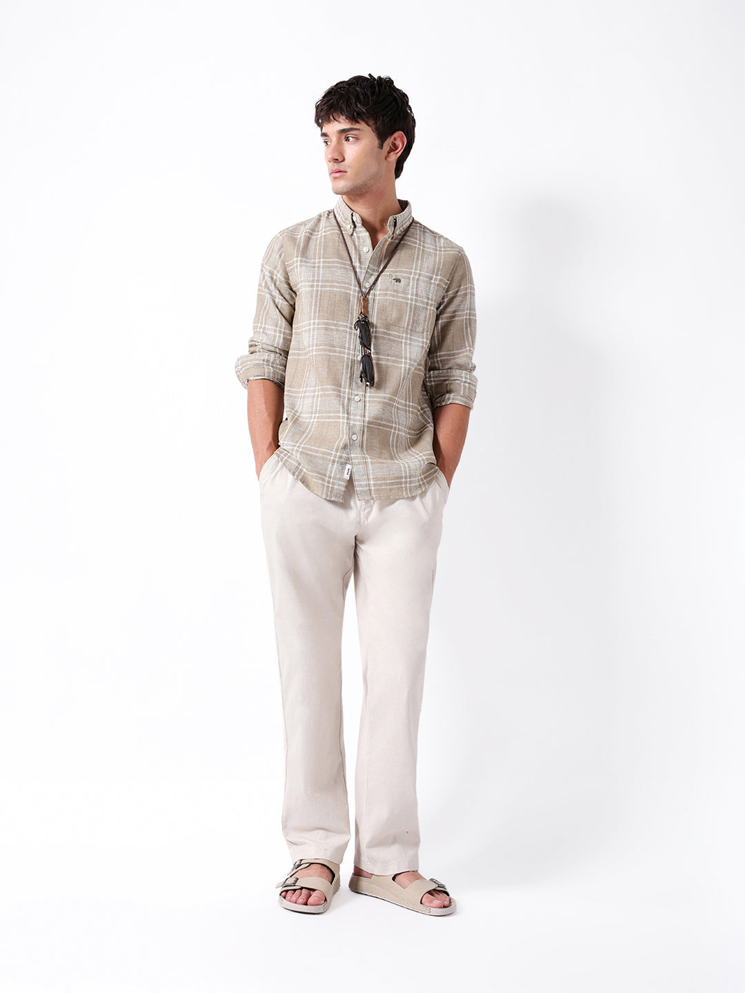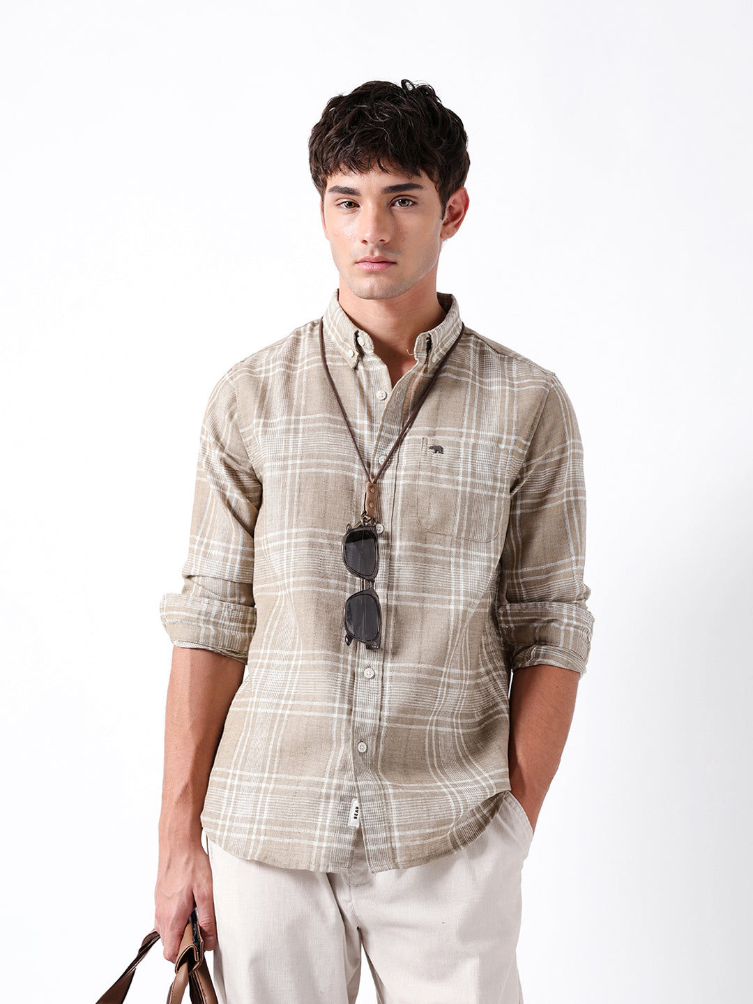 Light Brown Slim Fit Plaid Check Woven Casual Shirt
