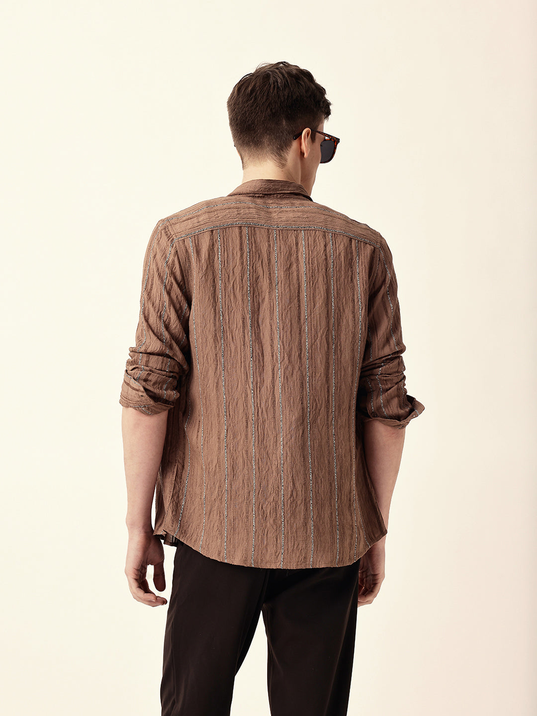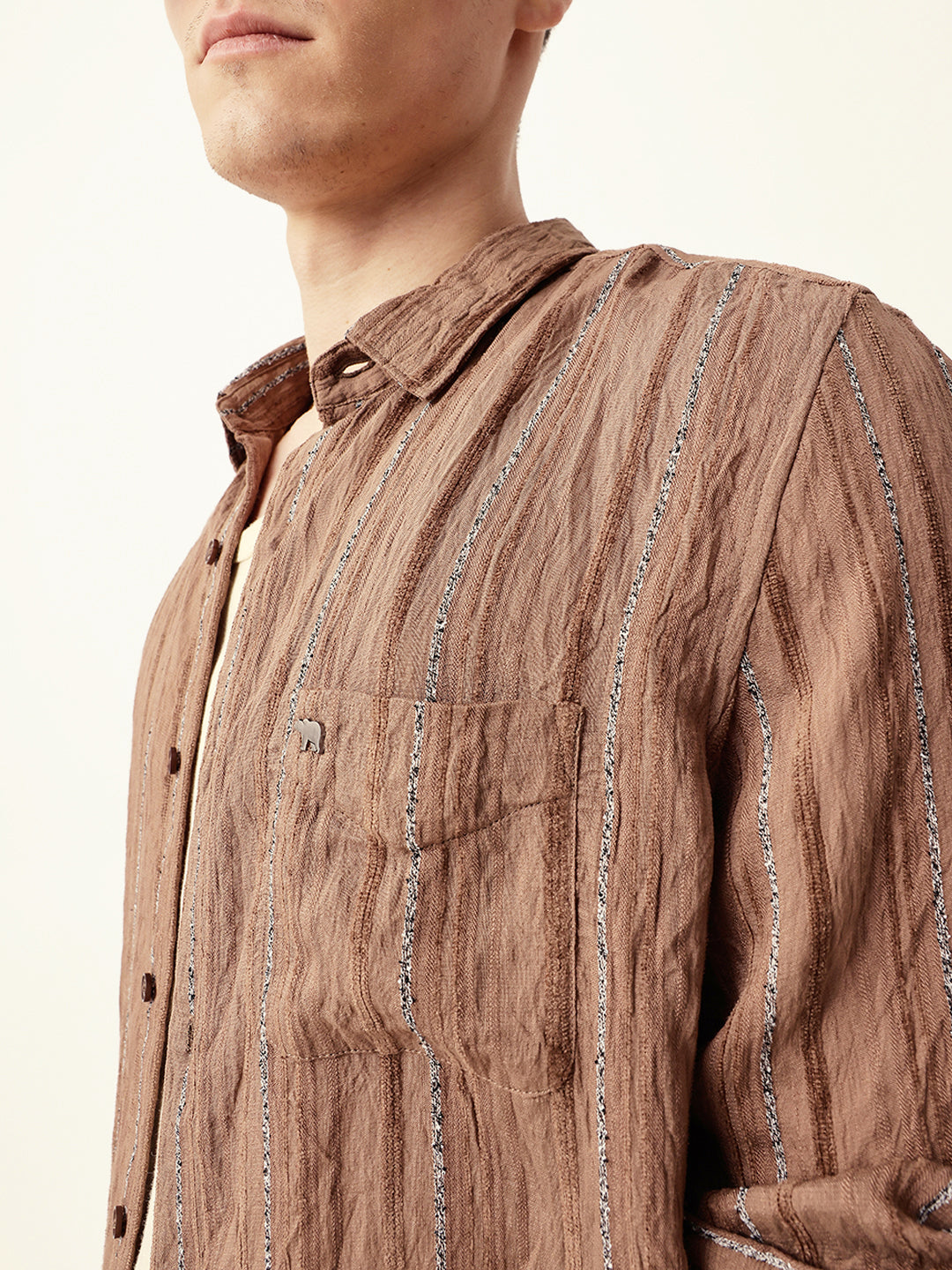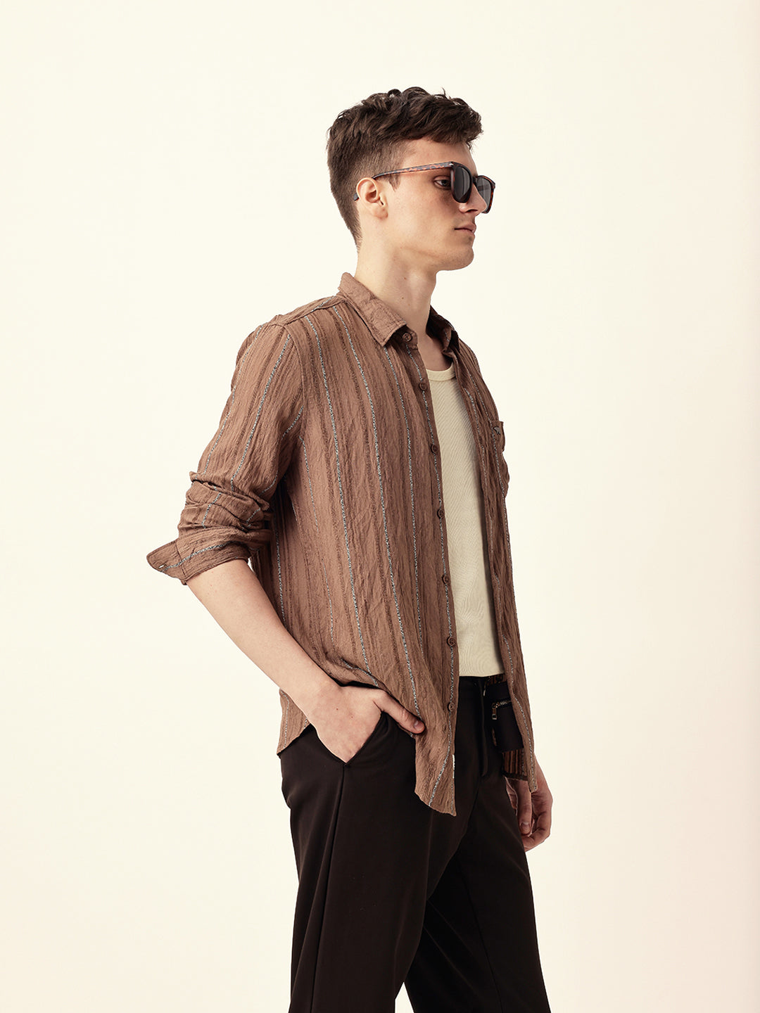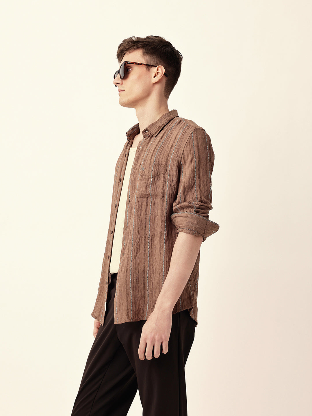 Rust Vertical Seersucker Pinstripe Slim Fit Casual Shirt