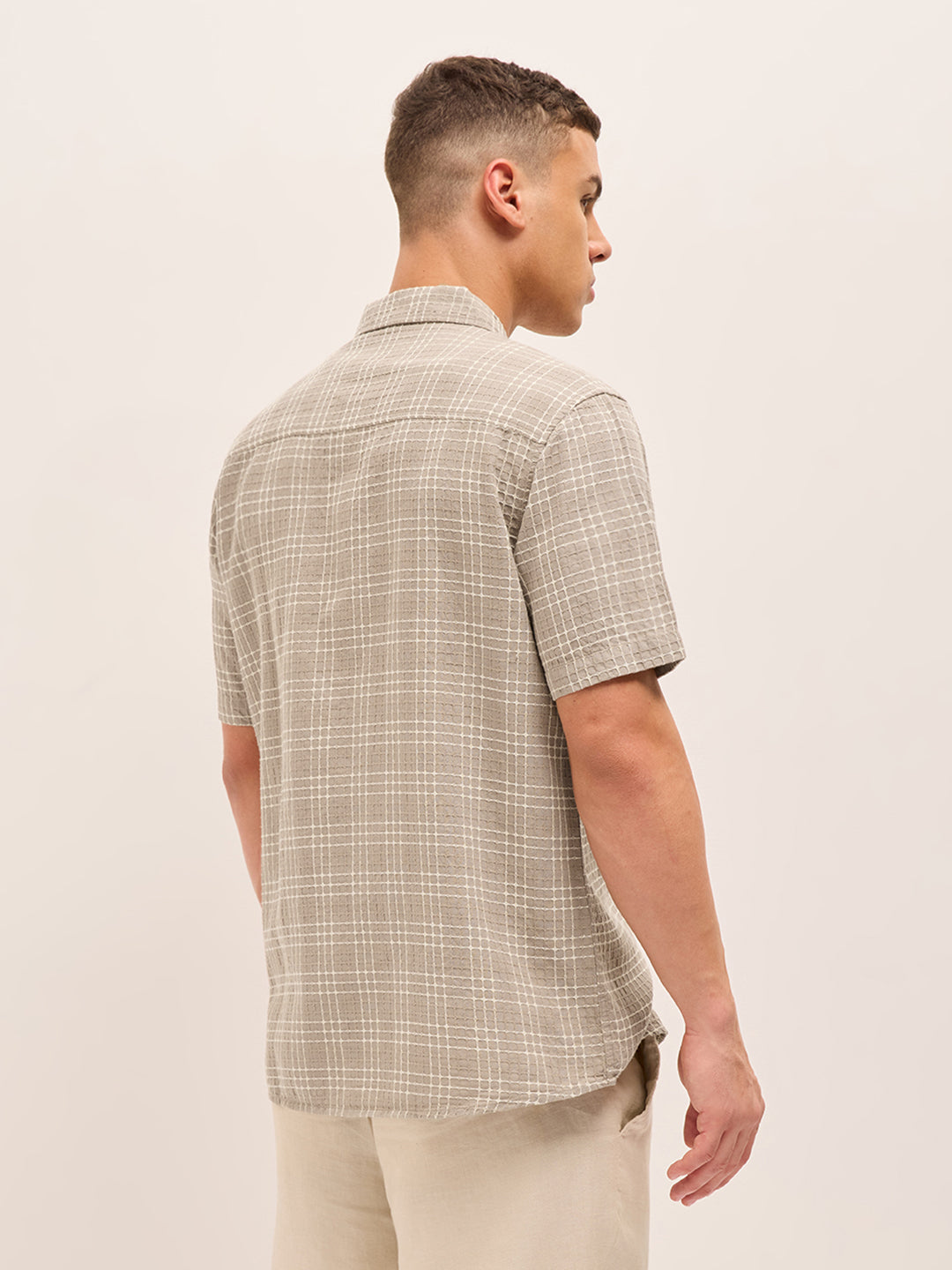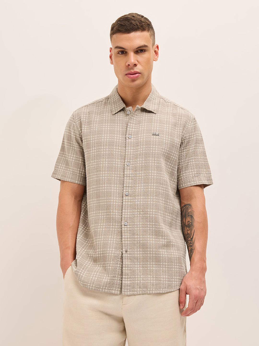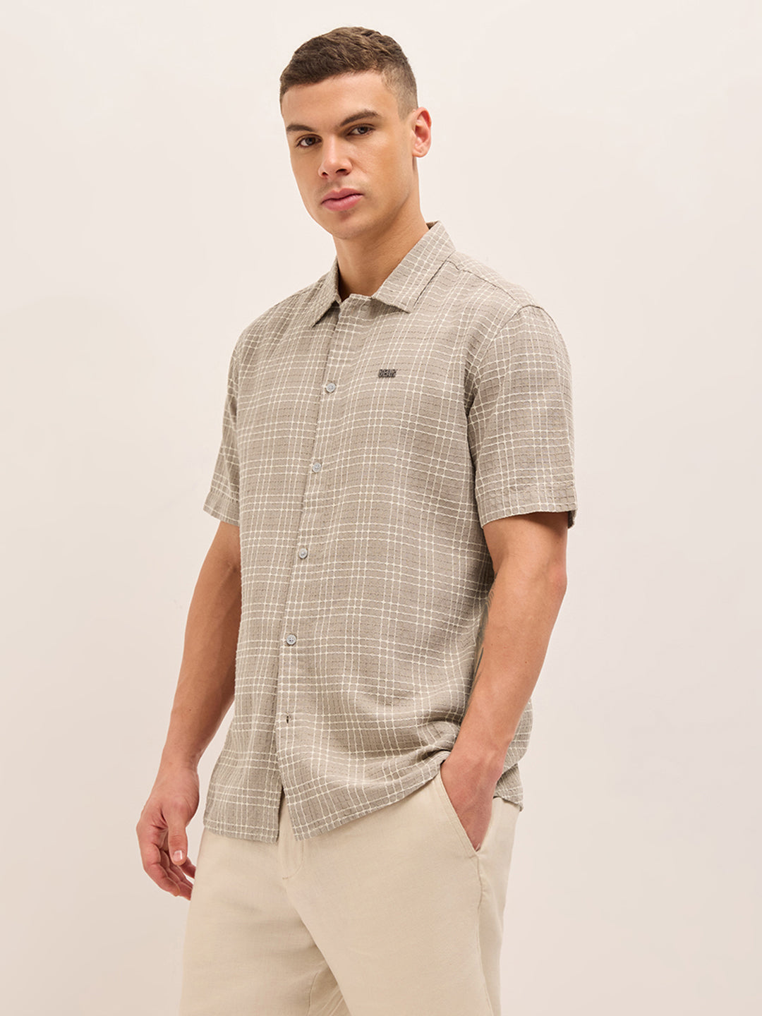 Shop Beige Textured Checked Regular Fit Half-Sleeve Casual Shirt Online.