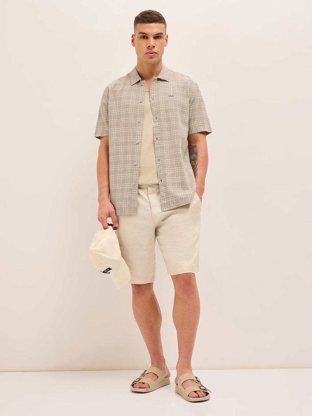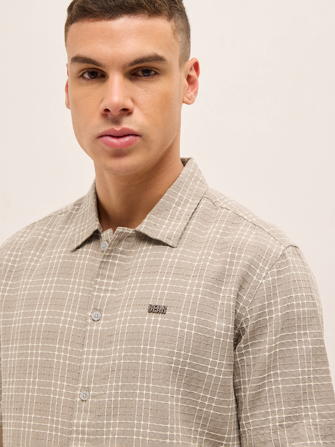 Beige Textured Checked Regular Fit Half-Sleeve Casual Shirt