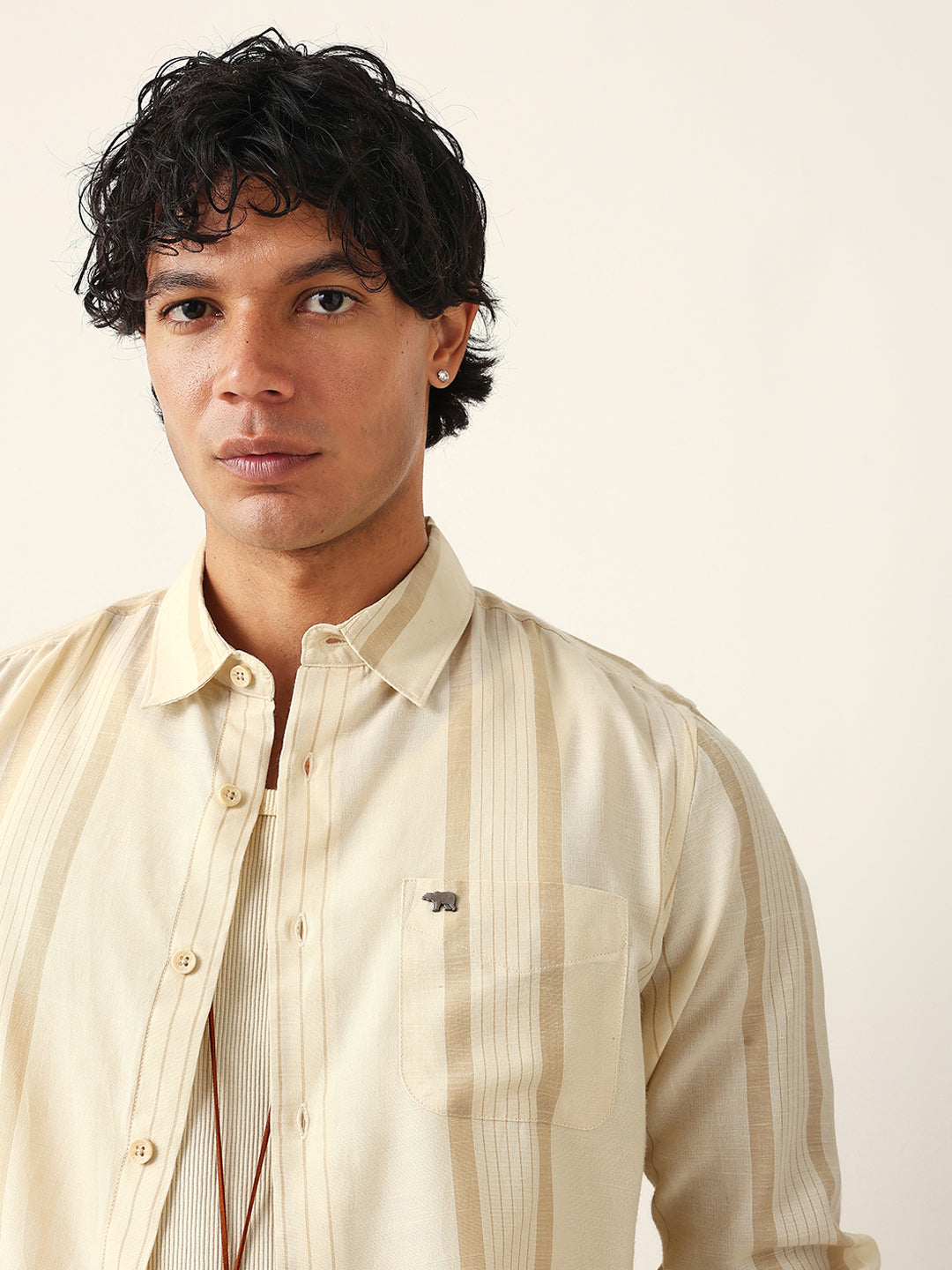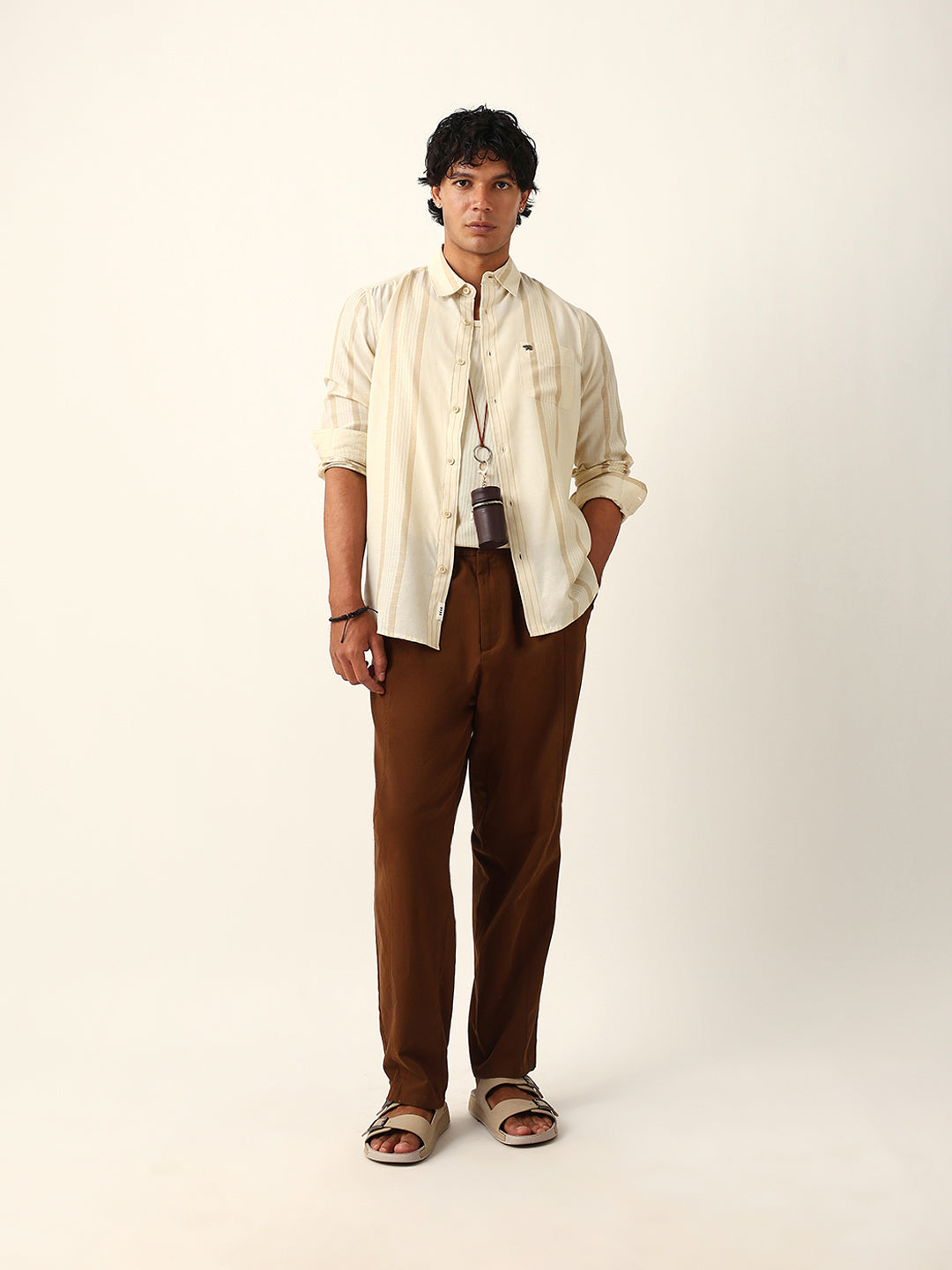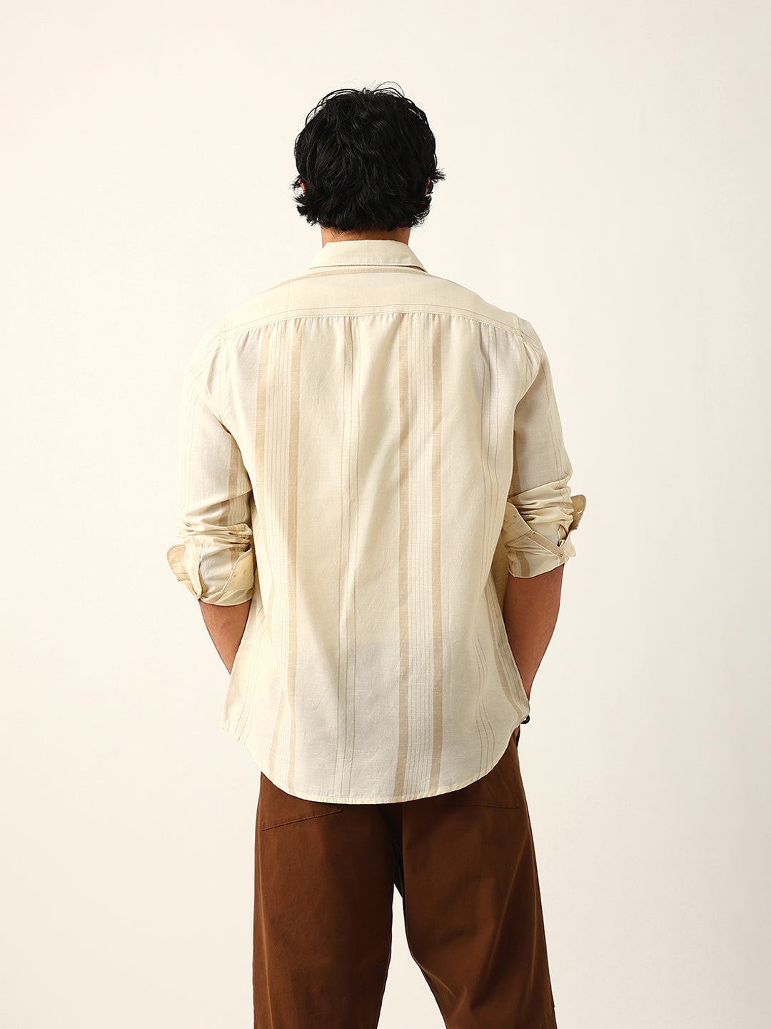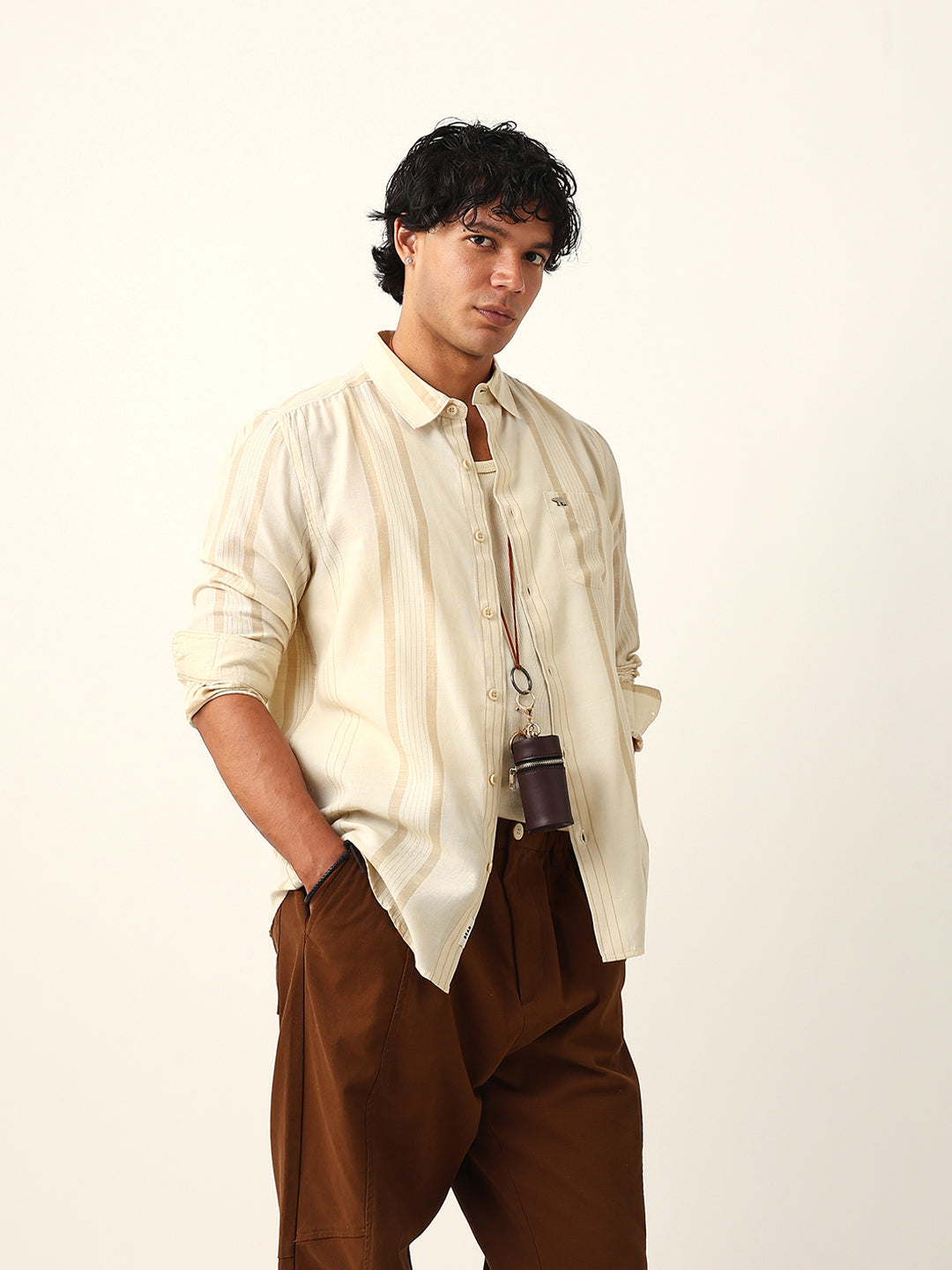 Cream Woven Vertical Striped Slim Fit Casual Shirt