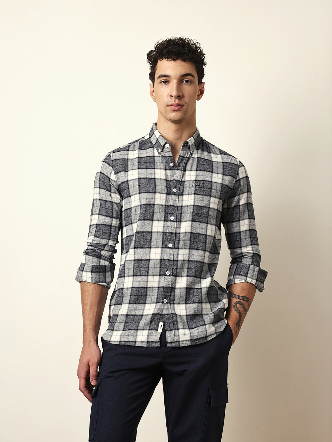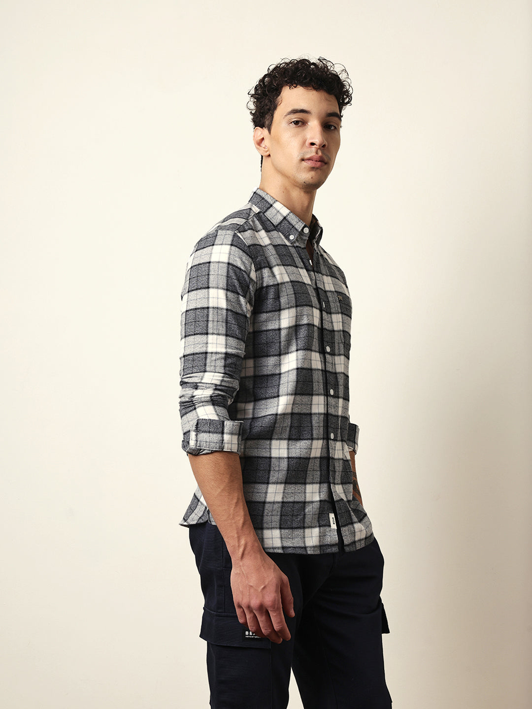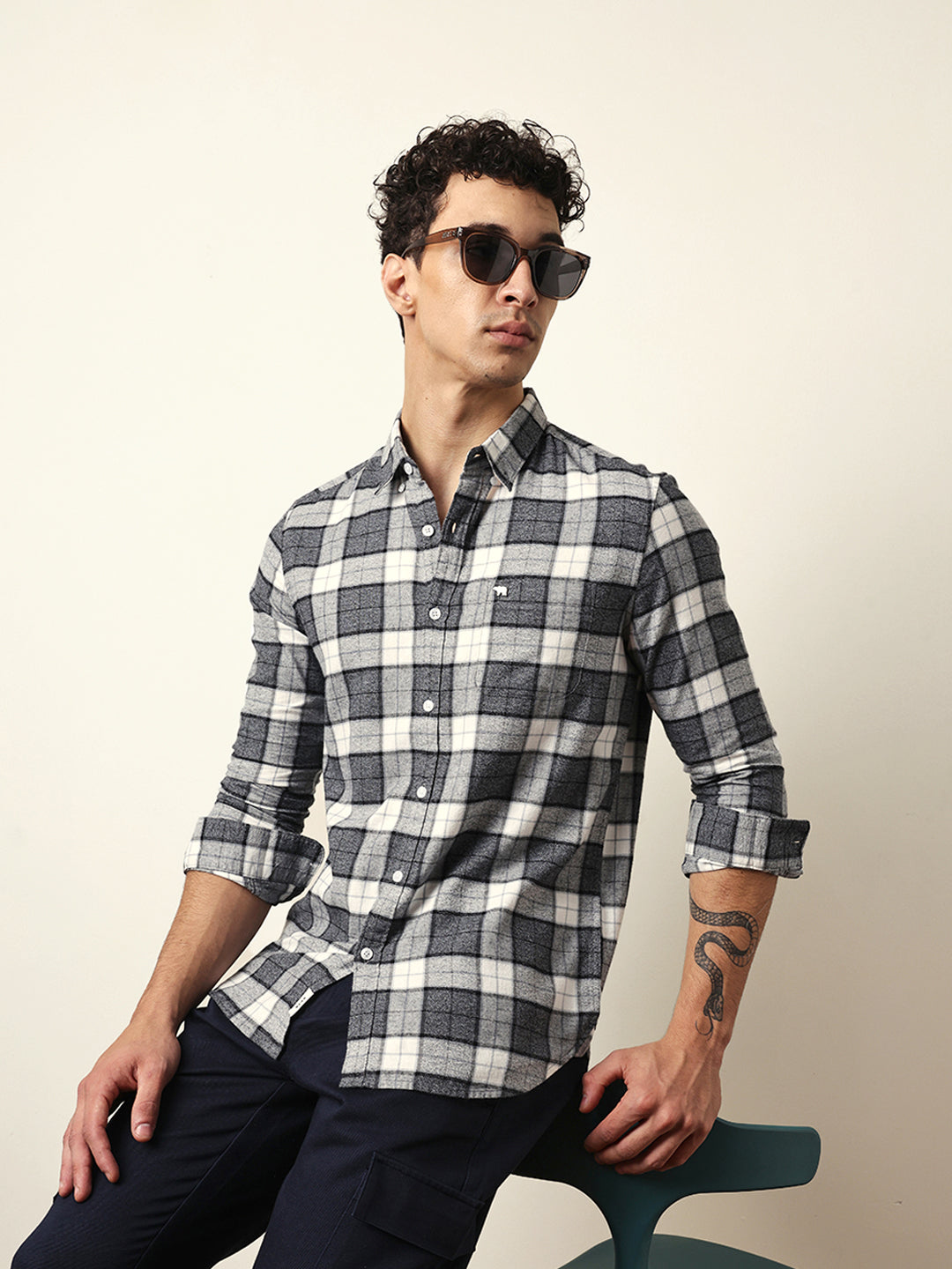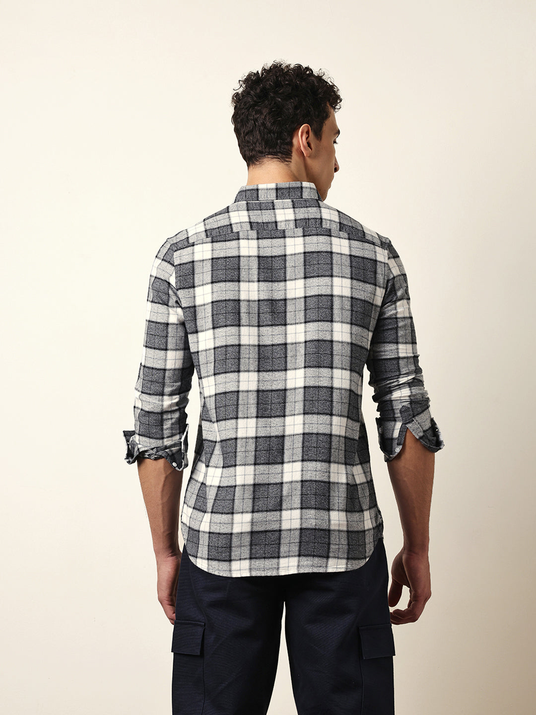 White with Grey Woven Tartan Checked Slim Fit Casual Shirt