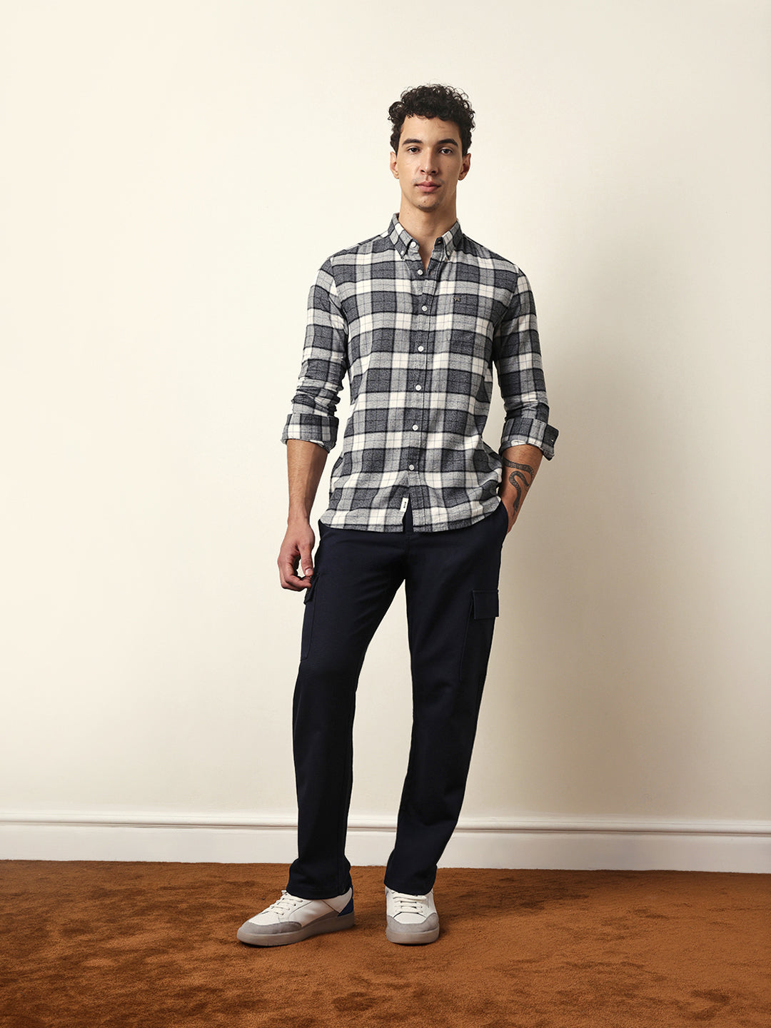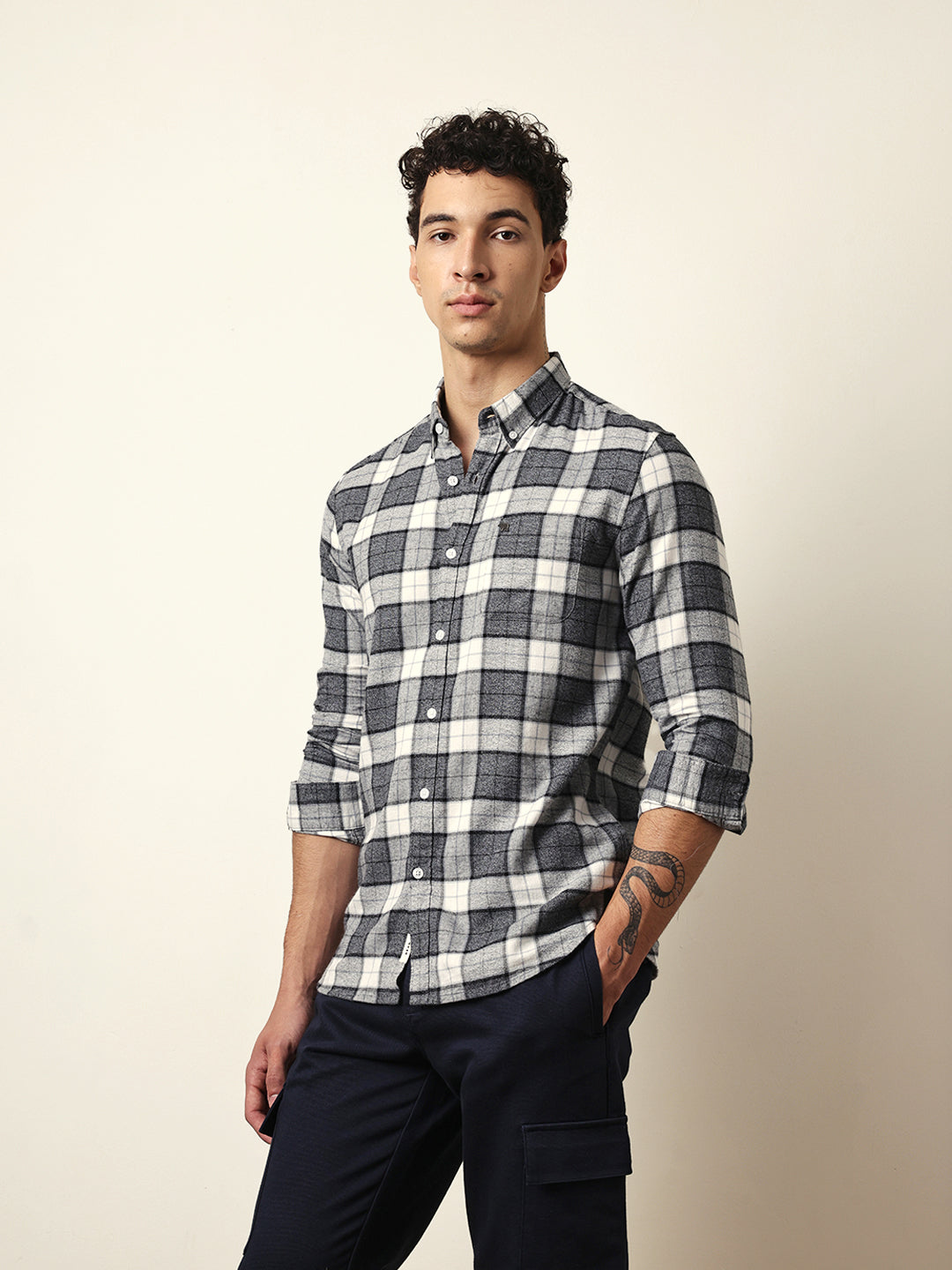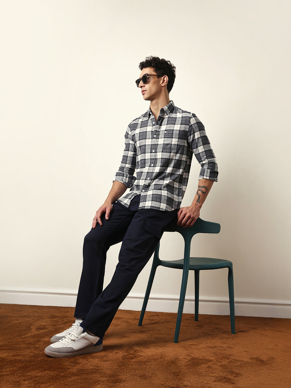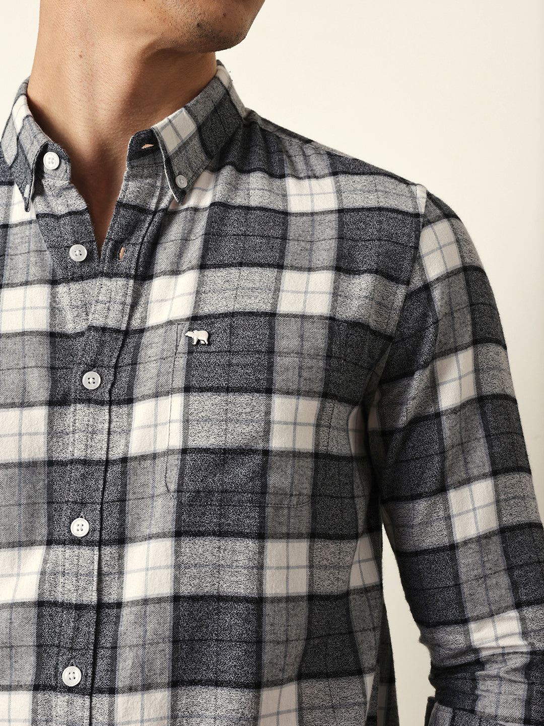 White with Grey Woven Tartan Checked Slim Fit Casual Shirt