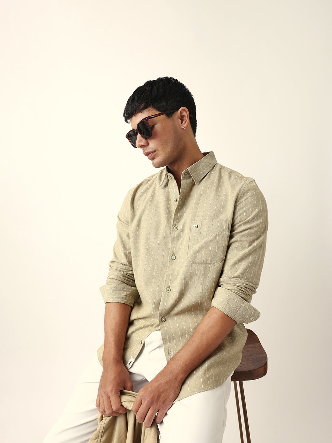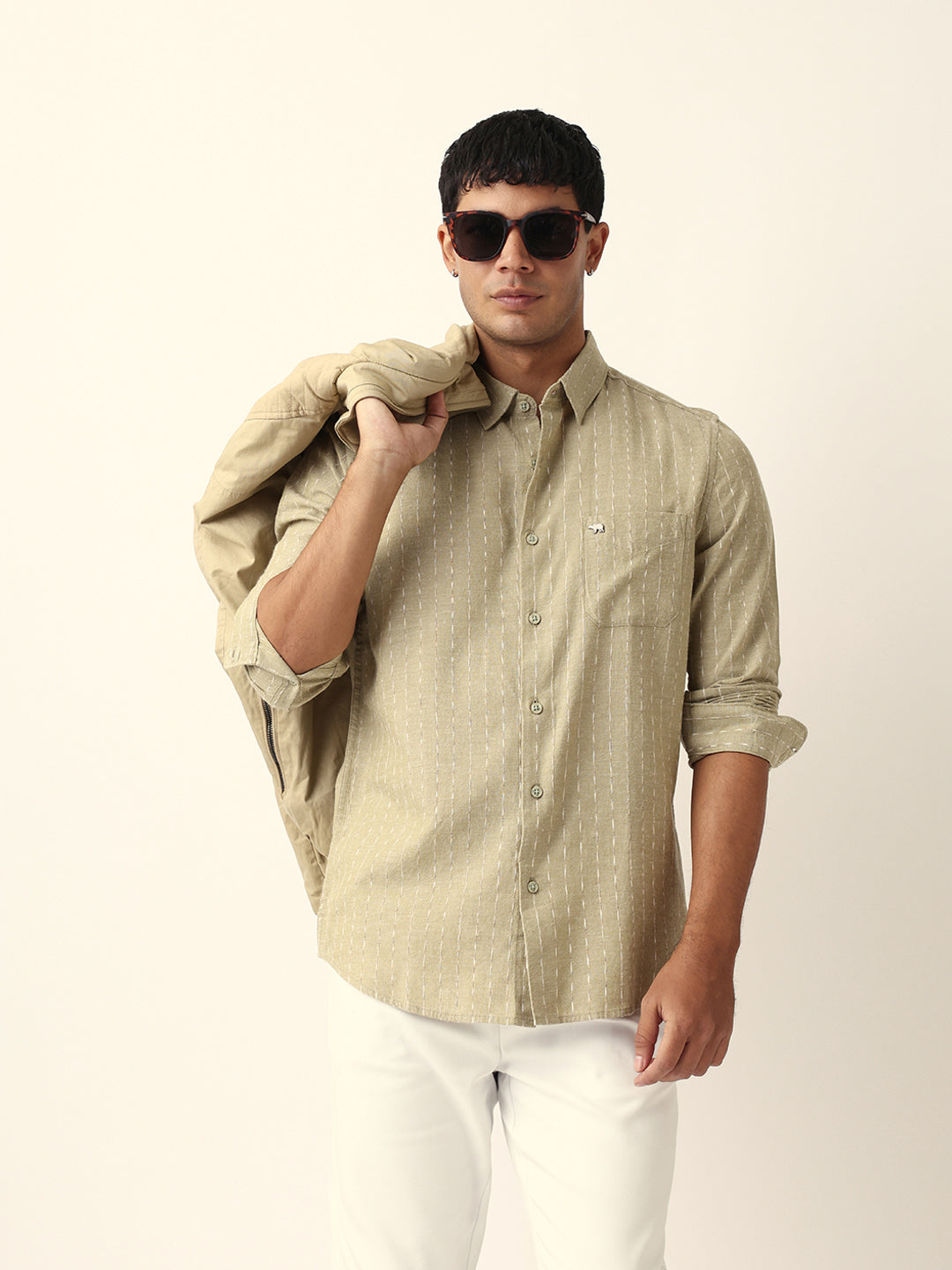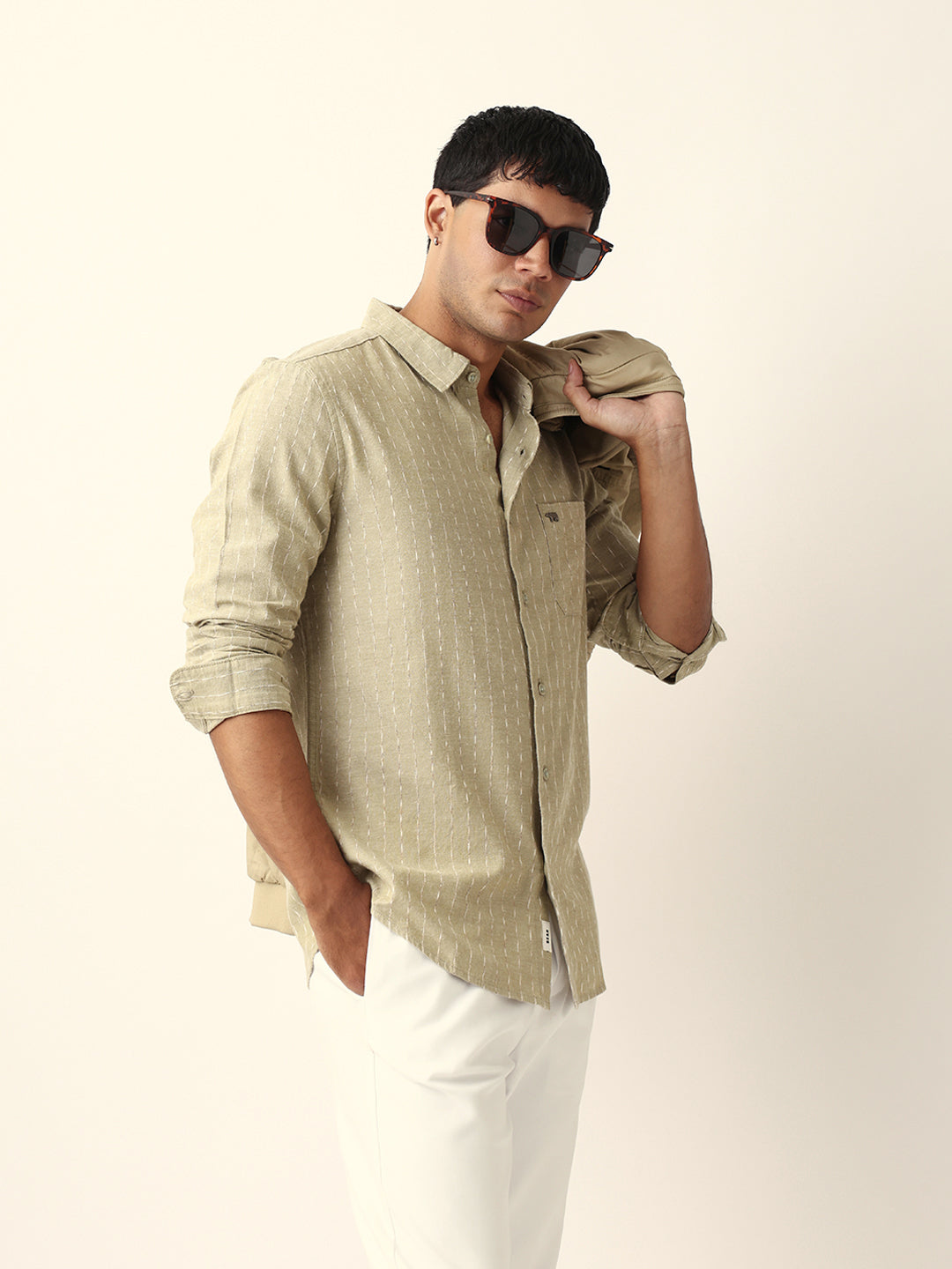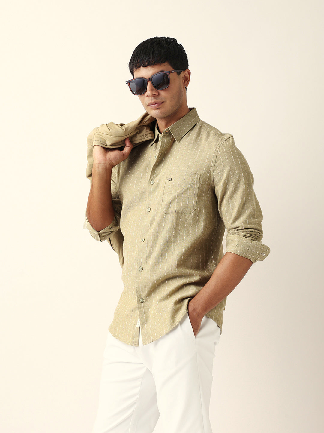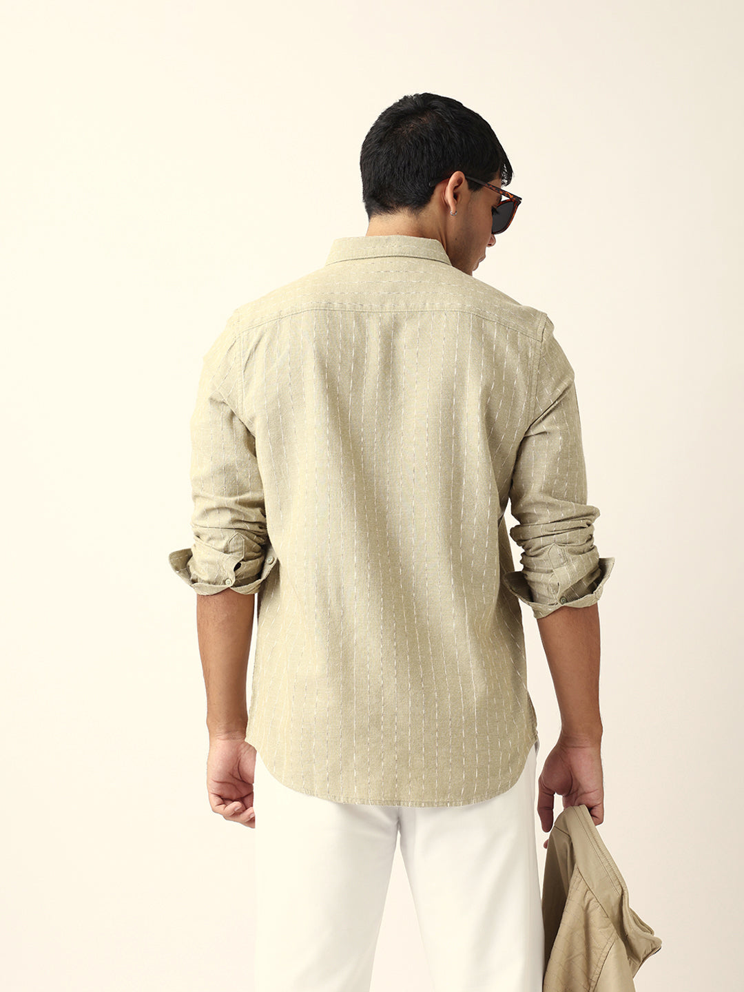 Shop Green Vertical Striped Slim Fit Casual Shirt with Textured Stitch Detailing Online.