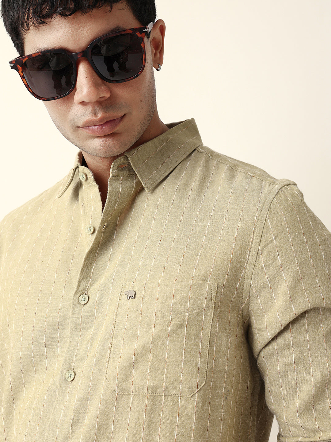 Green Vertical Striped Slim Fit Casual Shirt with Textured Stitch Detailing