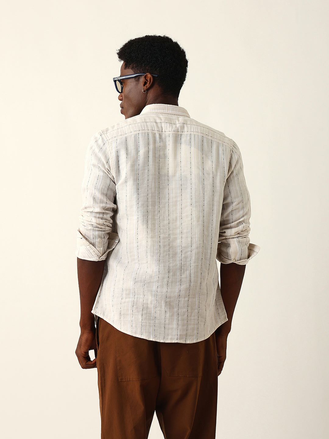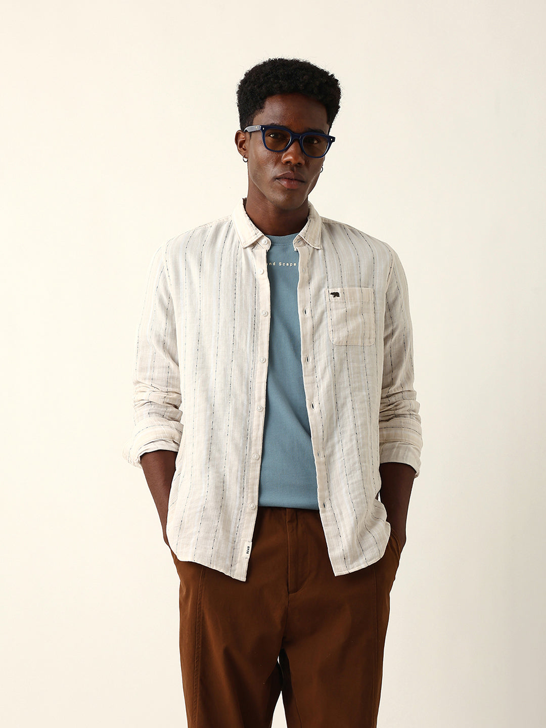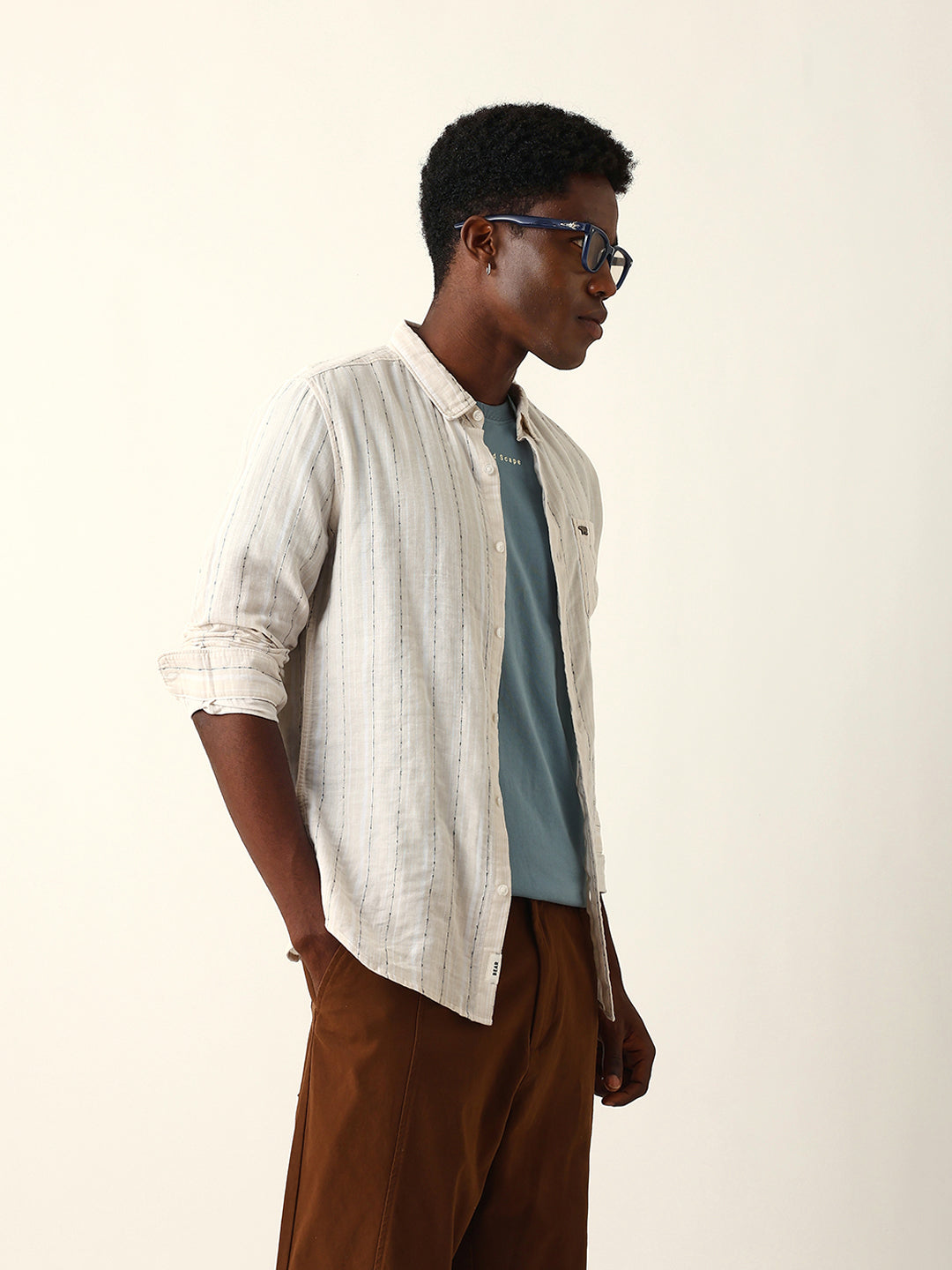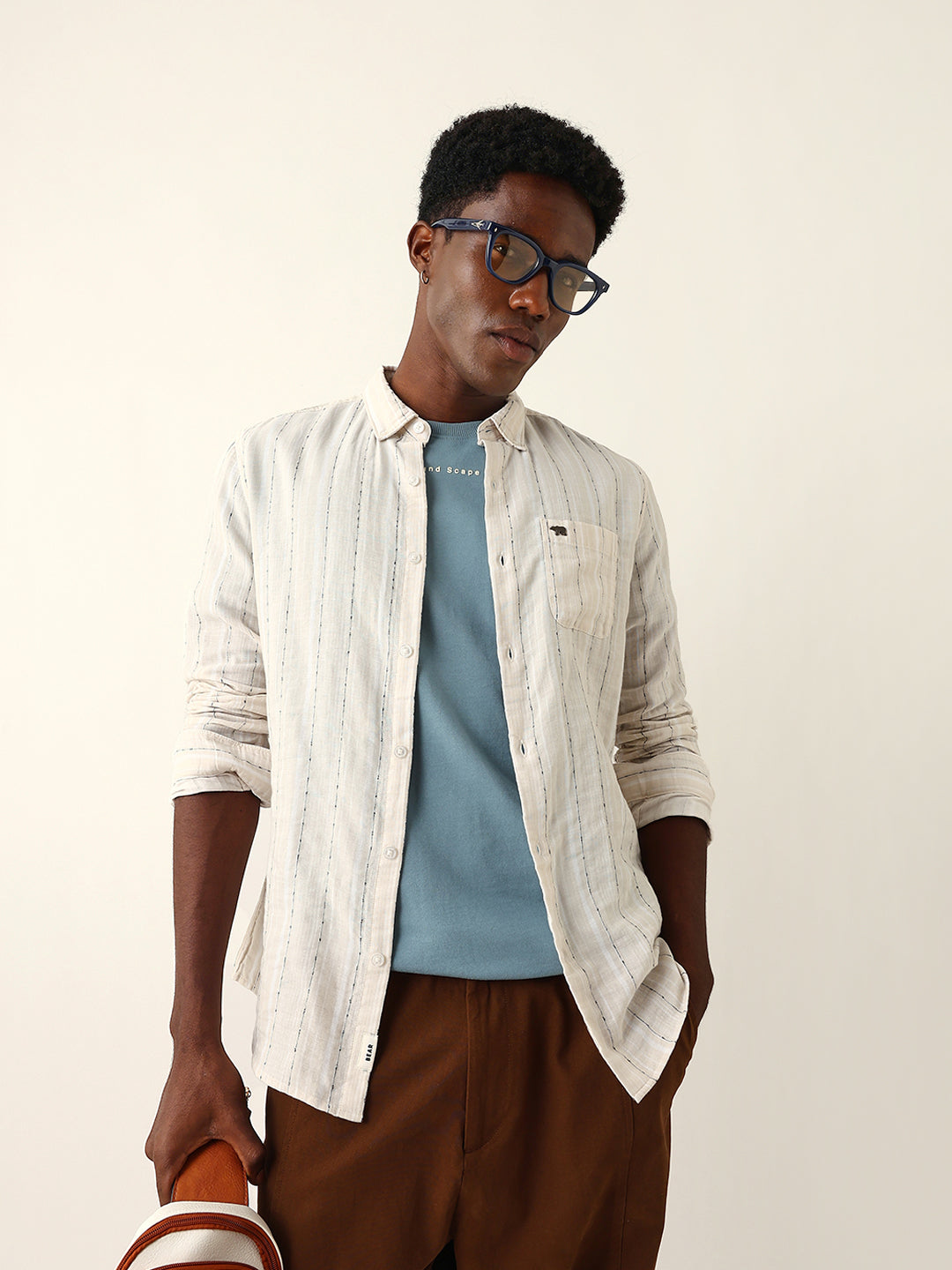 Shop Cream Woven Vertical Striped Slim Fit Casual Shirt Online.