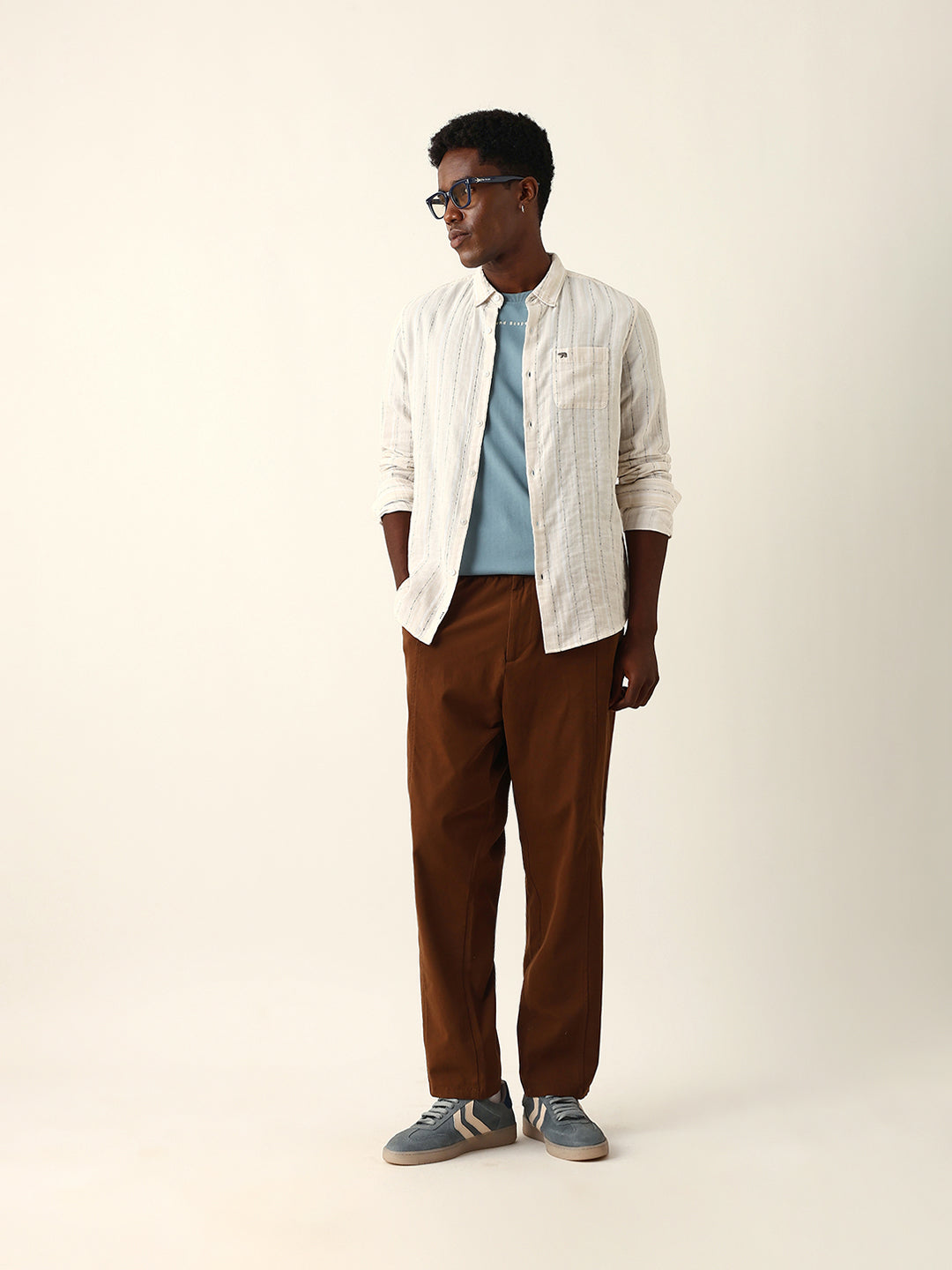 Cream Woven Vertical Striped Slim Fit Casual Shirt