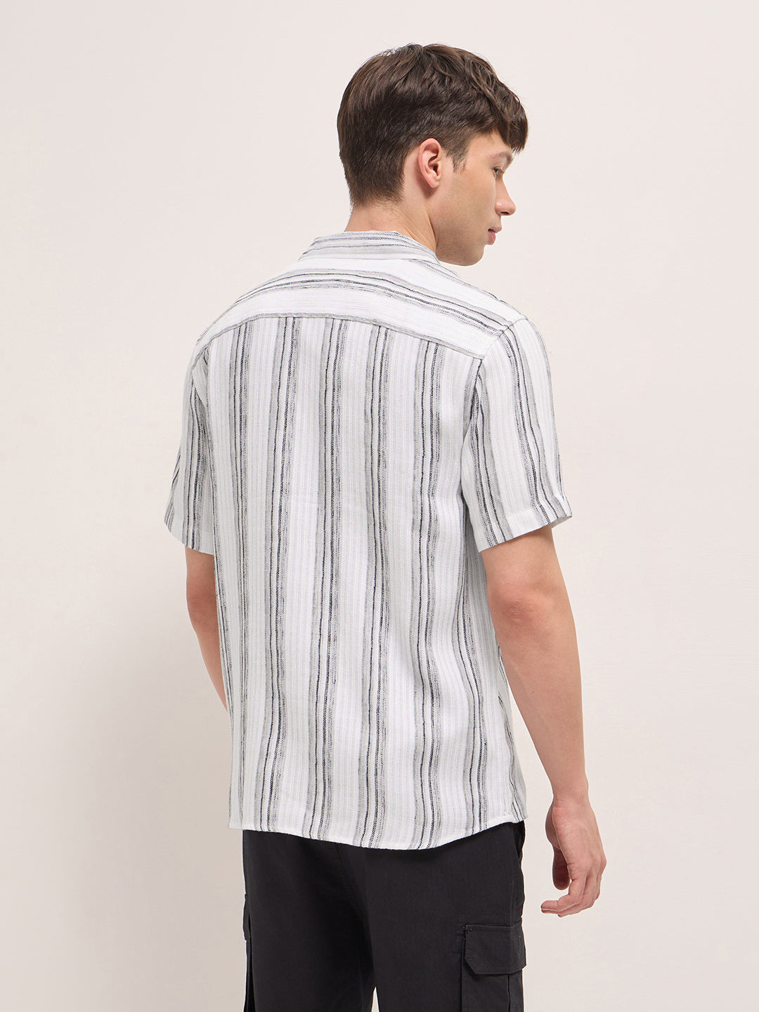 White Woven Vertical Stripe Regular Fit Half-Sleeve Casual Shirt
