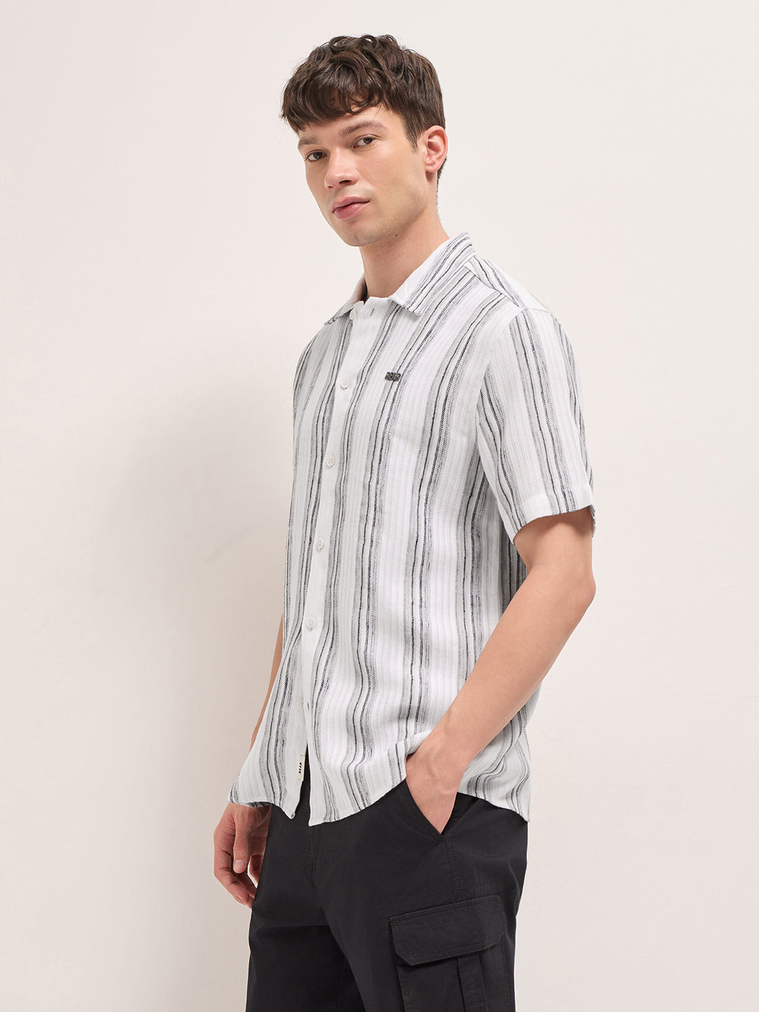 Shop White Woven Vertical Stripe Regular Fit Half-Sleeve Casual Shirt Online.