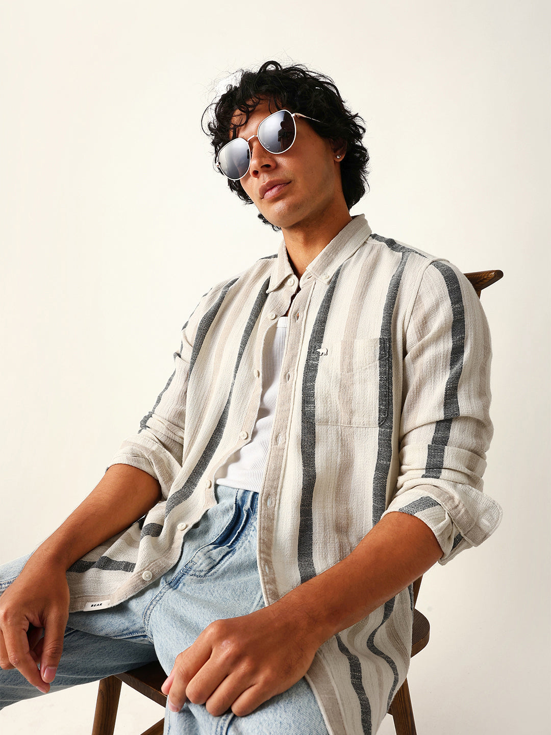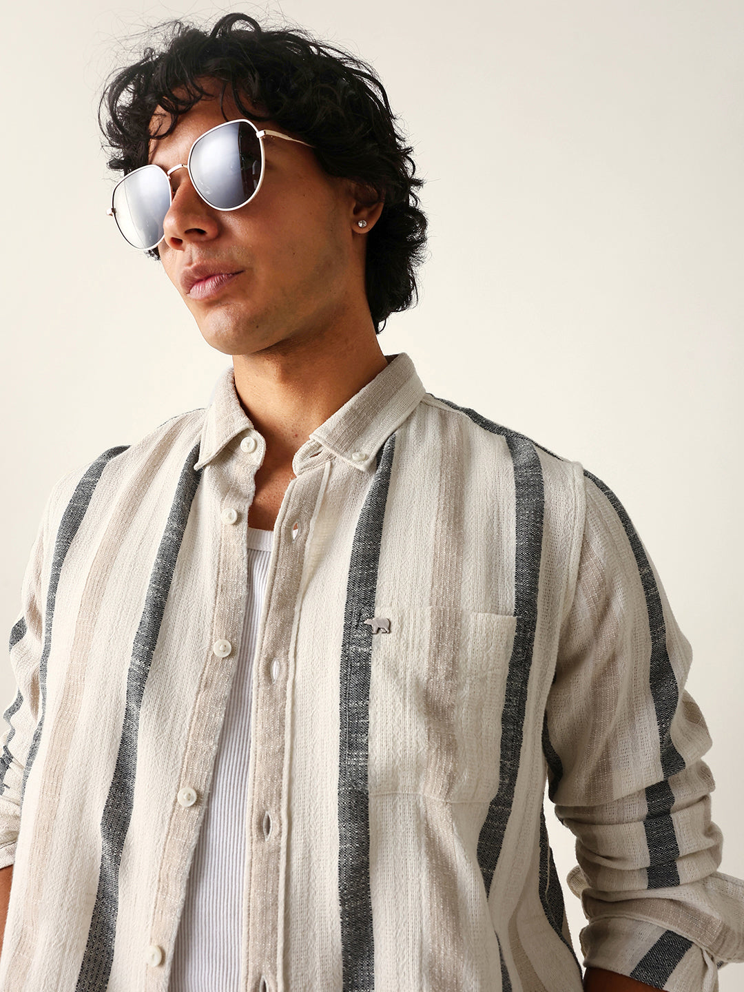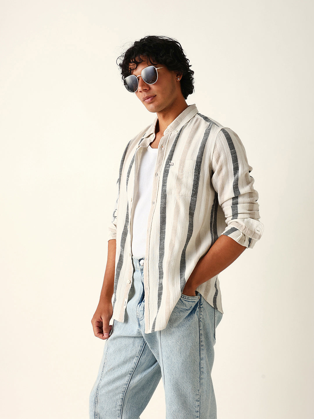 Shop Cream Woven Vertical Stripes Slim Fit Casual Shirt Online.