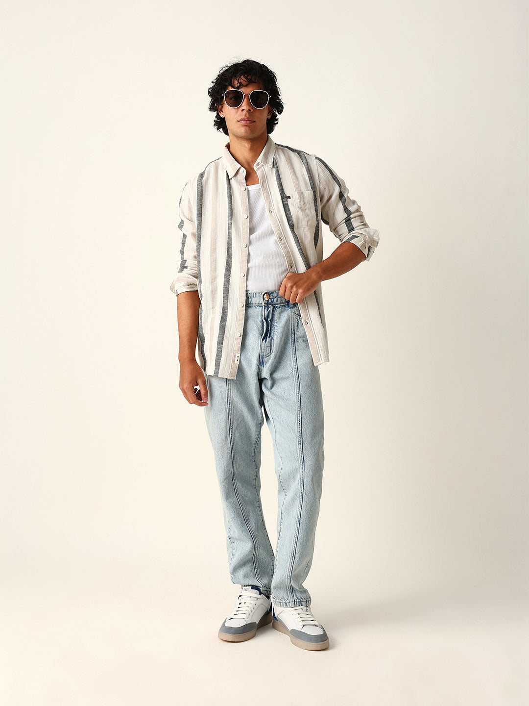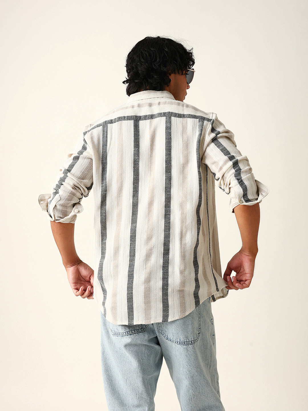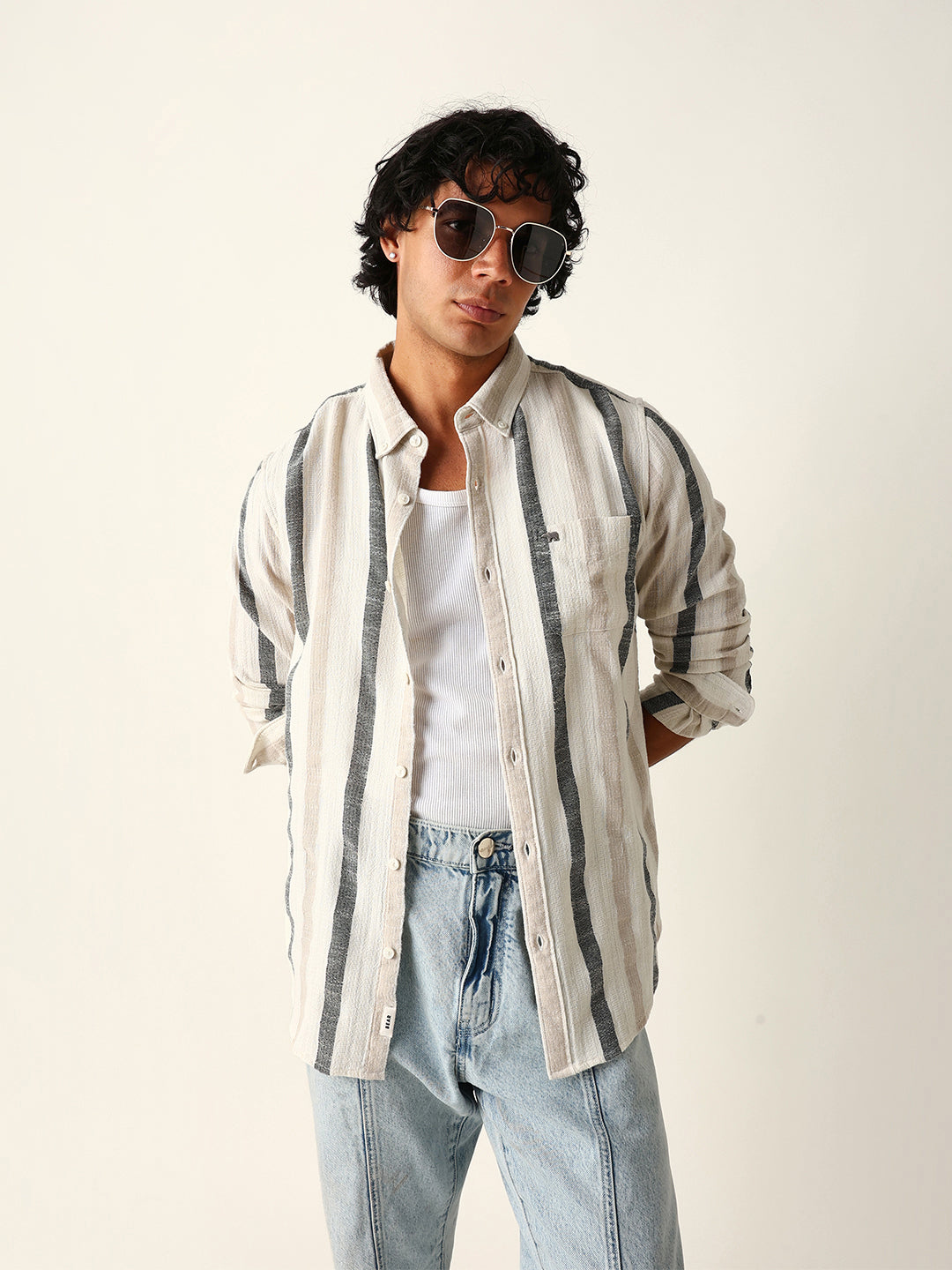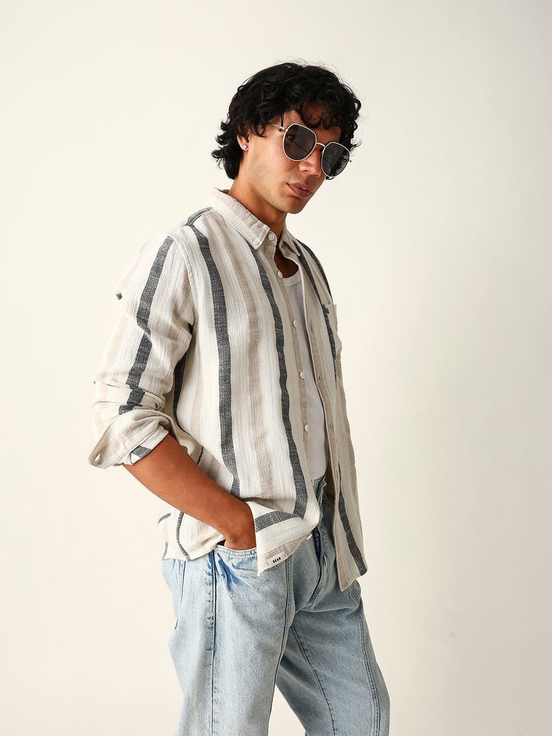 Shop Cream Woven Vertical Stripes Slim Fit Casual Shirt Online.