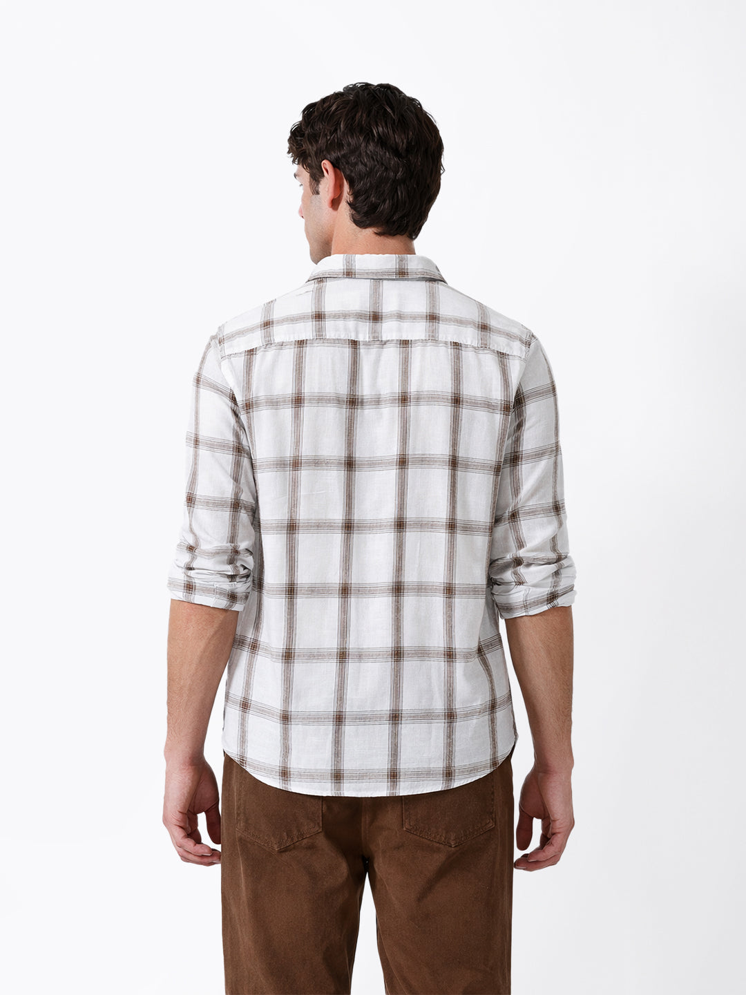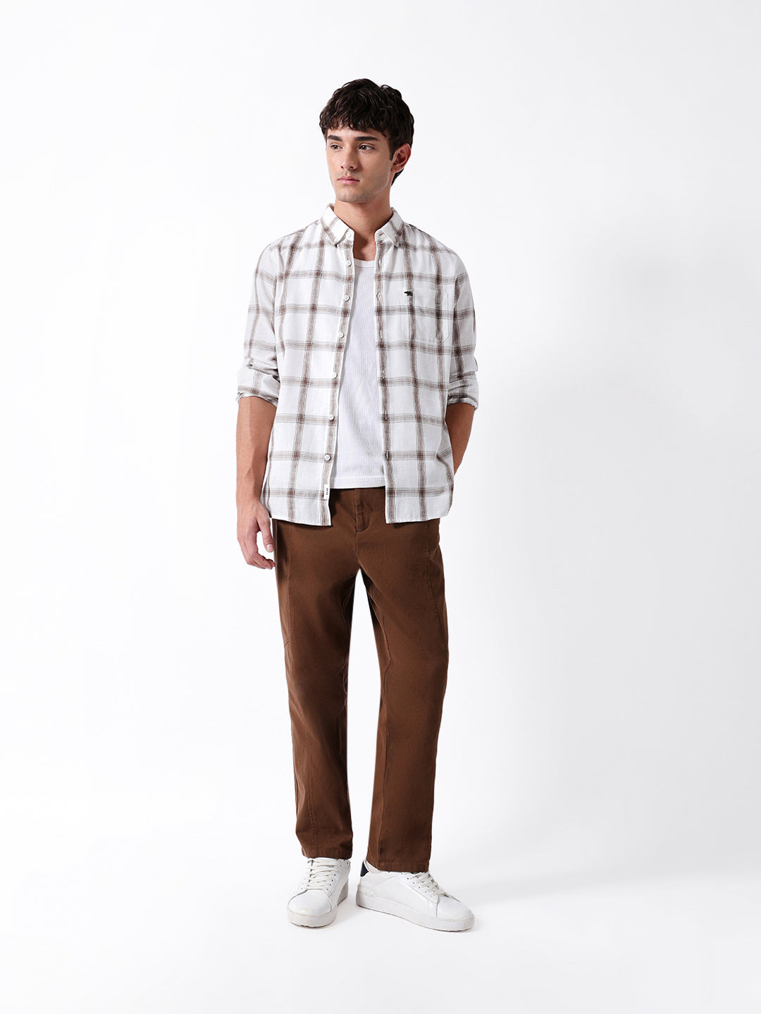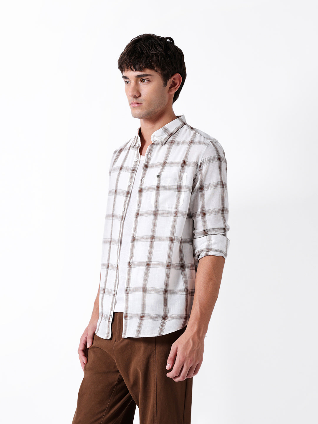 White & Brown Woven Checked Slim Fit Casual Shirt