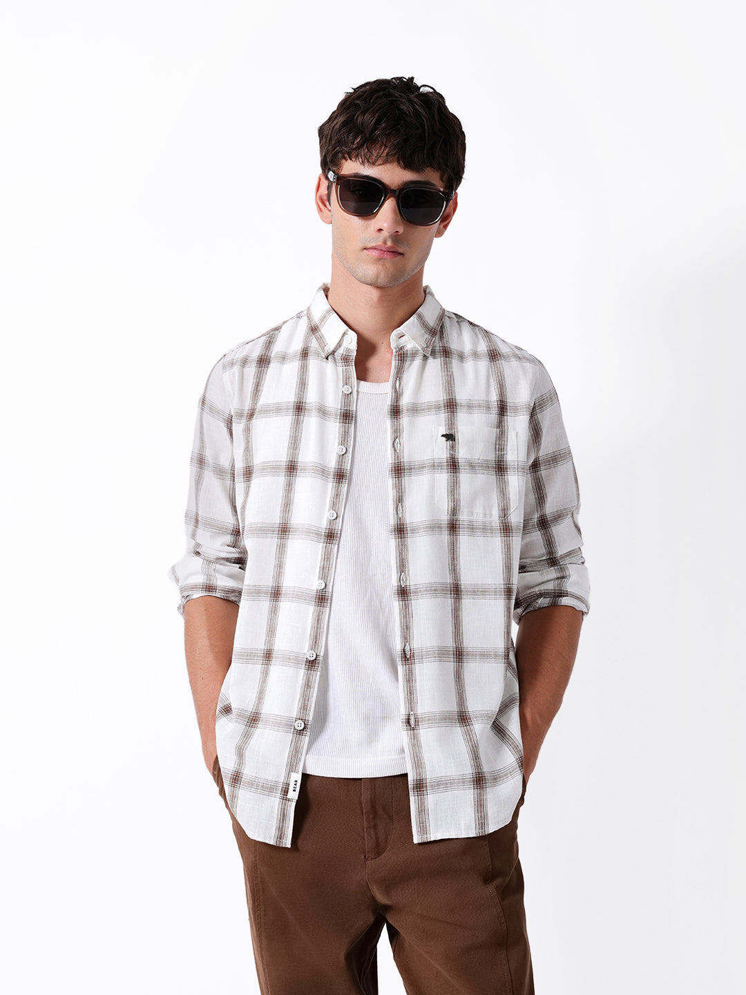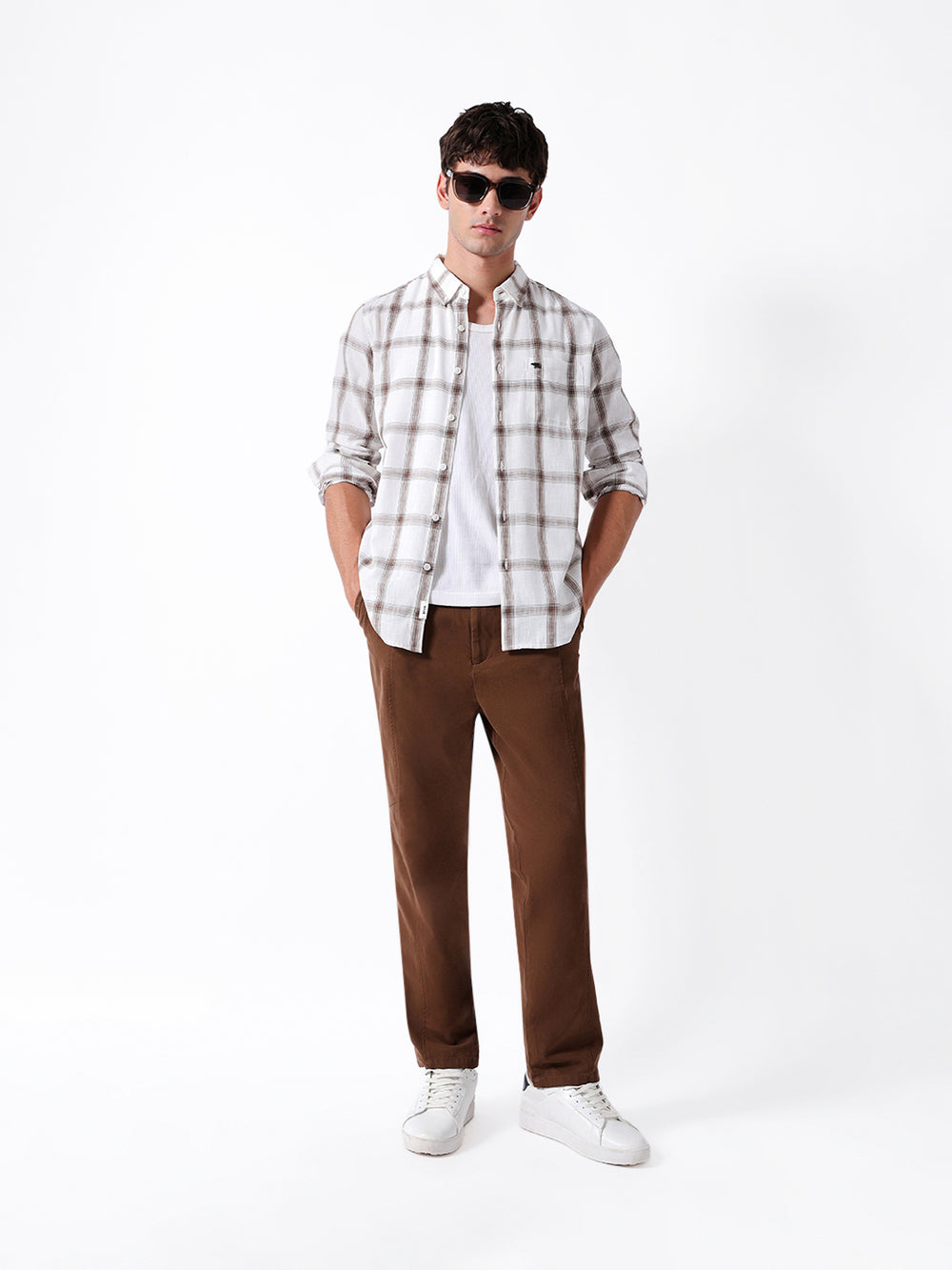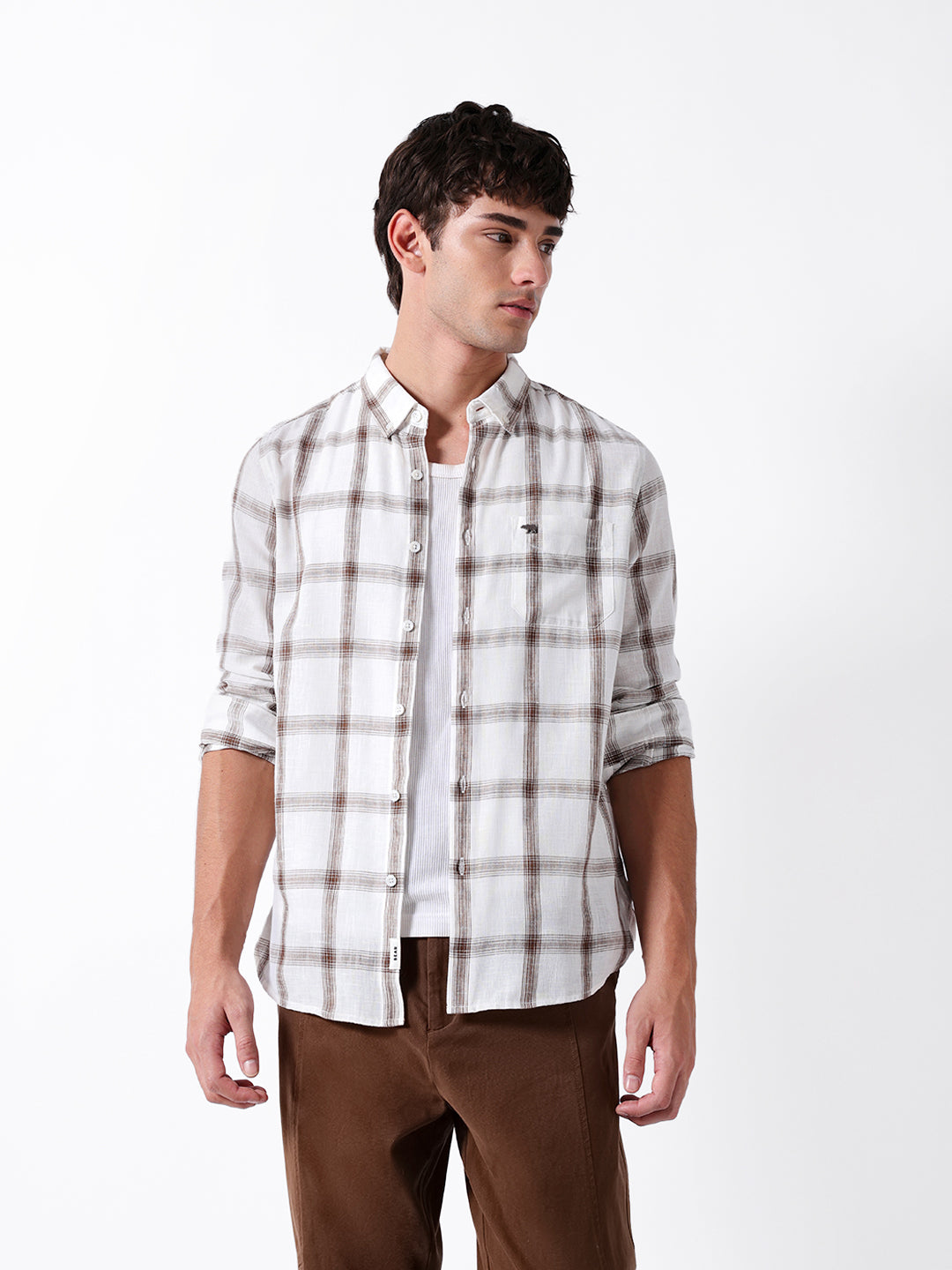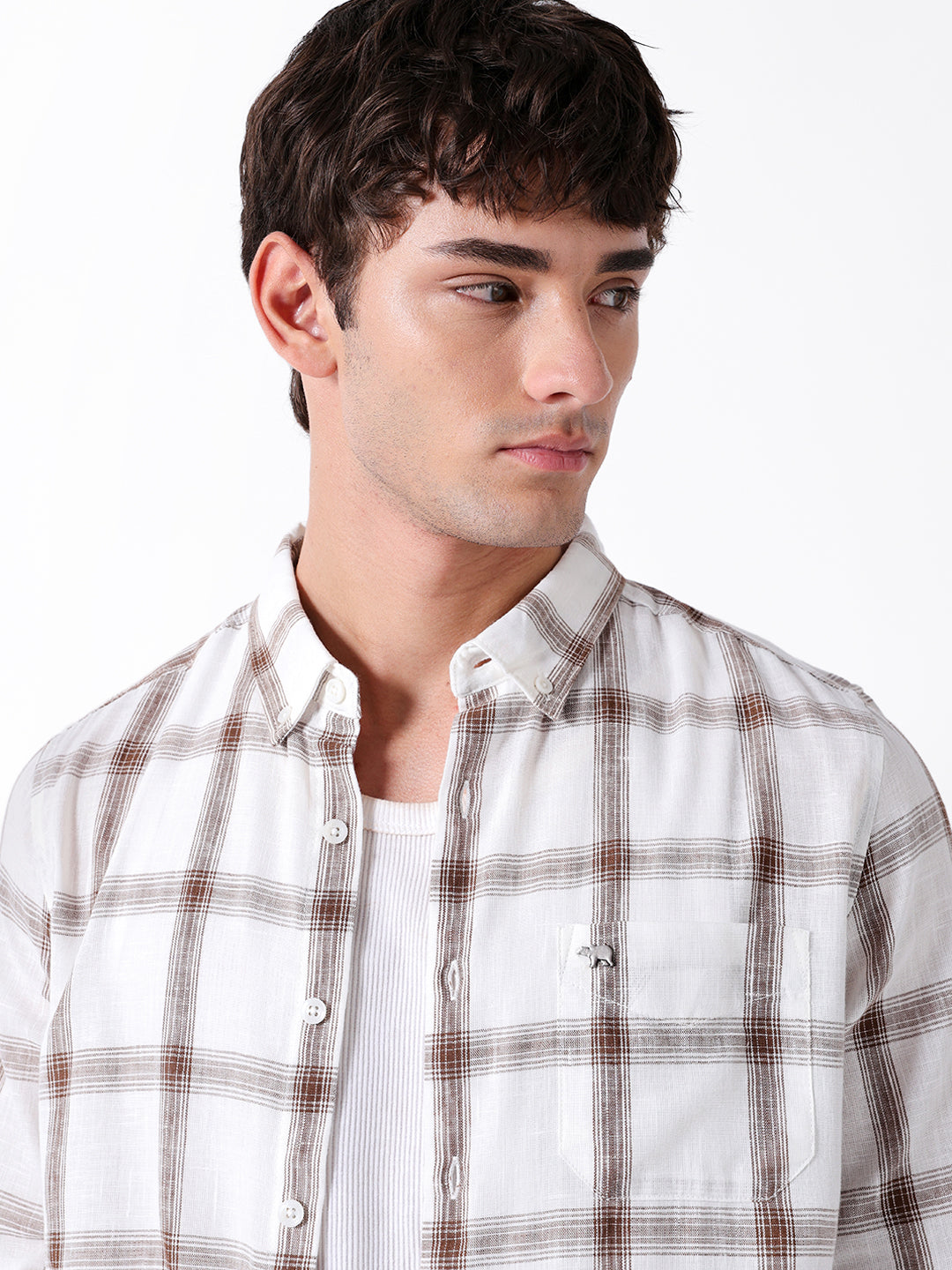 White & Brown Woven Checked Slim Fit Casual Shirt