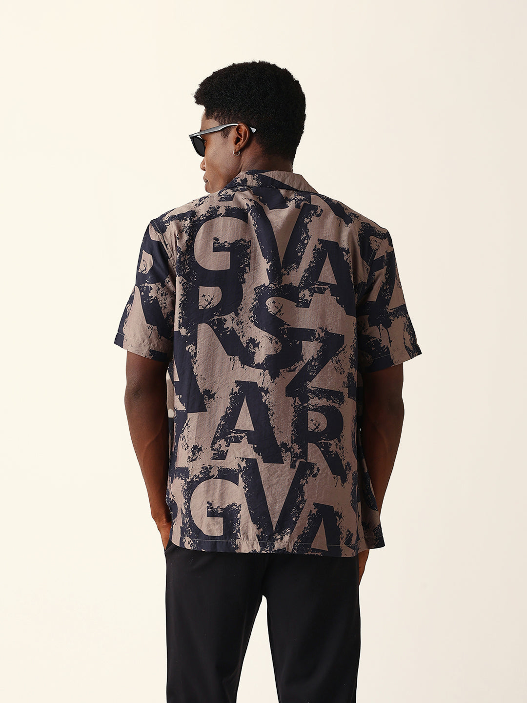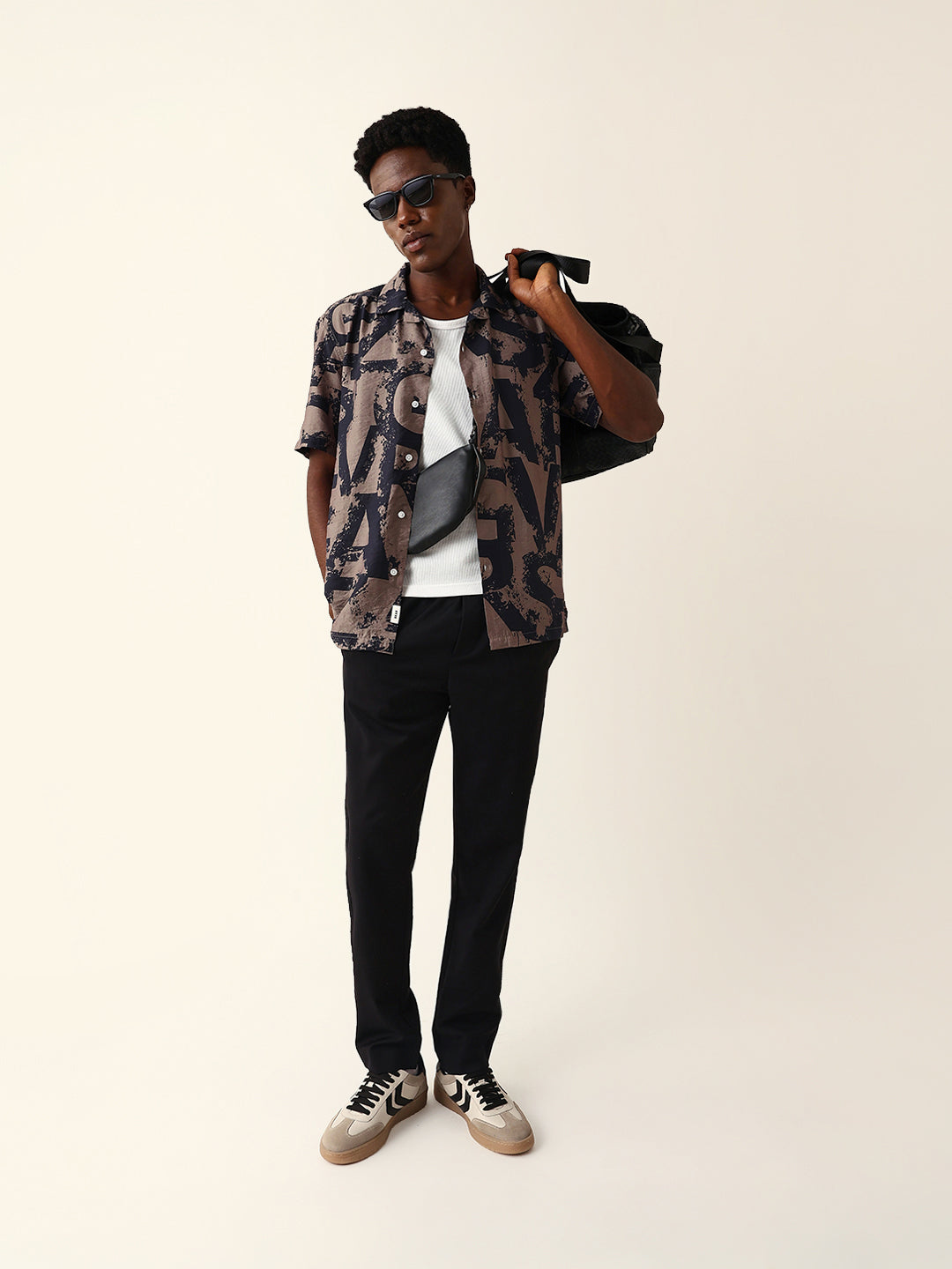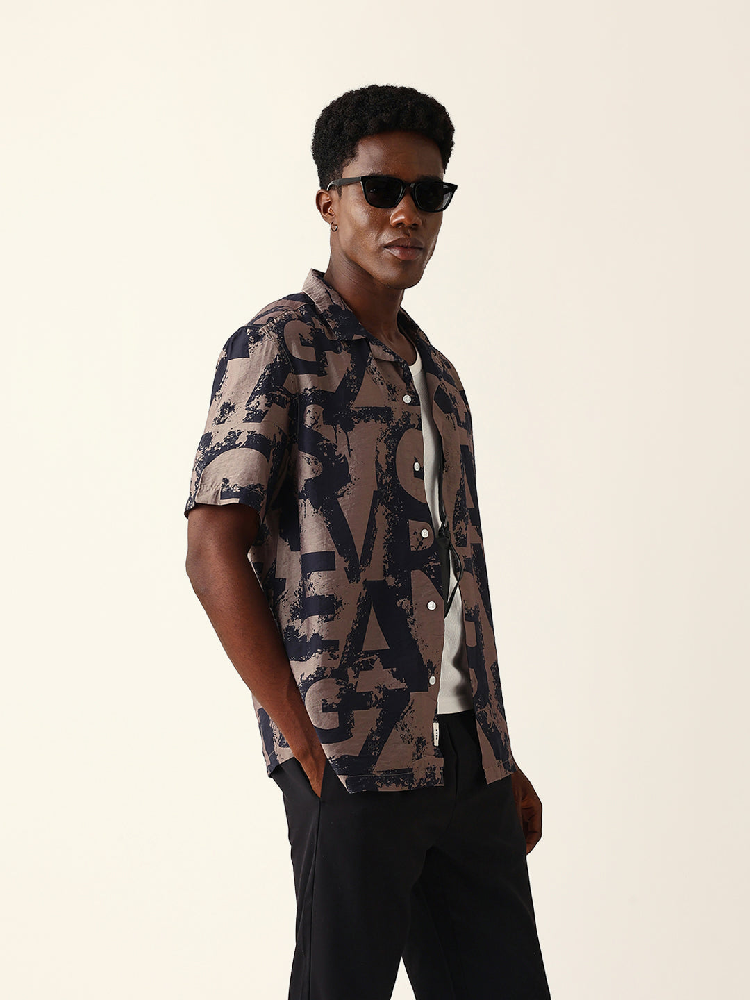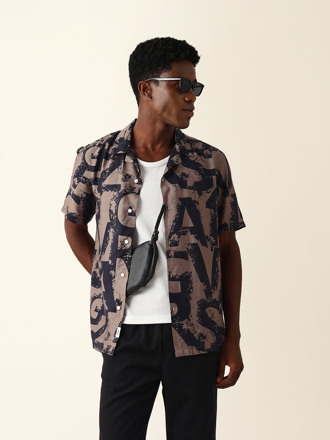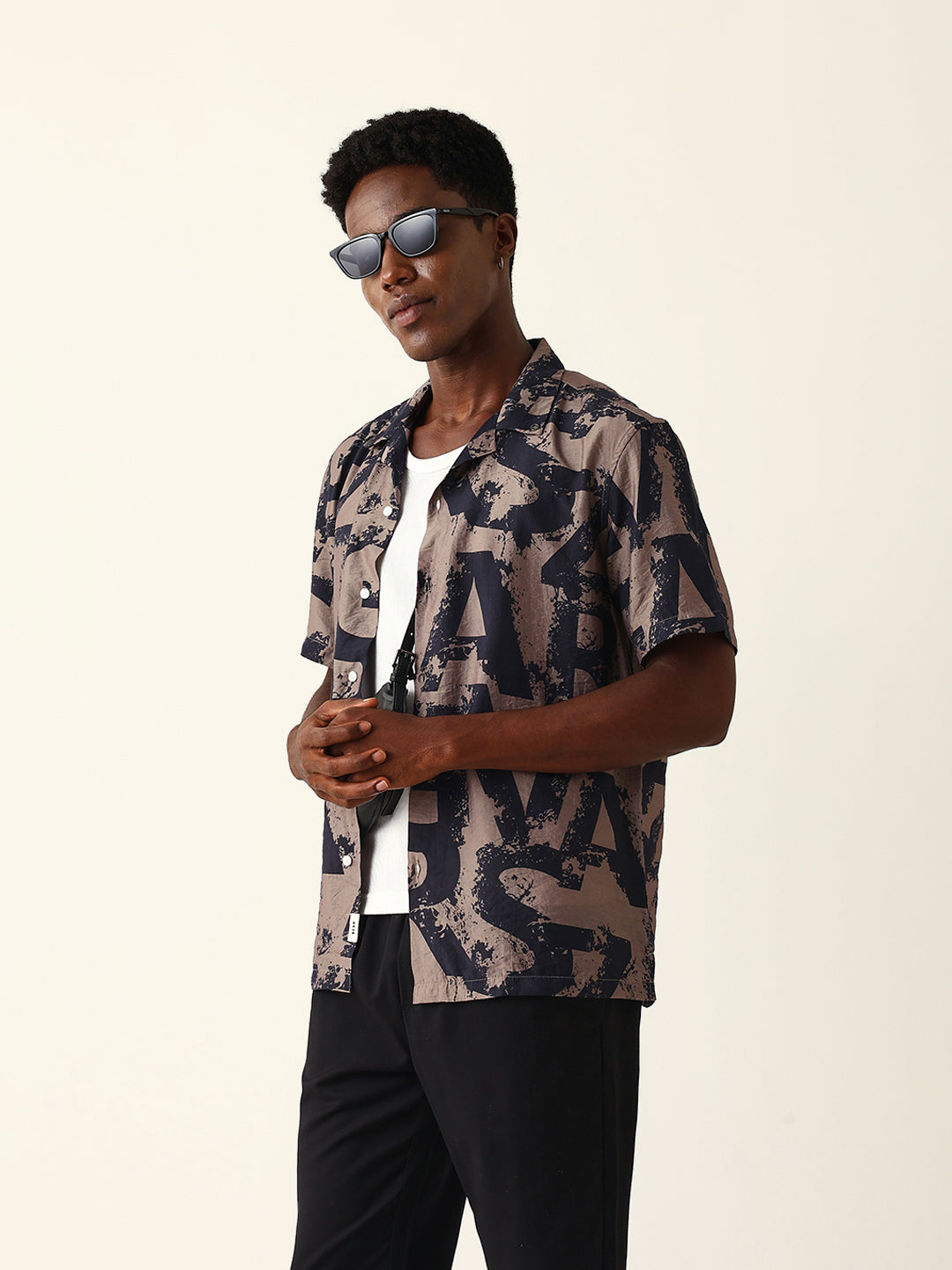 Shop Black & Brown Bold Typographic Print Cuban Collar Relaxed Fit Casual Shirt Online.