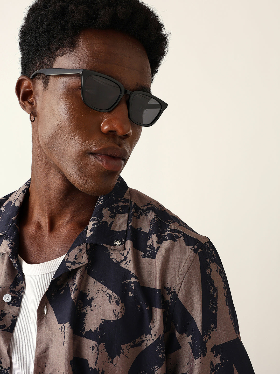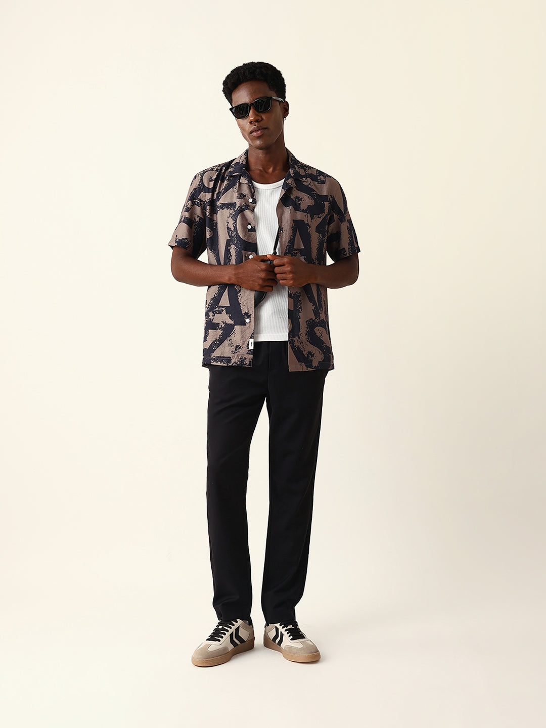 Black & Brown Bold Typographic Print Cuban Collar Relaxed Fit Casual Shirt