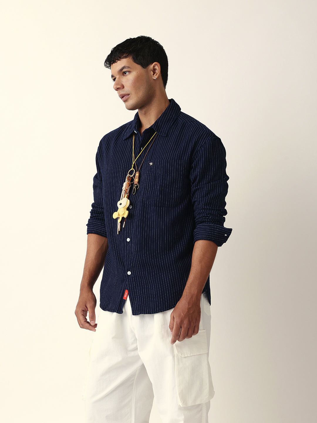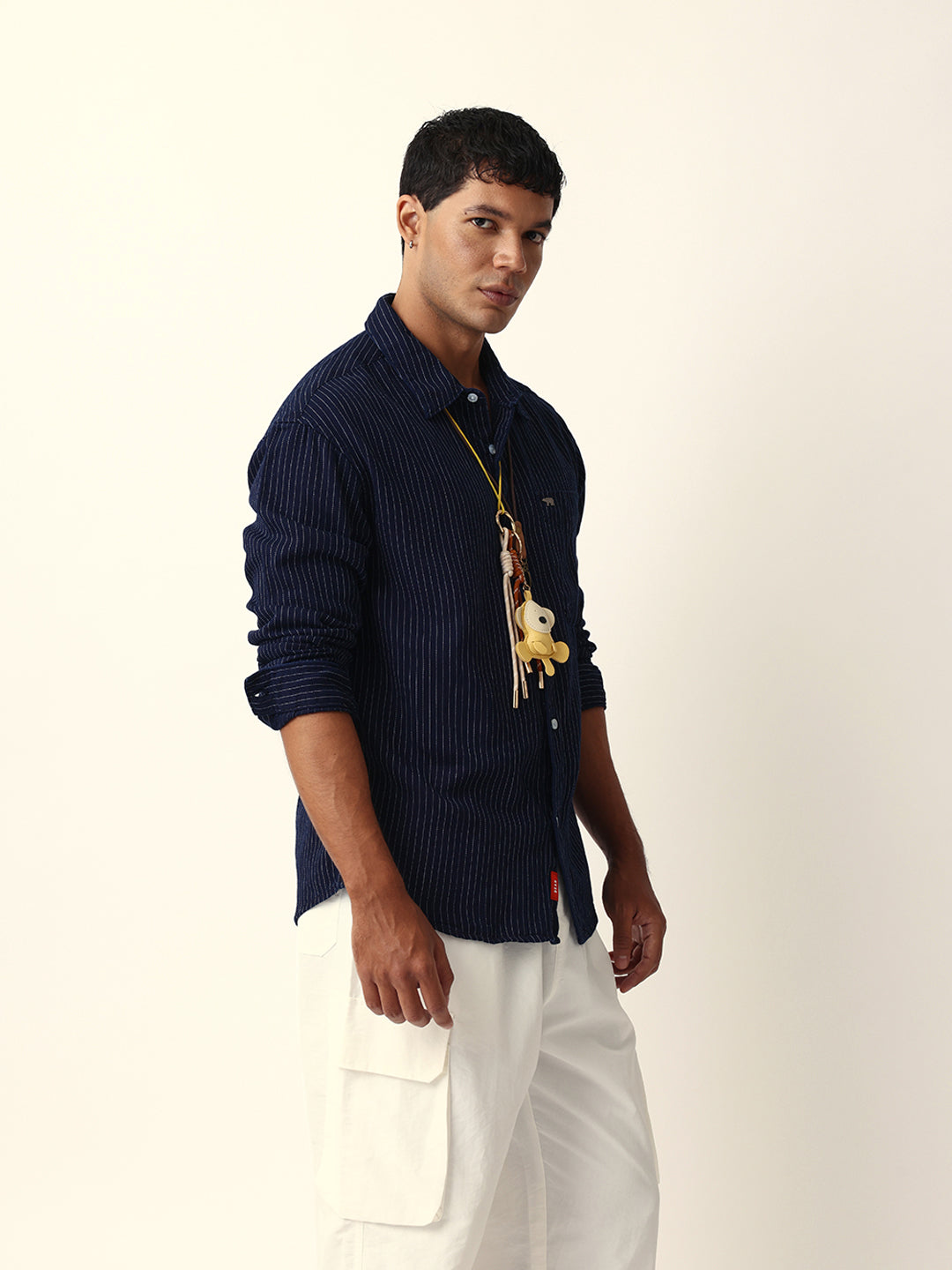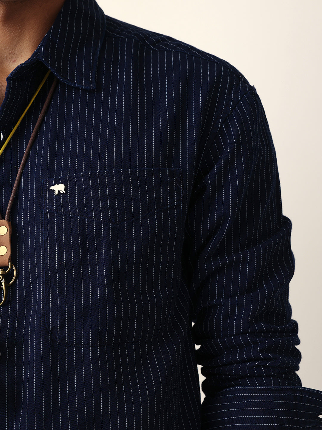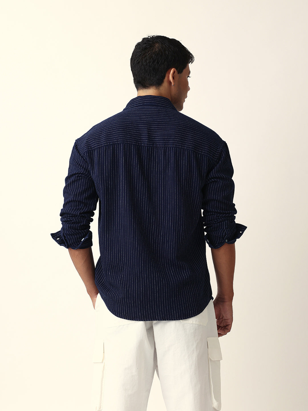Navy Blue Vertical Woven Pinstripes Relax Fit Overshirt