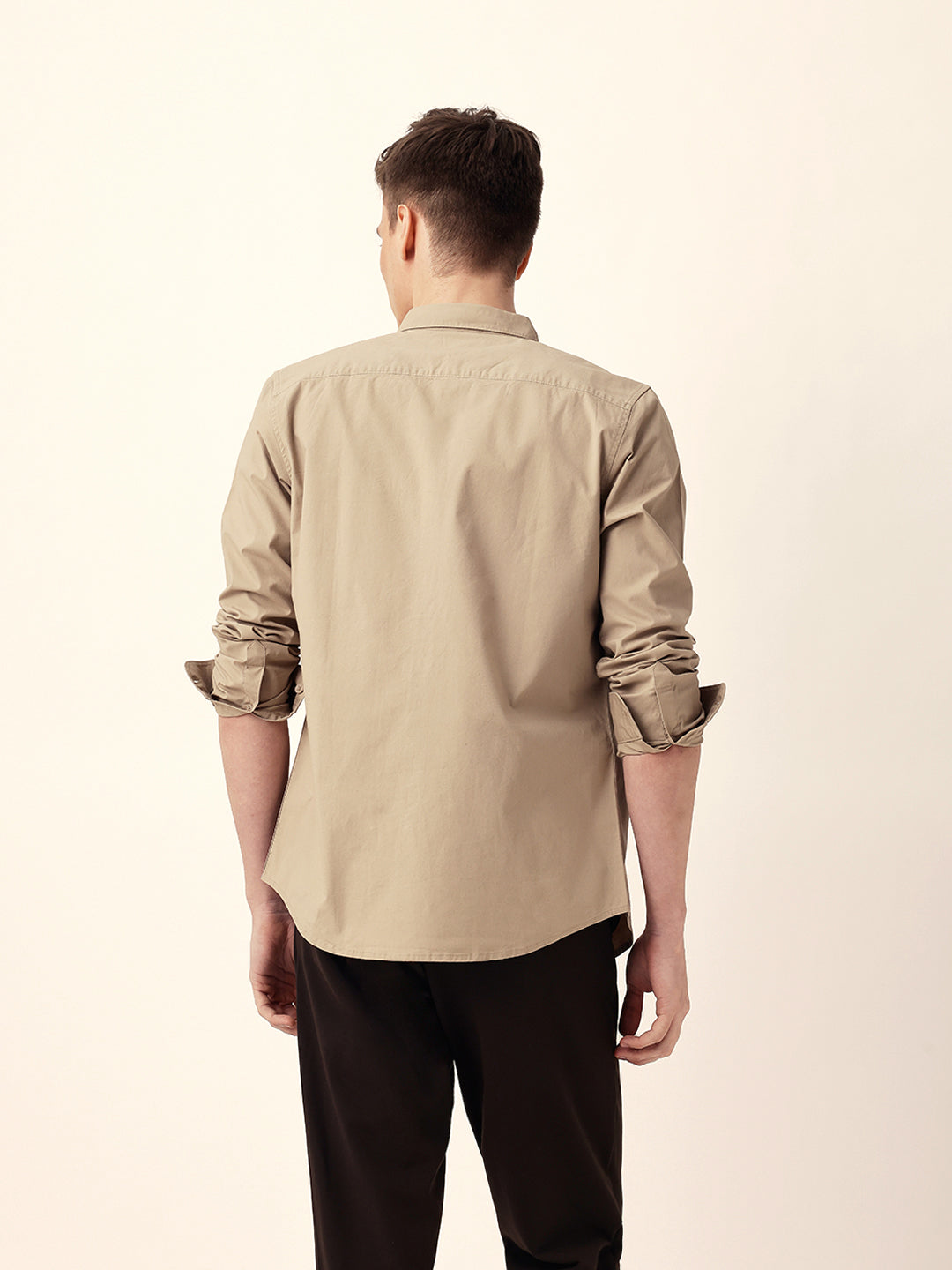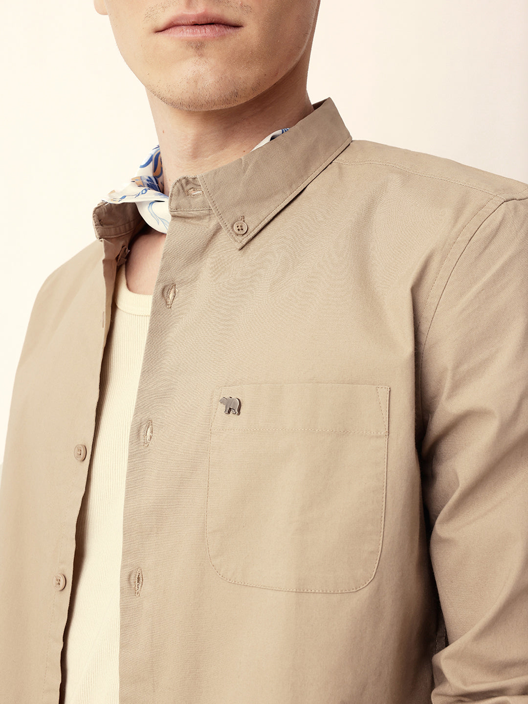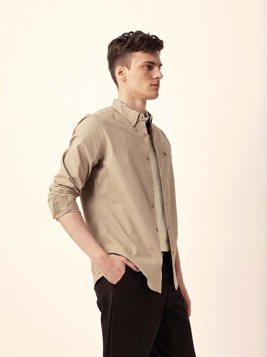 Beige Solid Slim Fit Casual Shirt with Button-Down Collar