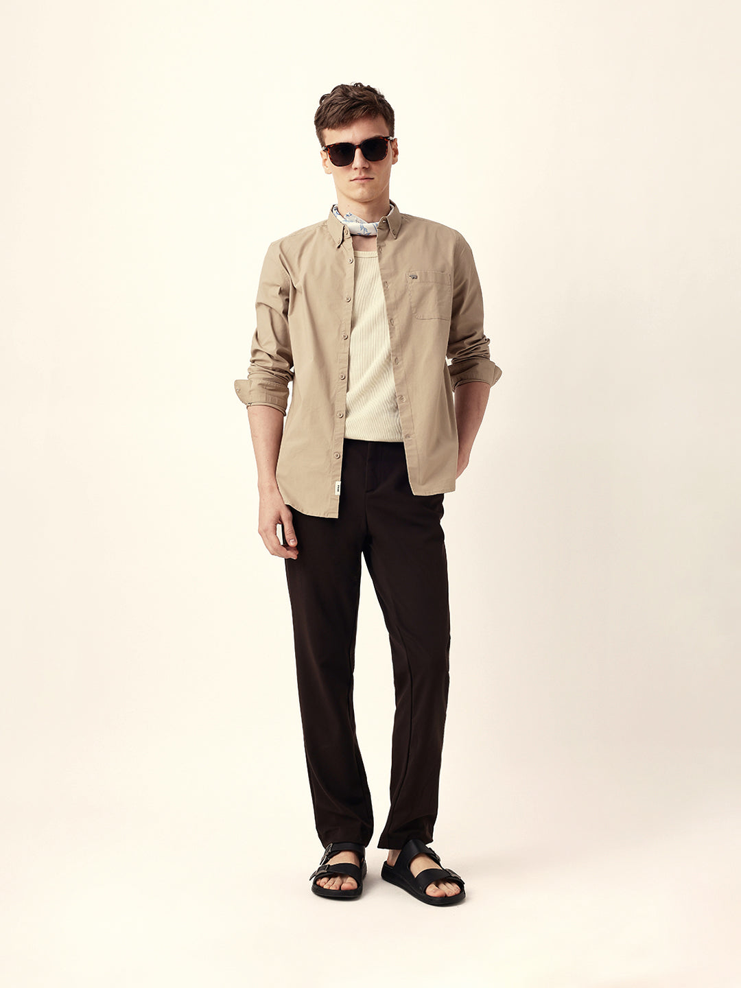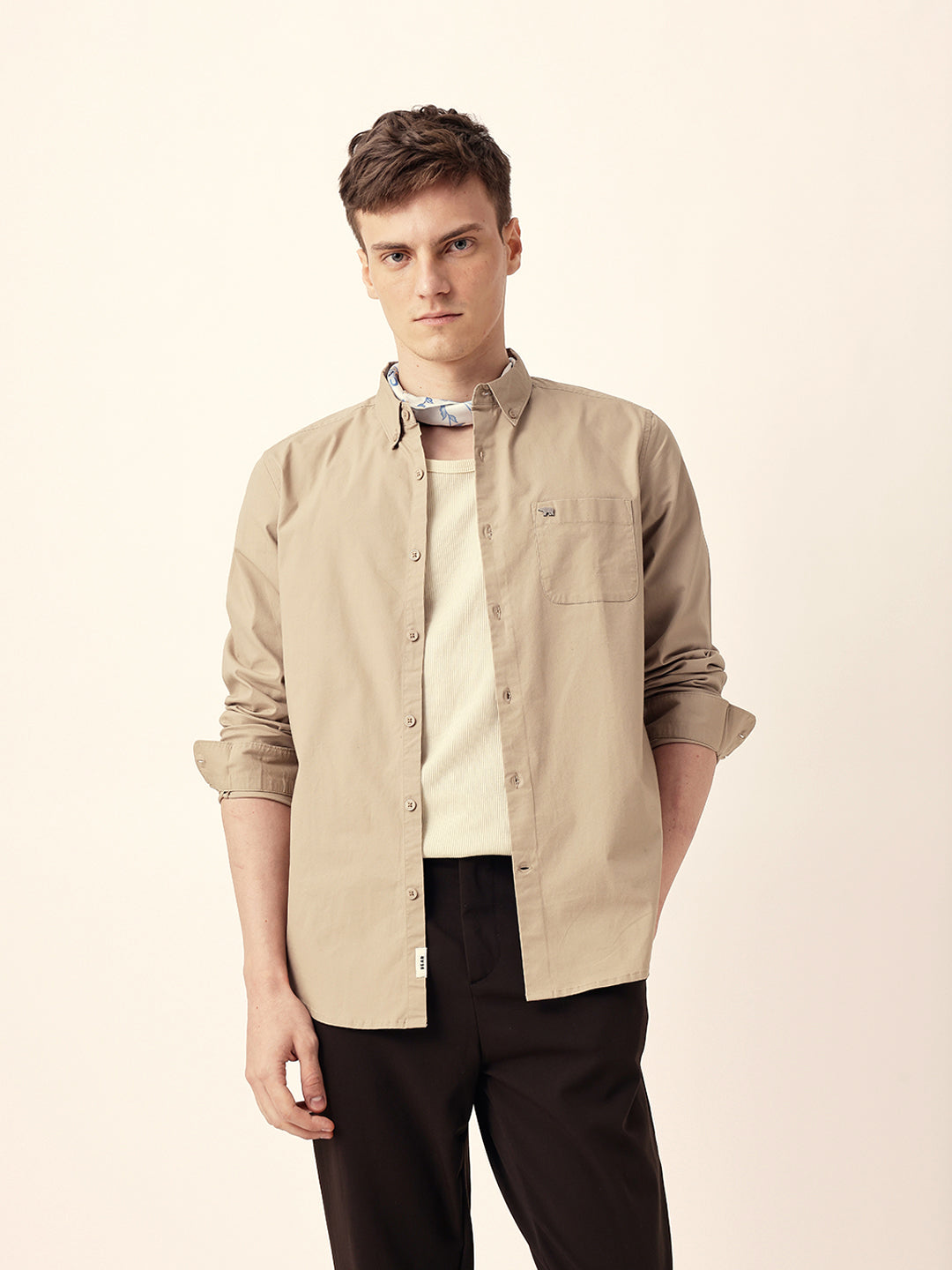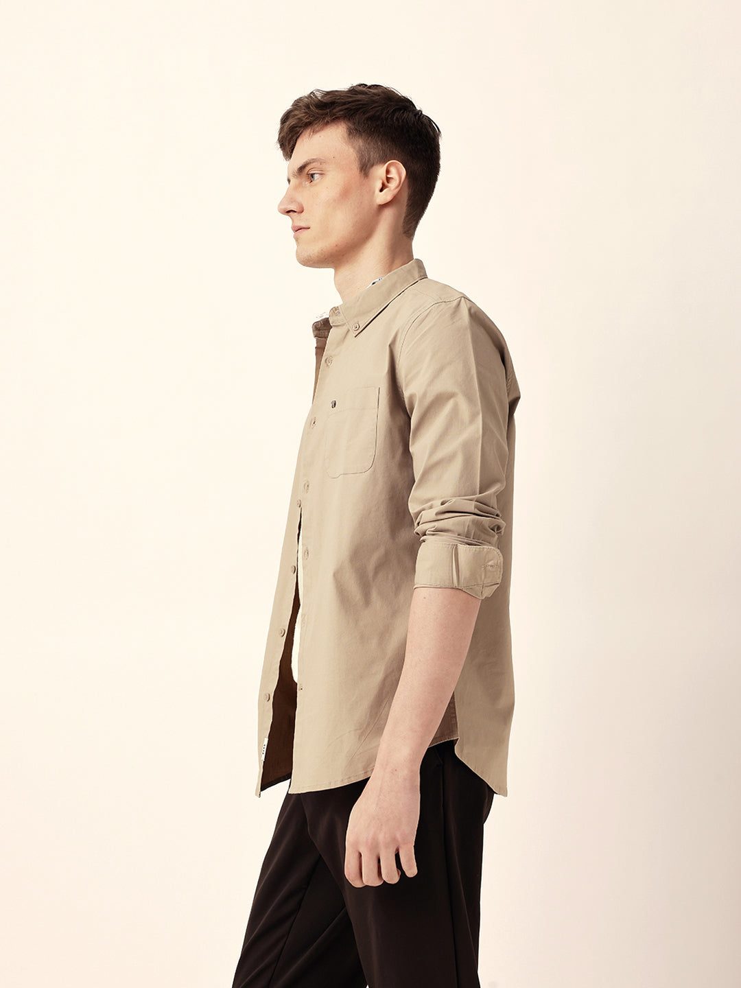 Beige Solid Slim Fit Casual Shirt with Button-Down Collar