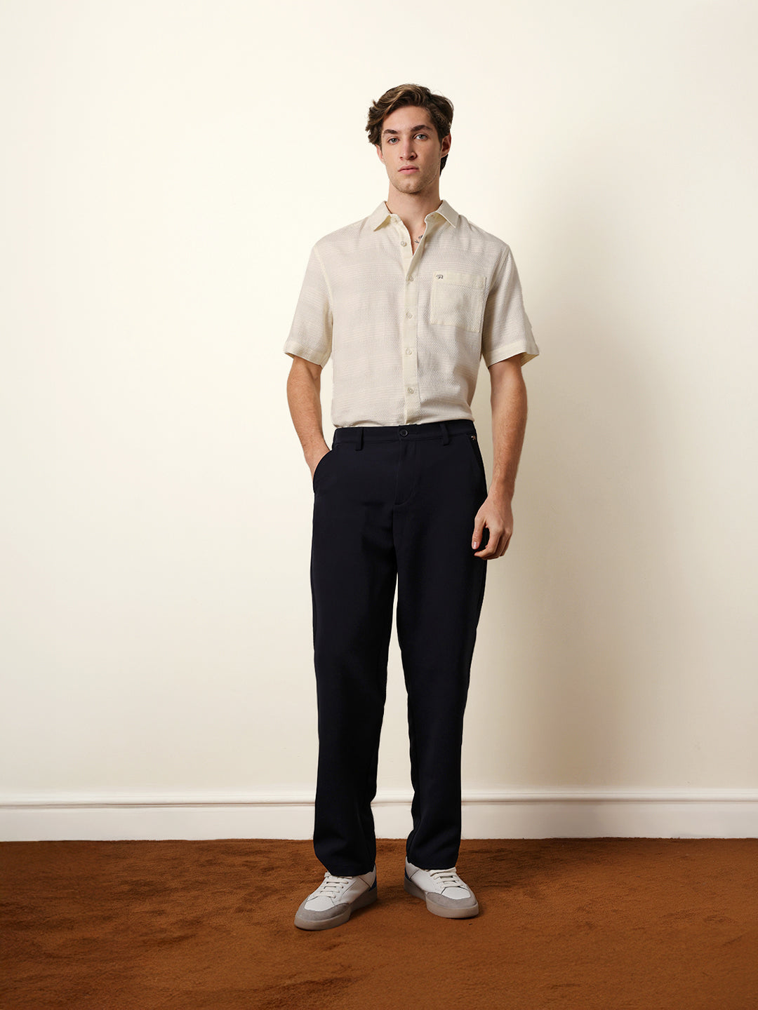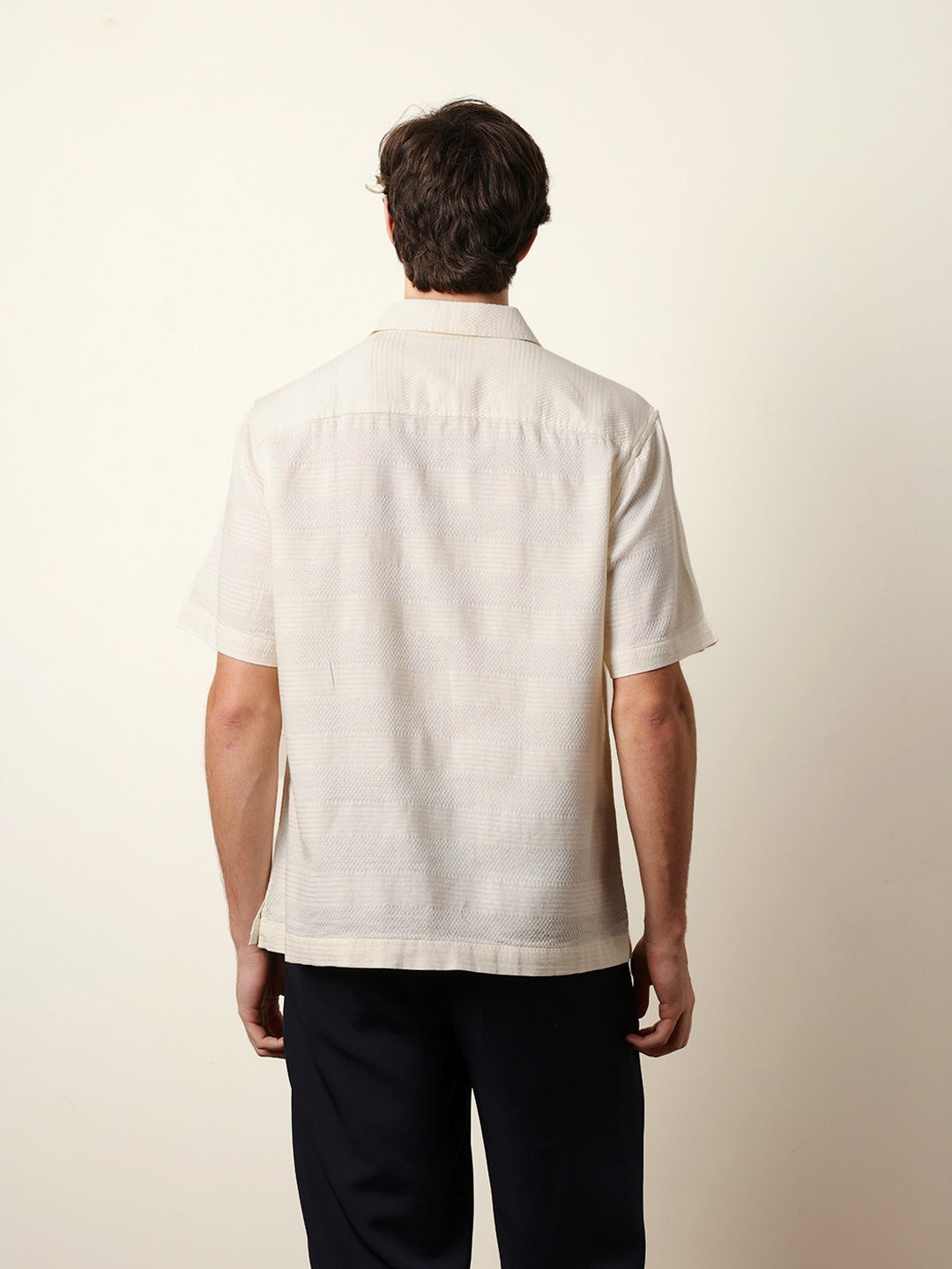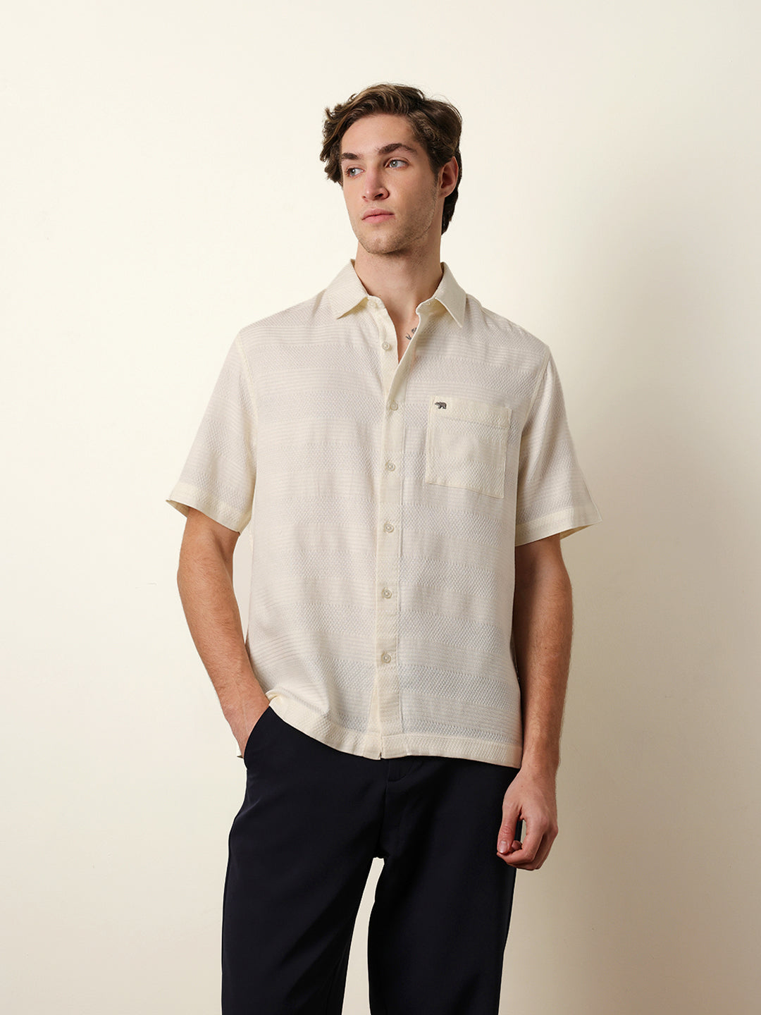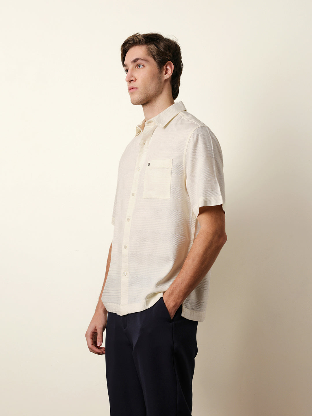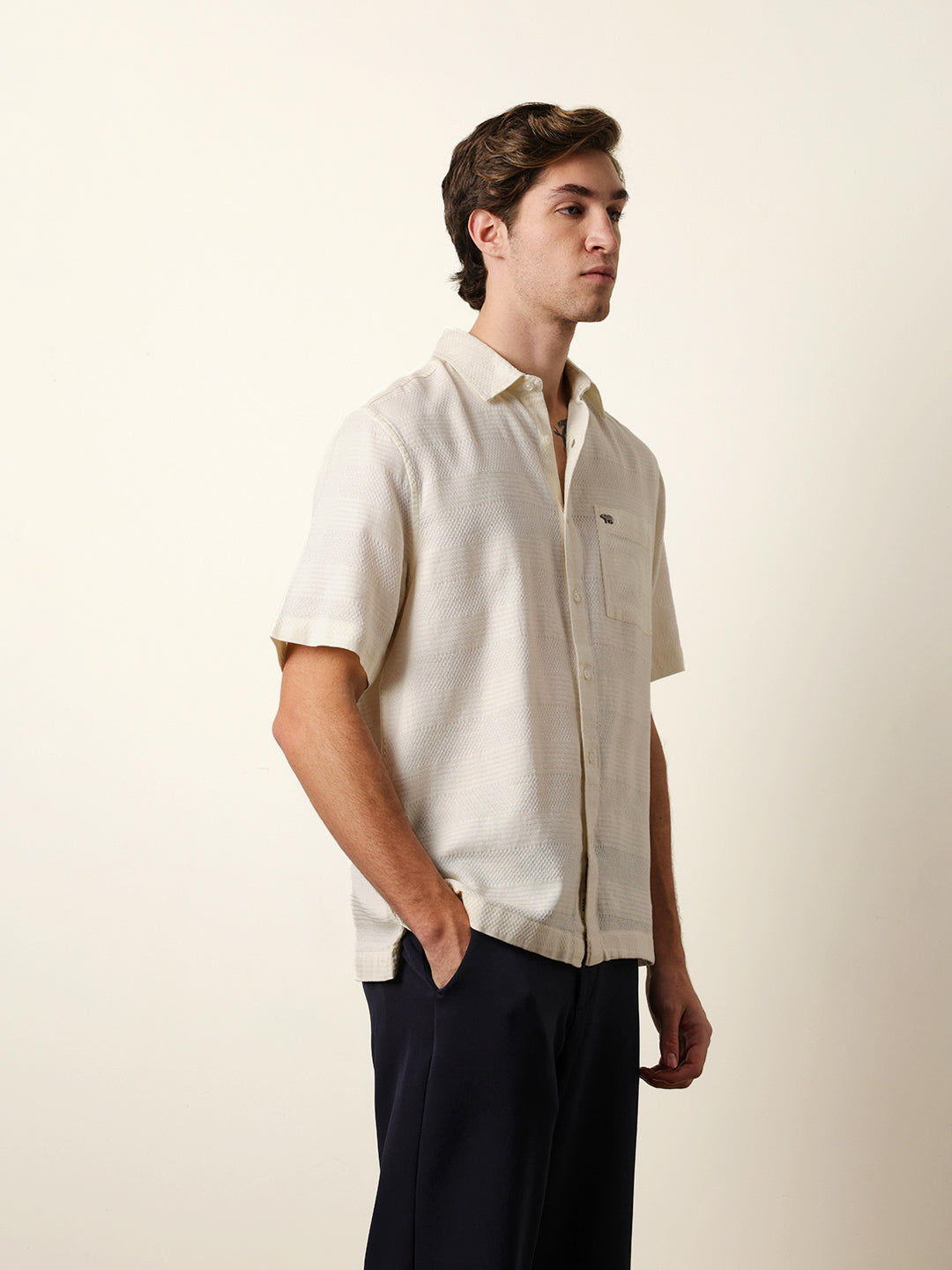 Shop Off-White Relaxed Fit Casual Half Sleeve Shirt with Textured Horizontal Stripes Online.