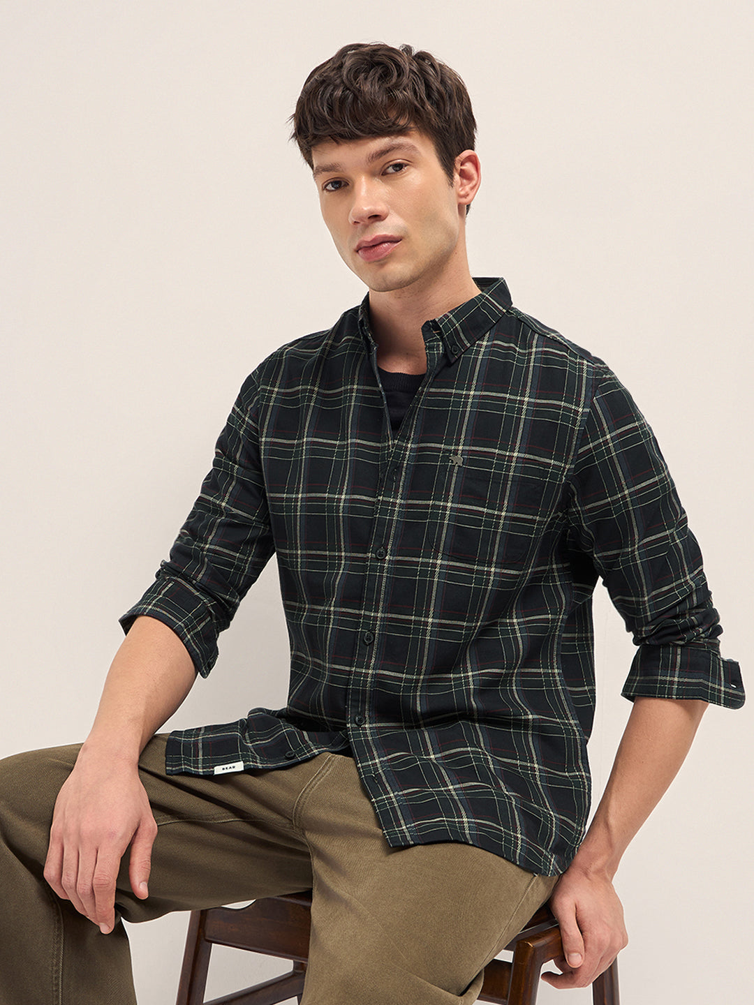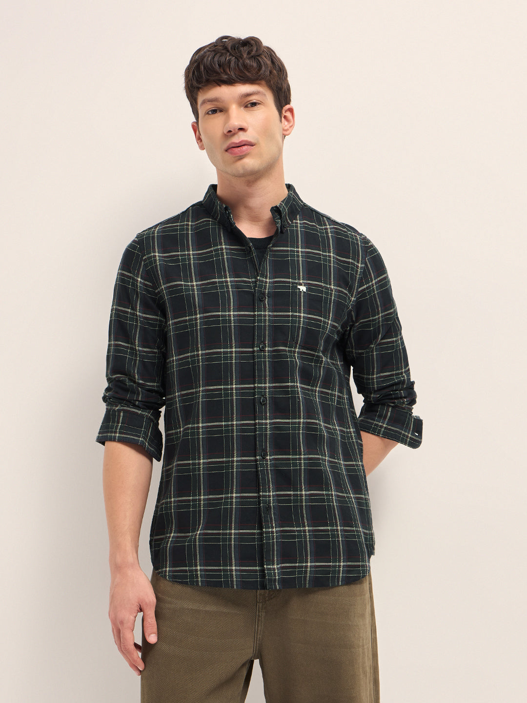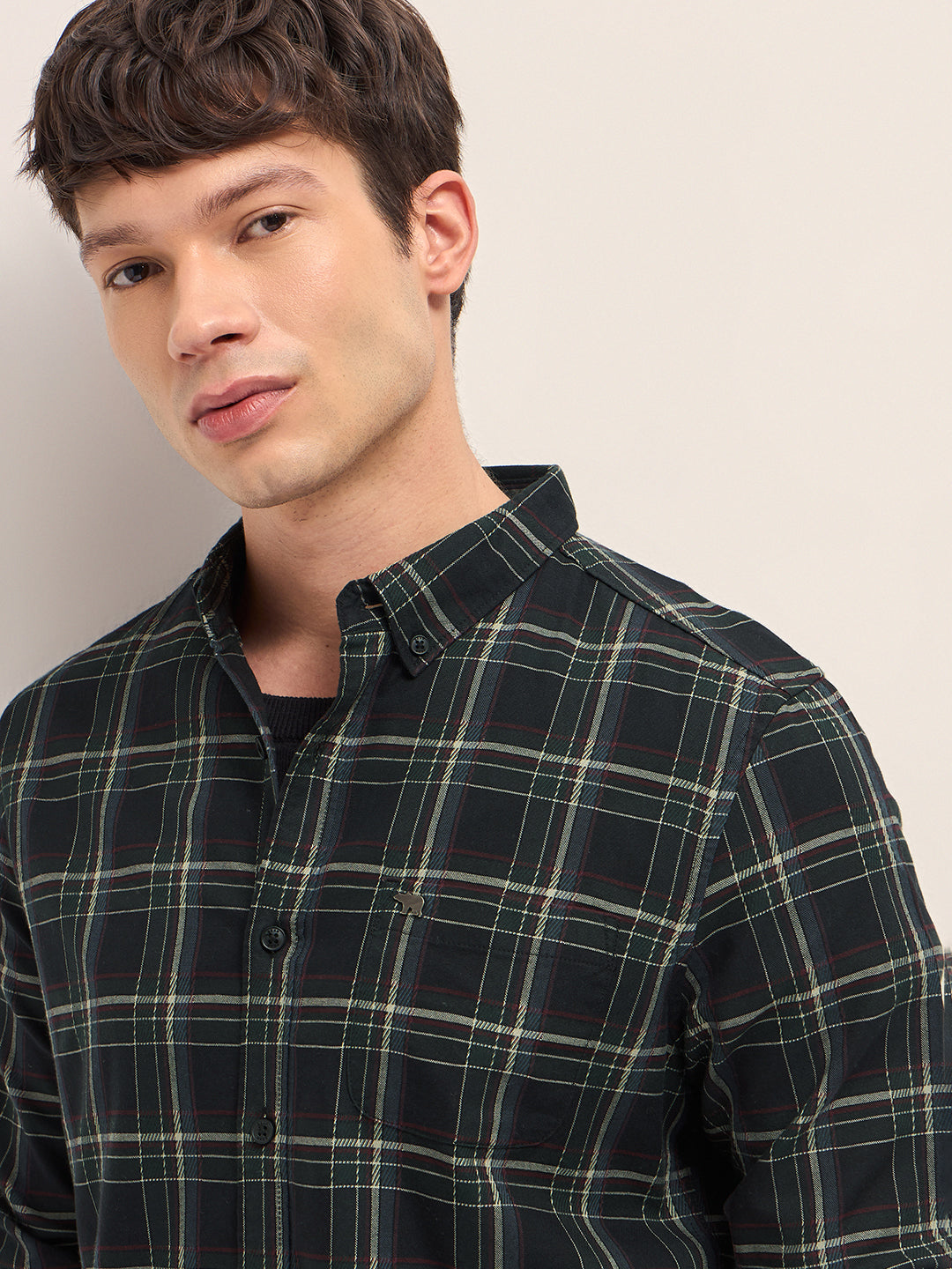 Black Woven Check Slim Fit Casual Shirt with Button-Down Collar