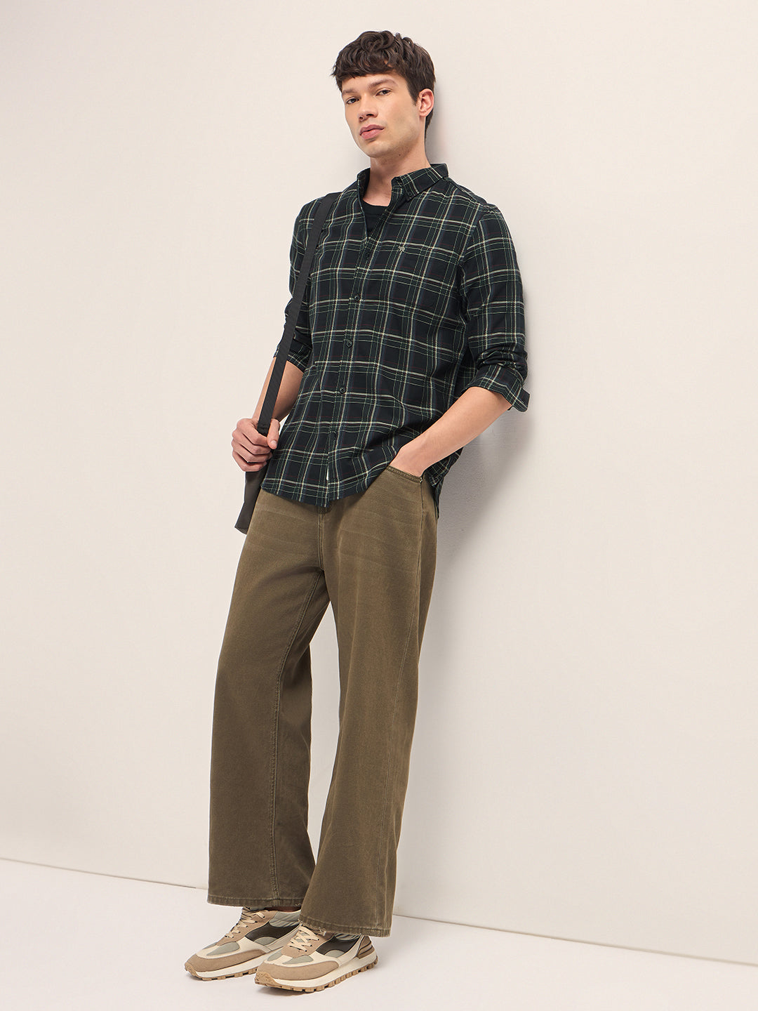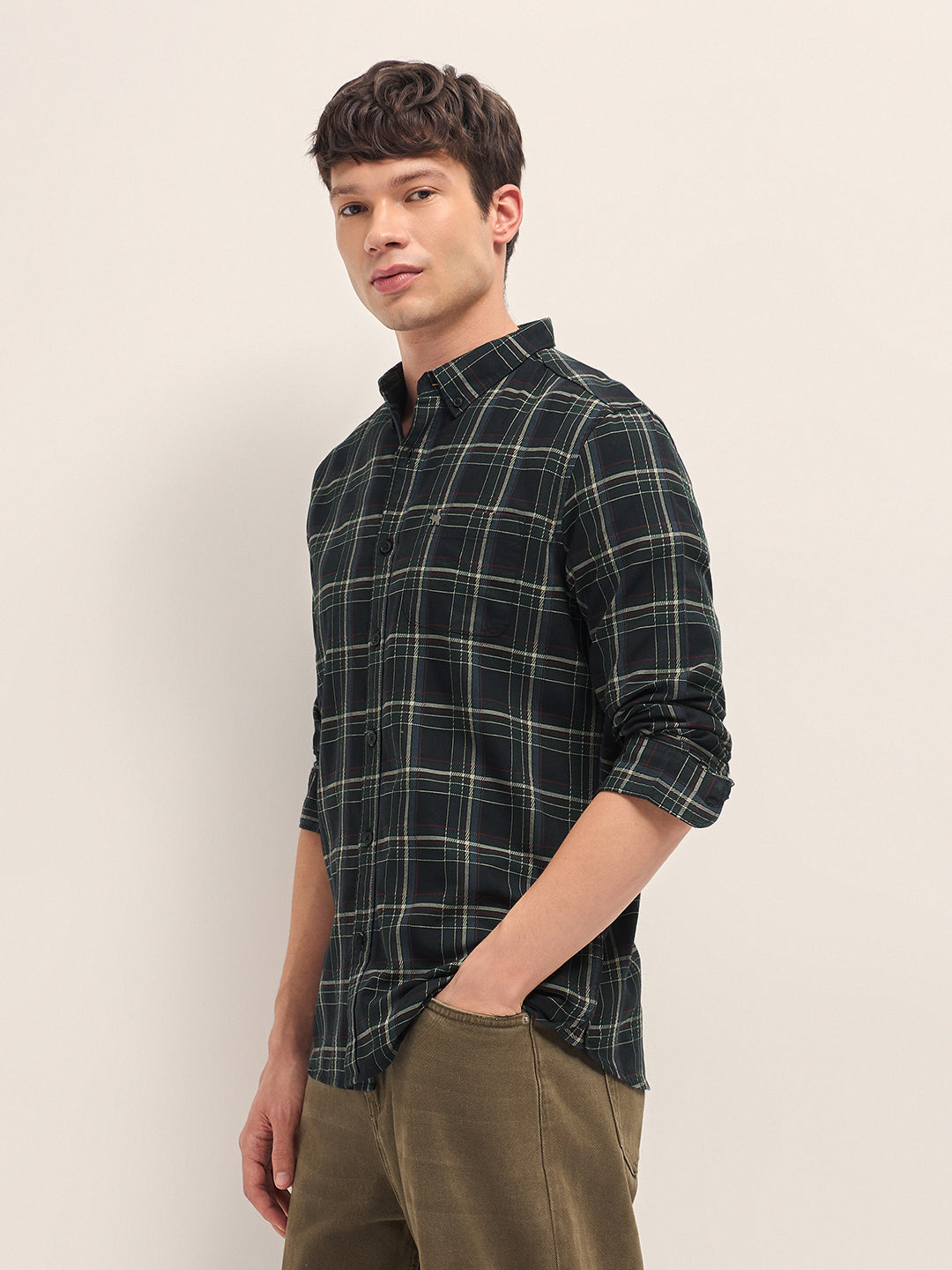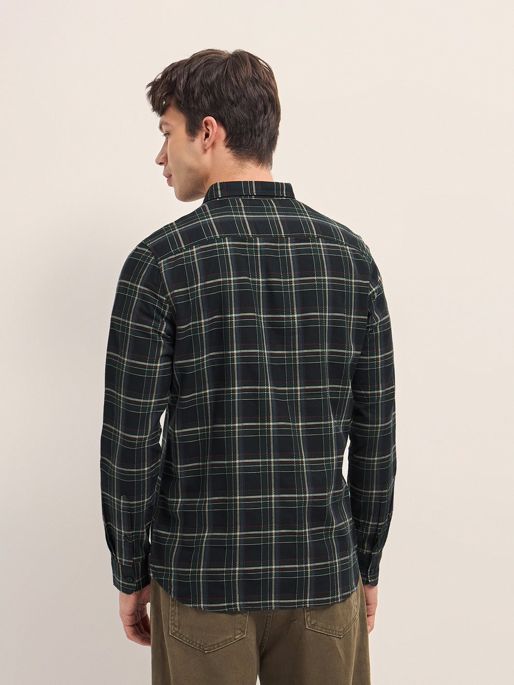 Shop Black Woven Check Slim Fit Casual Shirt with Button-Down Collar Online.